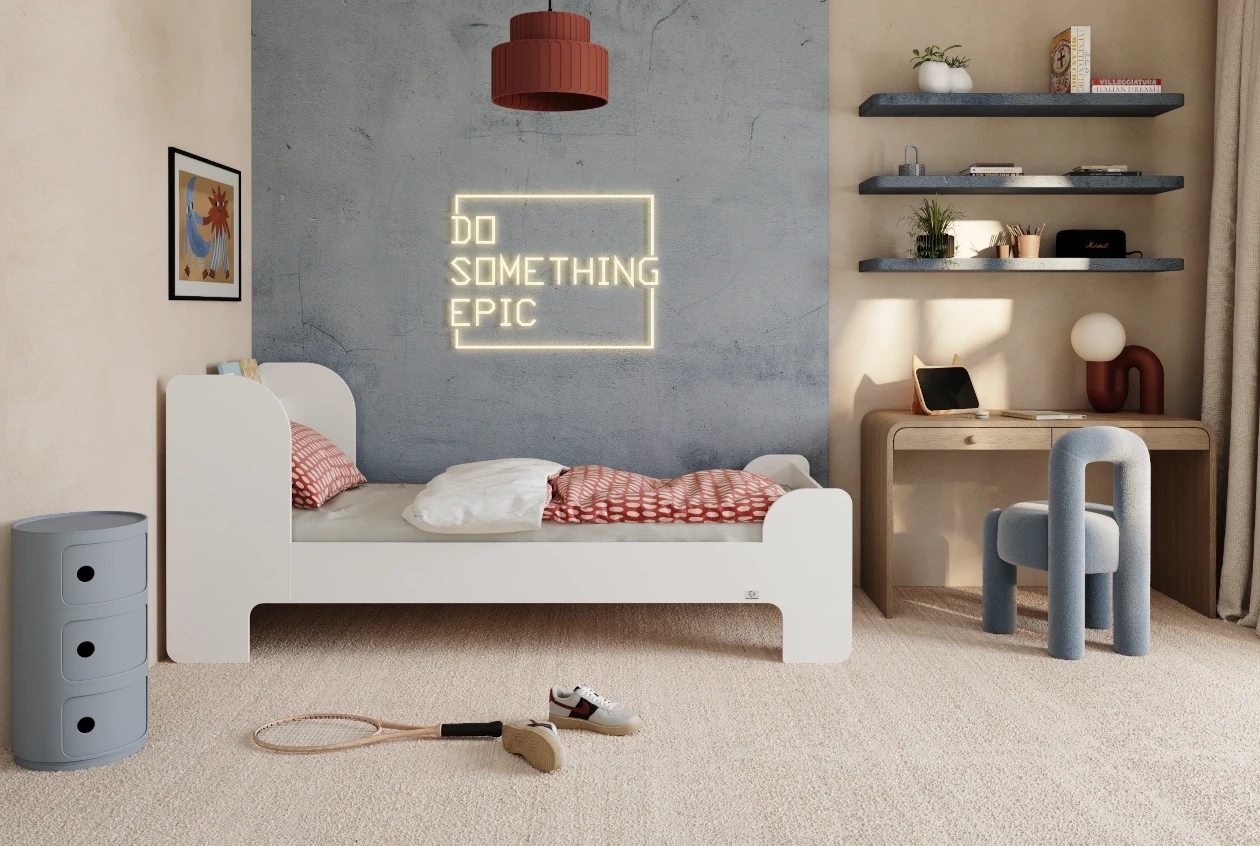 Marzysz o łóżku, które podkreśli styl Twojego nastolatka i zapewni mu maksimum bezpieczeństwa? Nasze pojedyncze łóżko łączy odważny, młodzieżowy design z wytrzymałą konstrukcją ze sklejki sosnowej. Stabilne, przyjazne w dotyku i łatwe w utrzymaniu – idealne miejsce na odpoczynek i codzienne wyzwania. Przekonaj się, jak niewiele potrzeba, by pokój zyskał nowy wymiar!