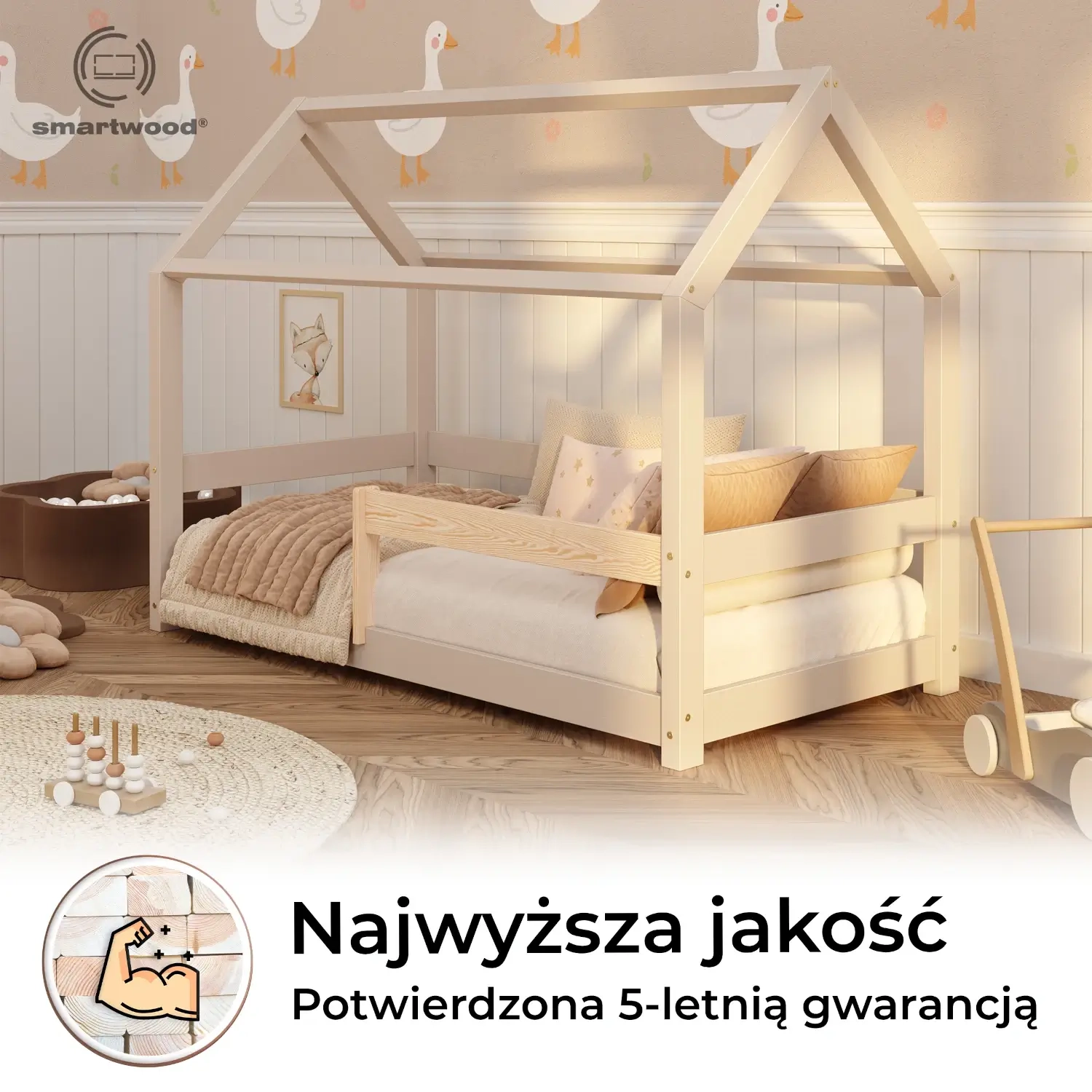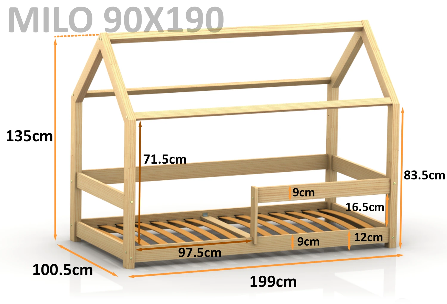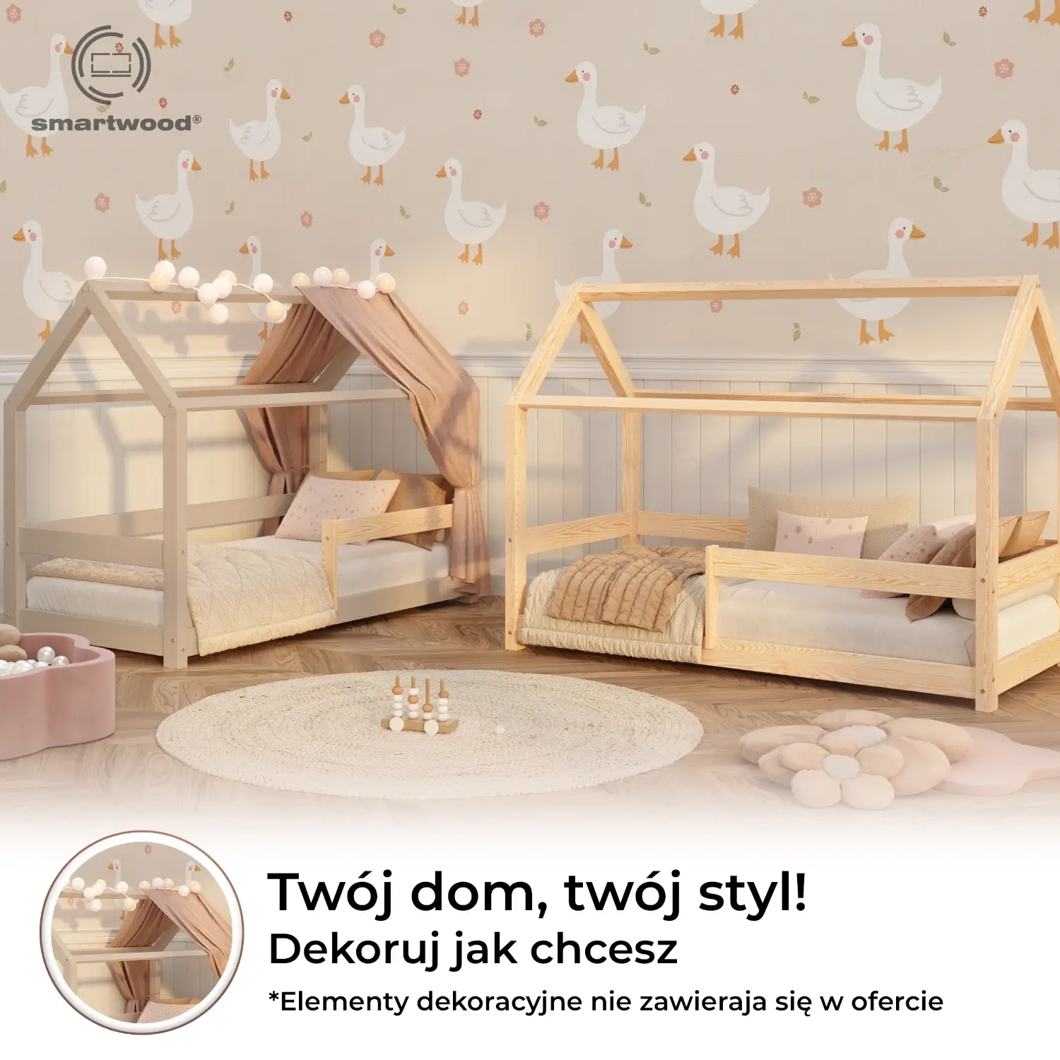 Łóżko domek dla dziecka z barierką i stelażem MILO Montessori Drewniane