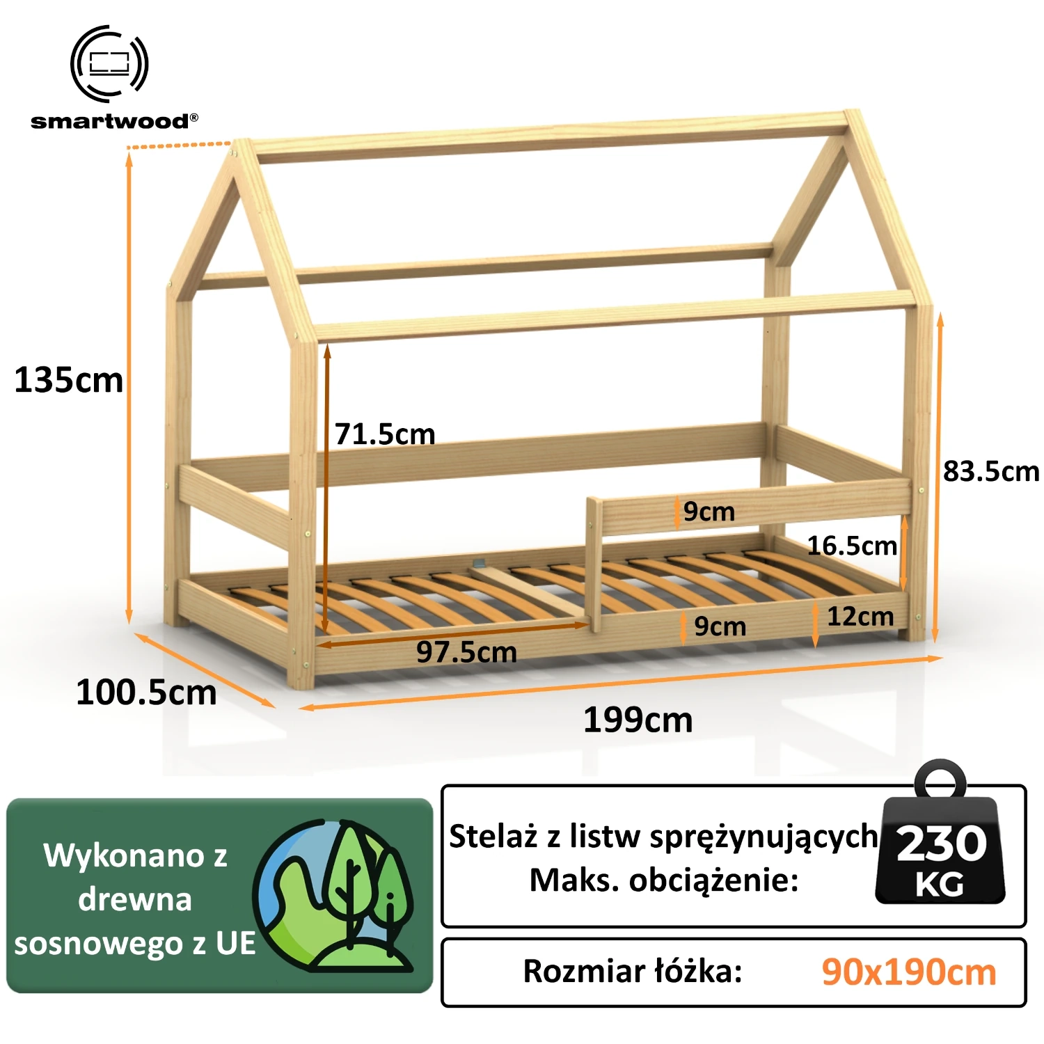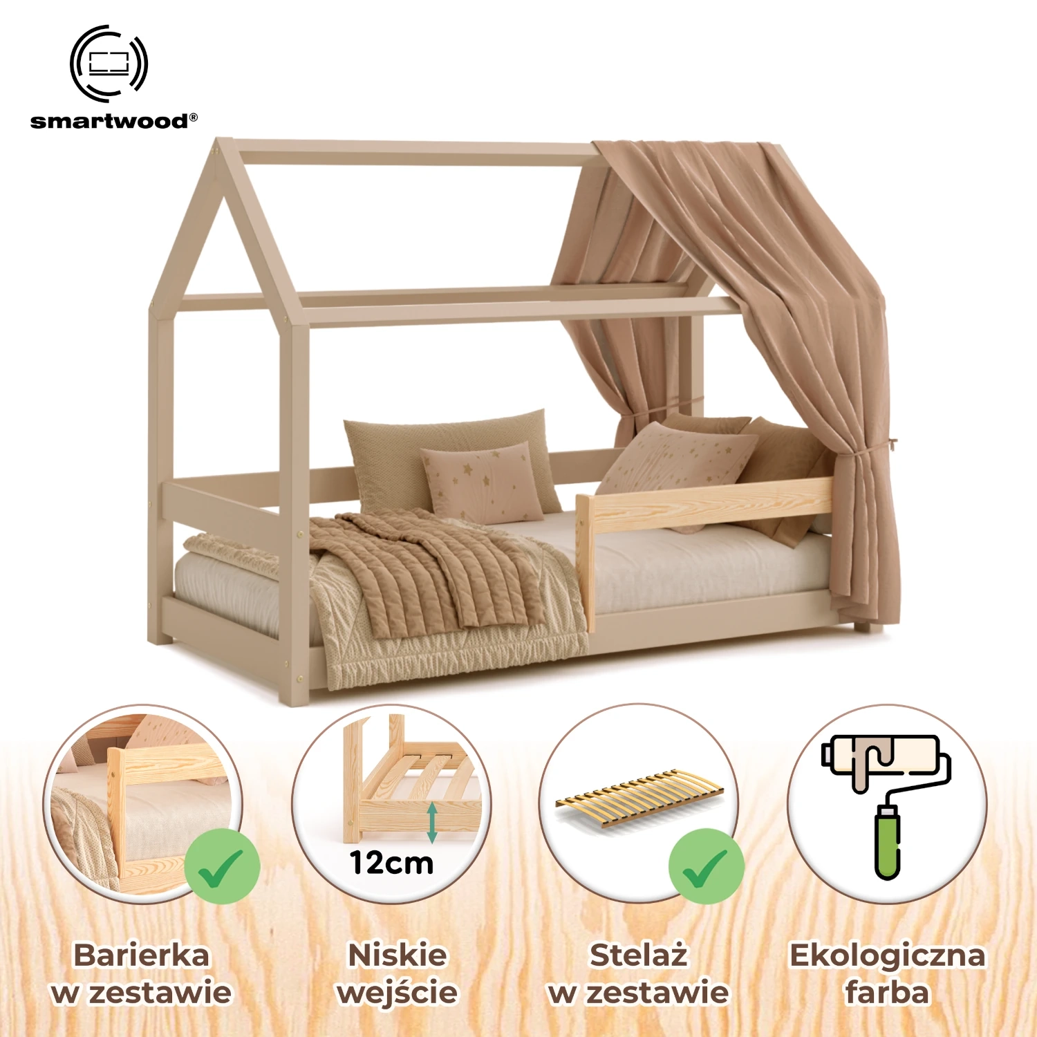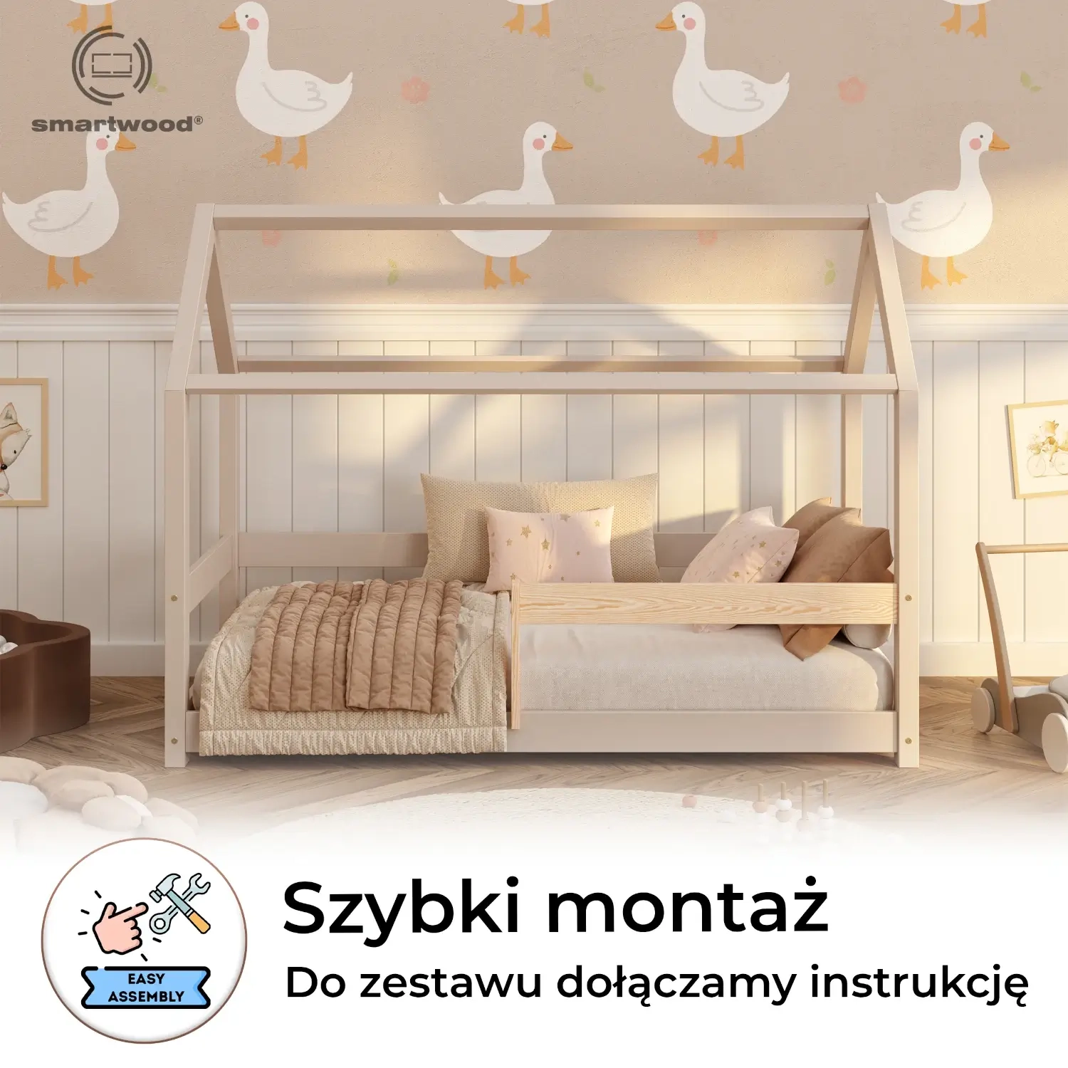 Łóżko domek dla dziecka z barierką i stelażem MILO Montessori Drewniane