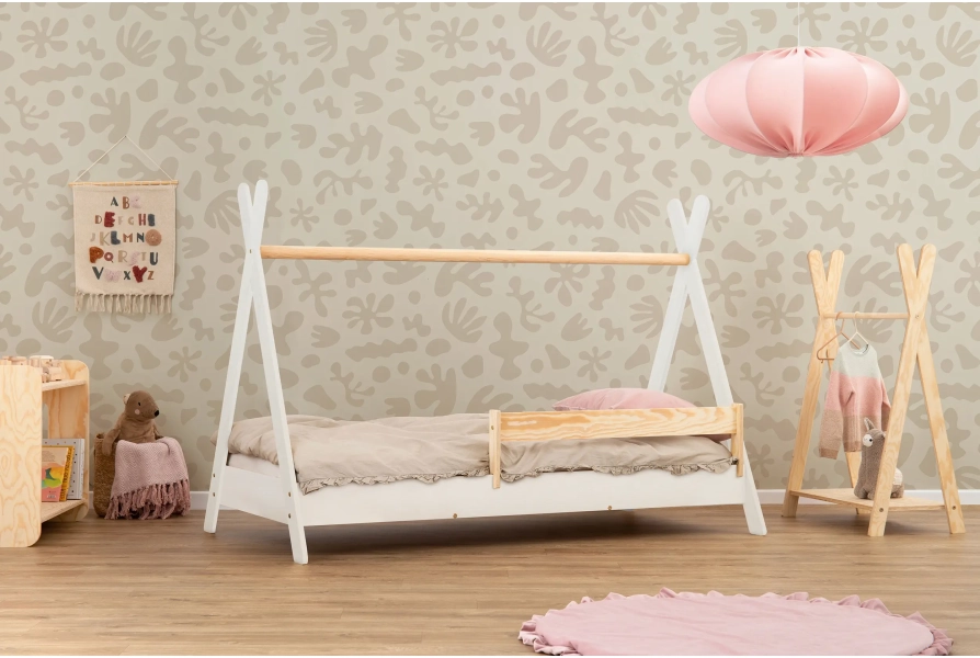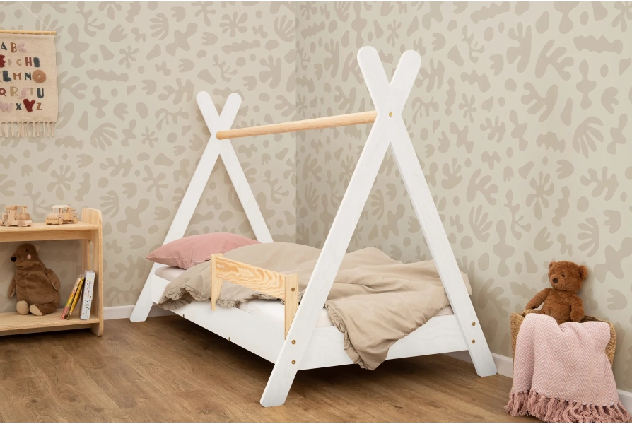 ✔ Niepowtarzalny design – kształt tipi z drążkiem łączącym nogi daje możliwość personalizacji łóżka. Dodaj baldachim, światełka czy inne dekoracje, by stworzyć przytulny i magiczny kącik dla Twojego dziecka (elementy dekoracyjne nie są częścią oferty).