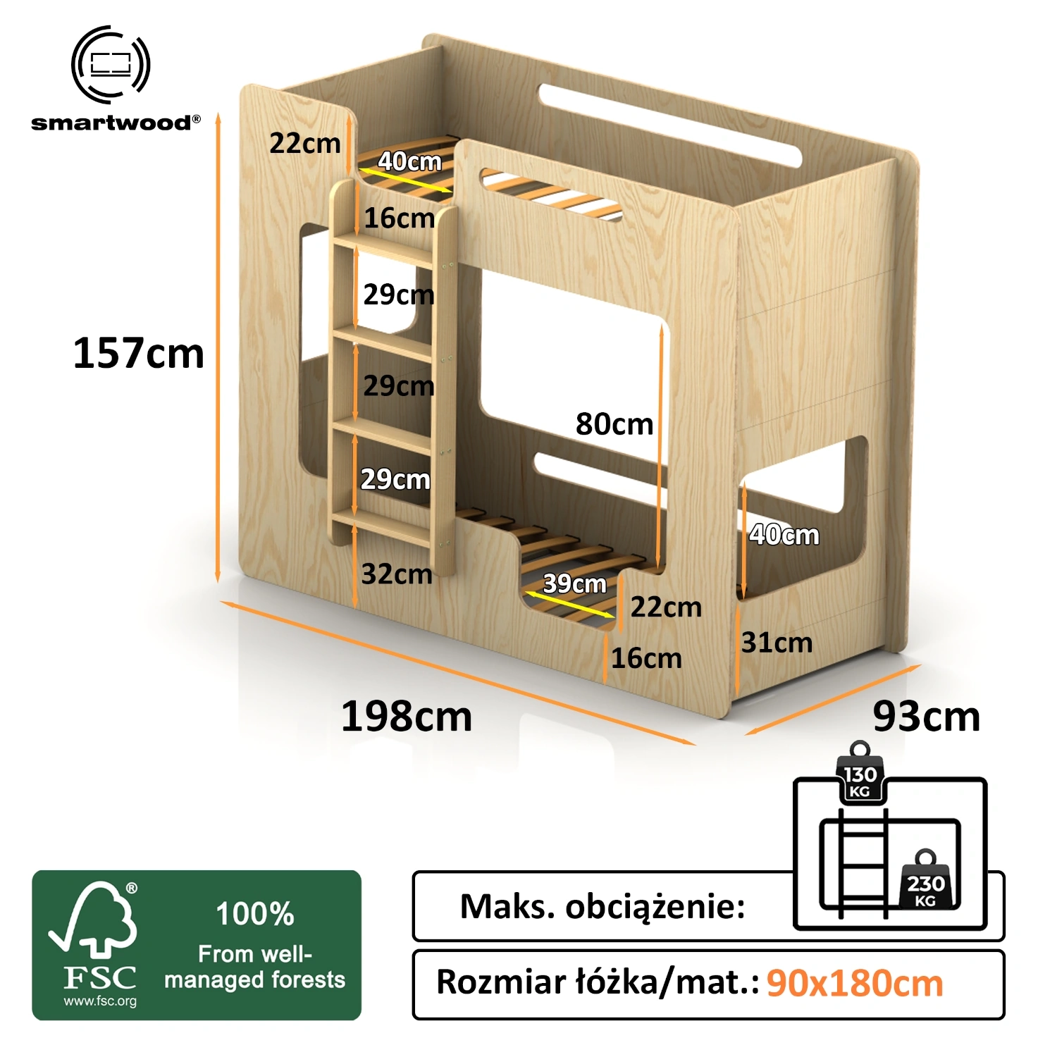 ✔ Wytrzymałość dostosowana do potrzeb – dolne łóżko z nośnością do 230 kg idealnie sprawdzi się dla aktywnych maluchów, podczas gdy górne z obciążeniem do 130 kg oferuje stabilność i ochronę podczas snu.