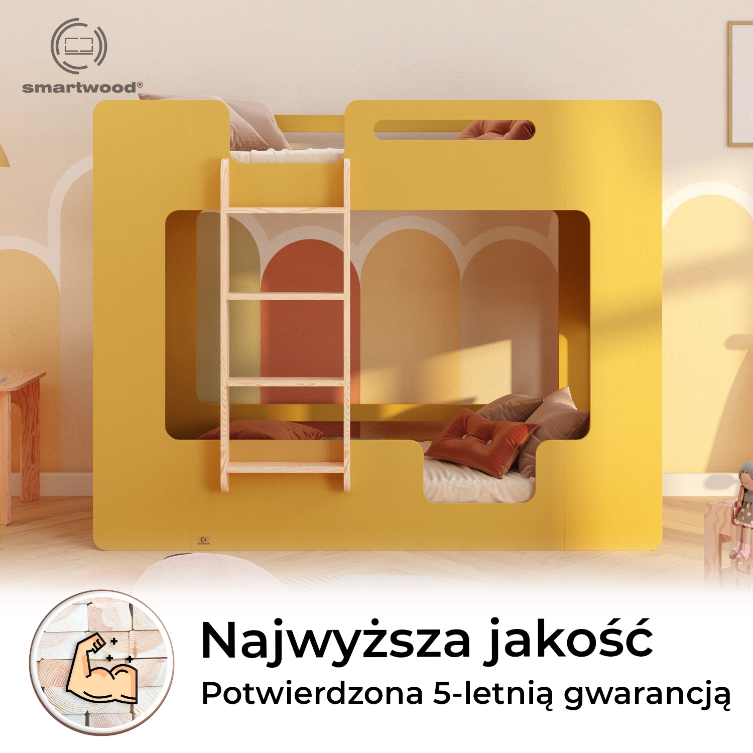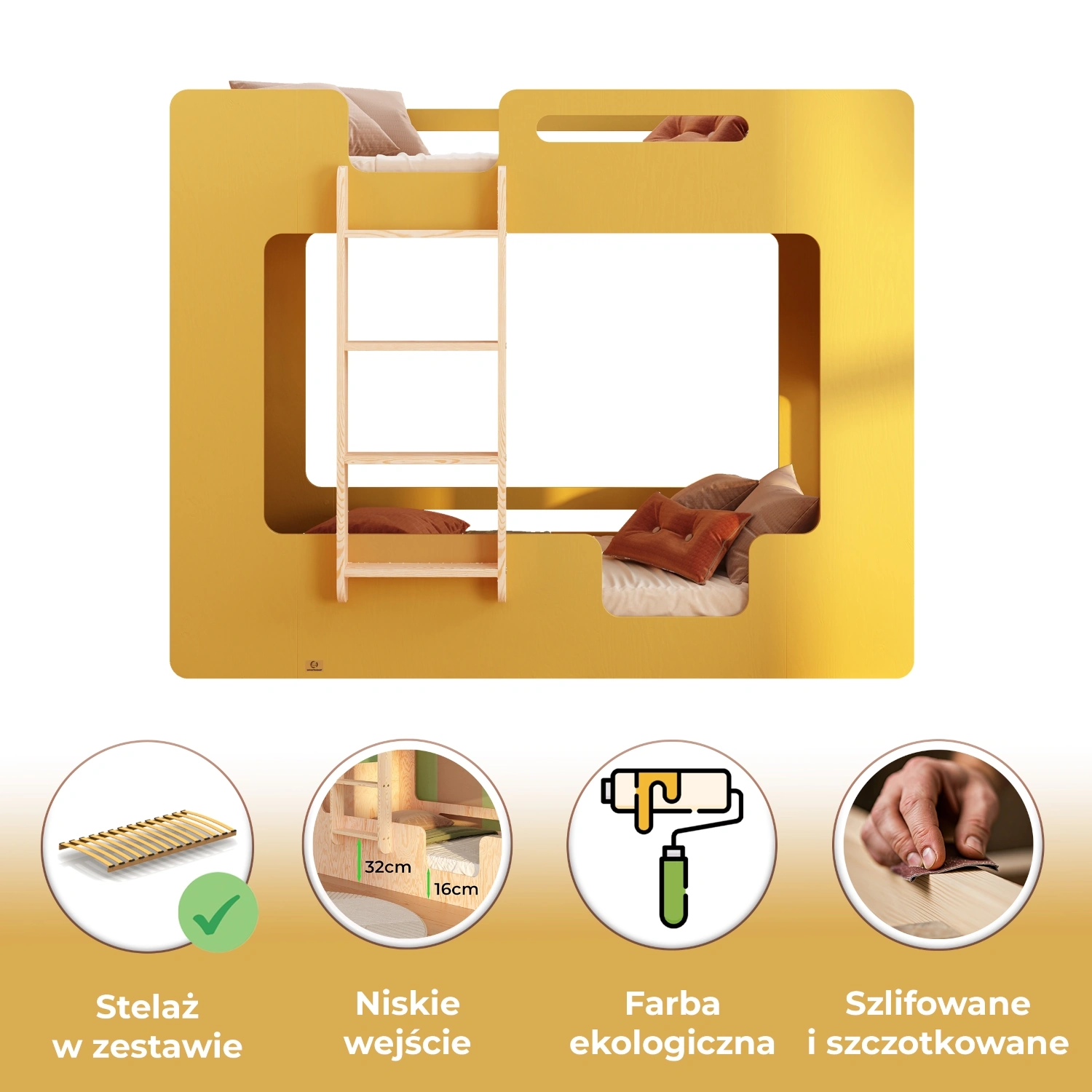 ✔ Bezpieczny design – zaokrąglone, gładkie krawędzie nadają łóżku elegancji, a jednocześnie eliminują ryzyko urazów, tworząc przyjazne środowisko dla najmłodszych.