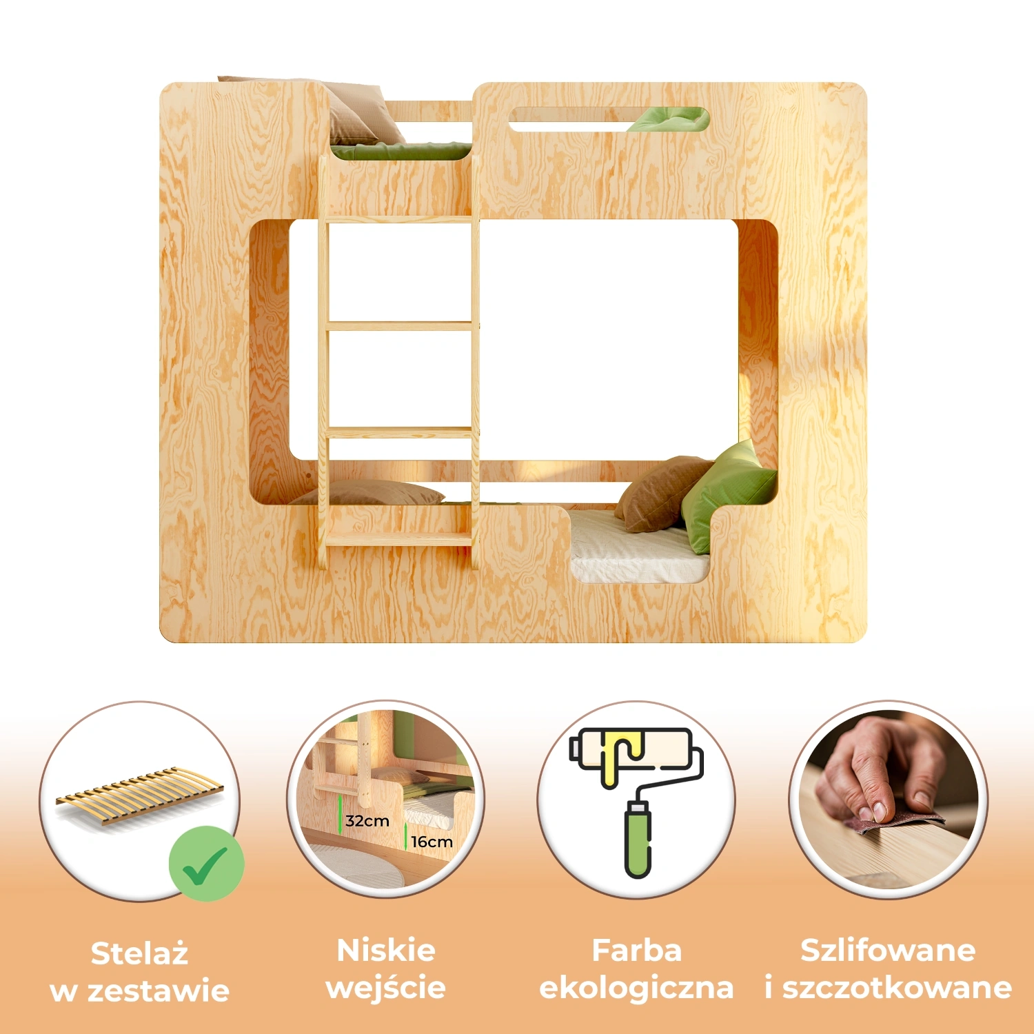 ✔ Podwójna ochrona – barierki na obu poziomach zapewniają poczucie bezpieczeństwa, zarówno na górnym, jak i dolnym łóżku, tworząc komfortową i przytulną przestrzeń do snu.