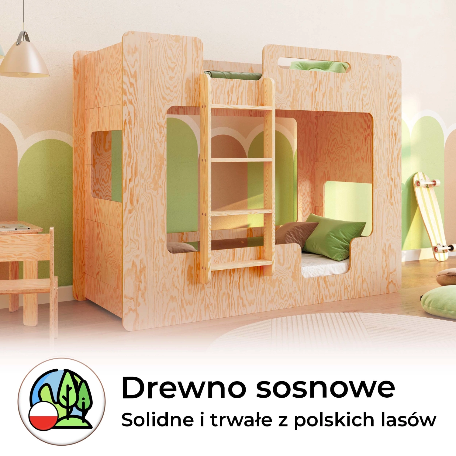 ✔ Wytrzymałość dostosowana do potrzeb – dolne łóżko z nośnością do 230 kg idealnie sprawdzi się dla aktywnych maluchów, podczas gdy górne z obciążeniem do 130 kg oferuje stabilność i ochronę podczas snu.