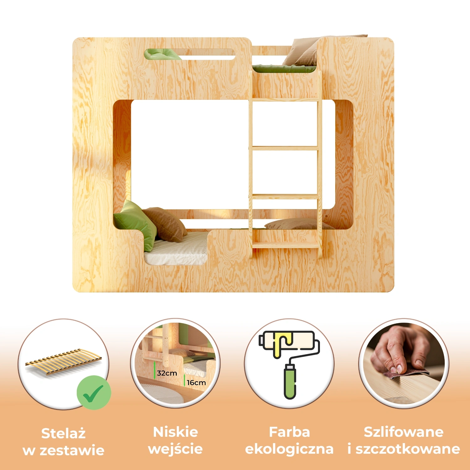 ✔ Podwójna ochrona – barierki na obu poziomach zapewniają poczucie bezpieczeństwa, zarówno na górnym, jak i dolnym łóżku, tworząc komfortową i przytulną przestrzeń do snu.