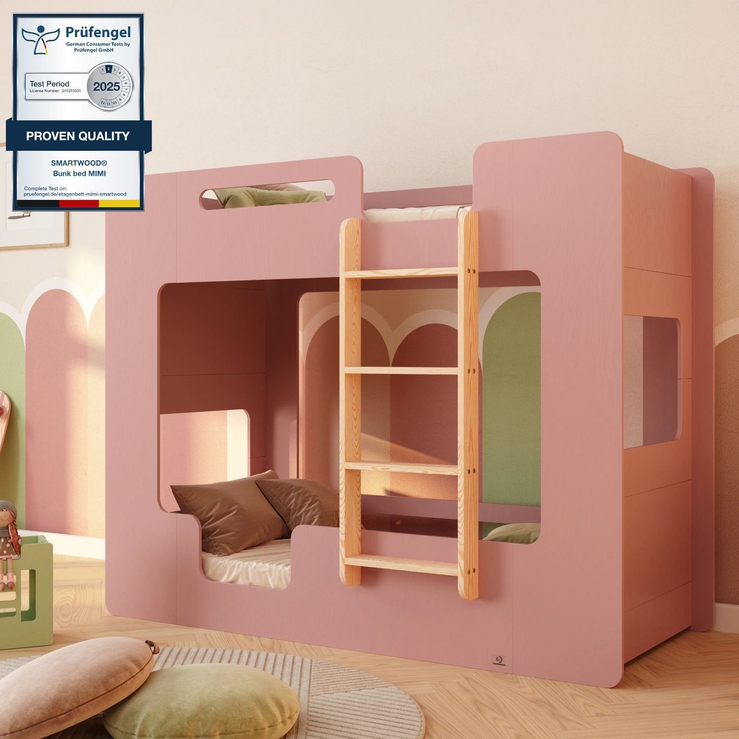 Łóżko piętrowe MIMI B to wyjątkowe rozwiązanie dla dzieci, łączące bezpieczeństwo z niepowtarzalnym designem. Okna po bokach nadają łóżku przytulnego klimatu i tworzą przestrzeń do kreatywnej zabawy, inspirując dzieci do kreowania własnych opowieści. Dostępne w 11 kolorach i 12 rozmiarach, dzięki czemu umożliwia dopasowanie do indywidualnych potrzeb. Wykonane z wysokiej jakości sklejki sosnowej, posiada solidną konstrukcję z barierkami na obu poziomach oraz zaokrąglonymi krawędziami dla pełnego bezpieczeństwa. Model ten został również doceniony przez niemiecki Instytut Prüfengel i otrzymał prestiżowy certyfikat jakości. Dołączone w zestawie stelaże, o max. obciążeniu do 230 kg, umożliwiają natychmiastowe korzystanie z łóżka po montażu.