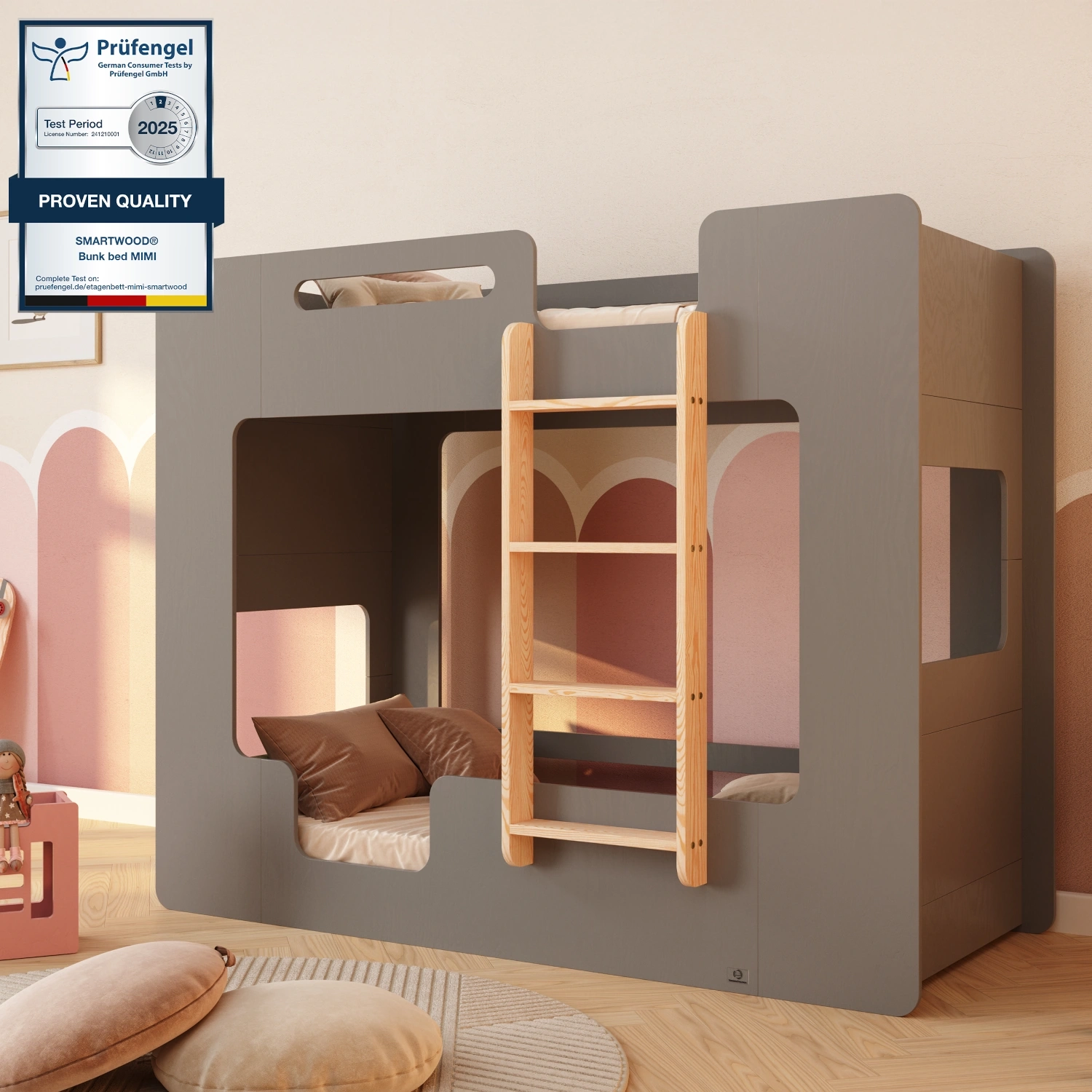 Łóżko piętrowe MIMI B to wyjątkowe rozwiązanie dla dzieci, łączące bezpieczeństwo z niepowtarzalnym designem. Okna po bokach nadają łóżku przytulnego klimatu i tworzą przestrzeń do kreatywnej zabawy, inspirując dzieci do kreowania własnych opowieści. Dostępne w 11 kolorach i 12 rozmiarach, dzięki czemu umożliwia dopasowanie do indywidualnych potrzeb. Wykonane z wysokiej jakości sklejki sosnowej, posiada solidną konstrukcję z barierkami na obu poziomach oraz zaokrąglonymi krawędziami dla pełnego bezpieczeństwa. Model ten został również doceniony przez niemiecki Instytut Prüfengel i otrzymał prestiżowy certyfikat jakości. Dołączone w zestawie stelaże, o max. obciążeniu do 230 kg, umożliwiają natychmiastowe korzystanie z łóżka po montażu.