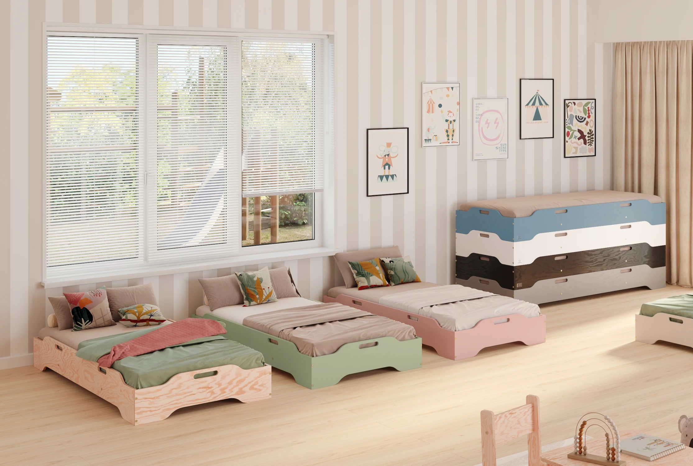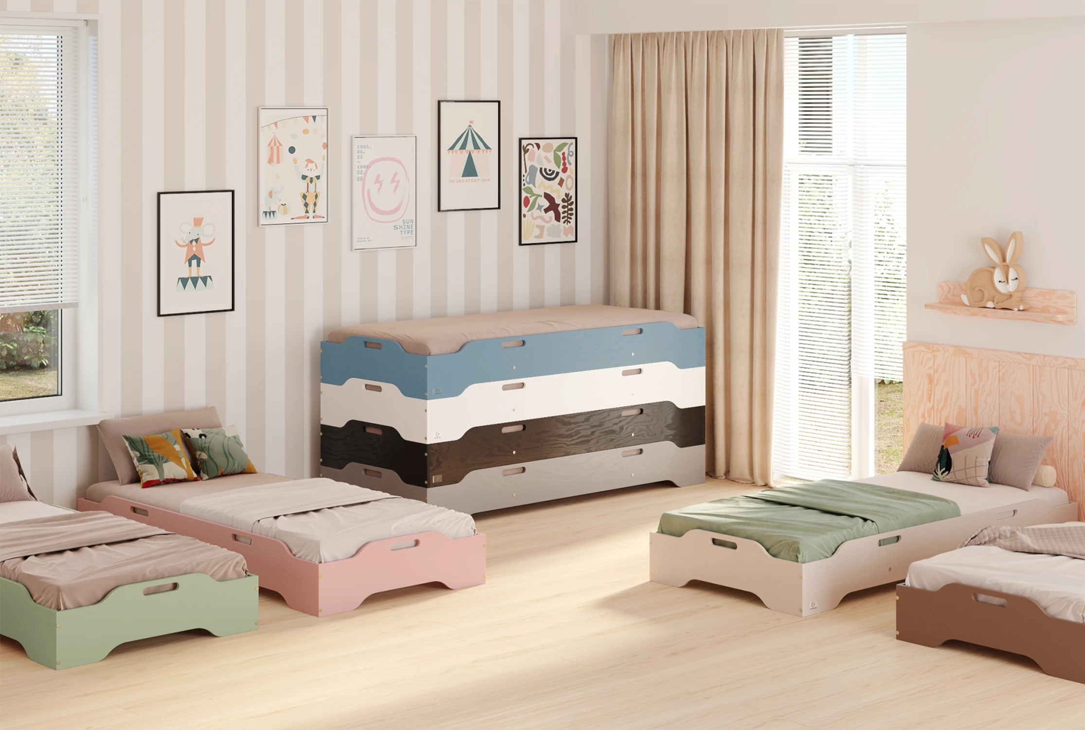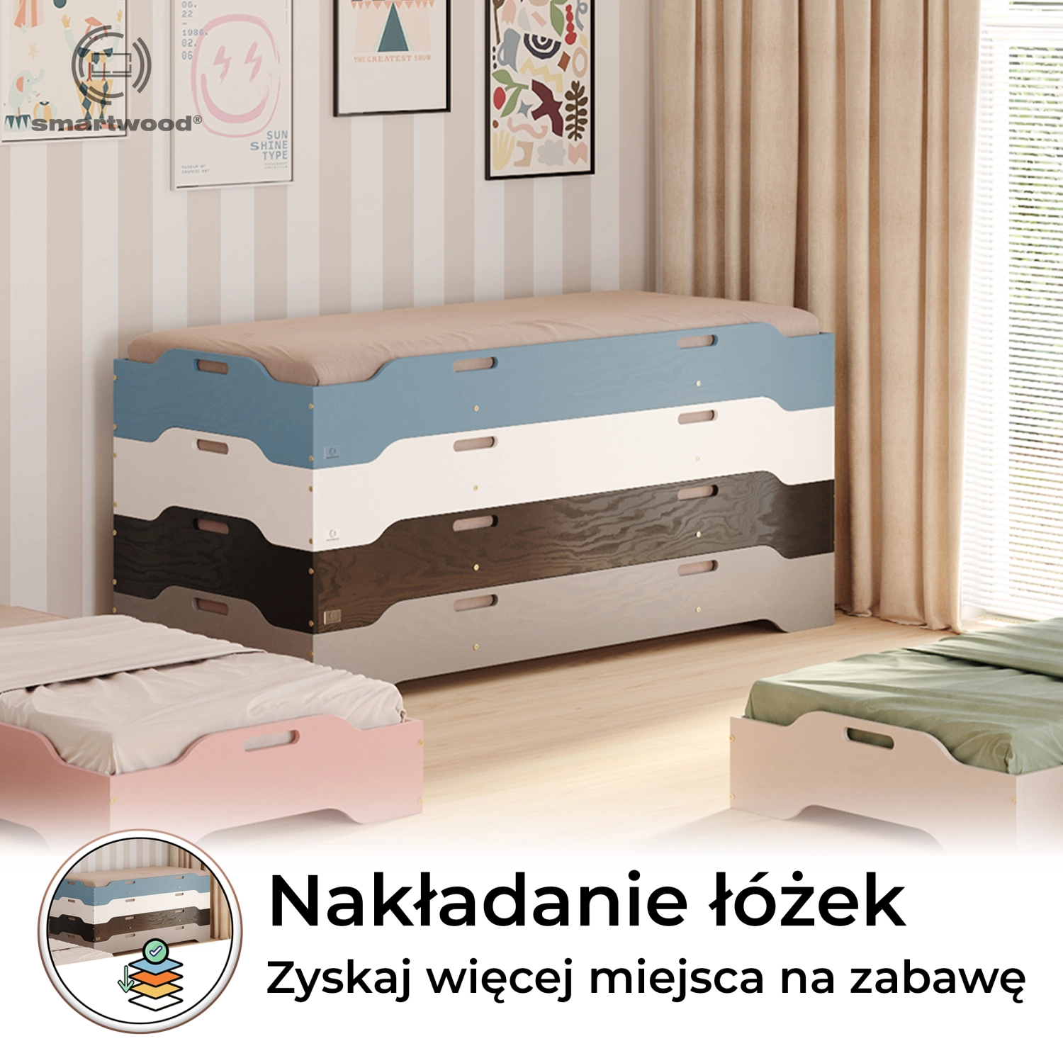 Dla tych, którzy potrzebują więcej przestrzeni w ciągu dnia mamy następujące rozwiązanie - to łóżko pozwala na wygodne piętrowanie – można układać kilka łóżek jedno na drugim, a na noc łatwo je rozstawić. Dzięki idealnie dopasowanym krawędziom każda konfiguracja jest stabilna i bezpieczna. Można również wykorzystać je jako podwyższenie innego łóżka, tworząc wielopoziomowe rozwiązanie bez wiercenia i skomplikowanego montażu. To elastyczność, jakiej potrzebujesz w nowoczesnym wnętrzu!
