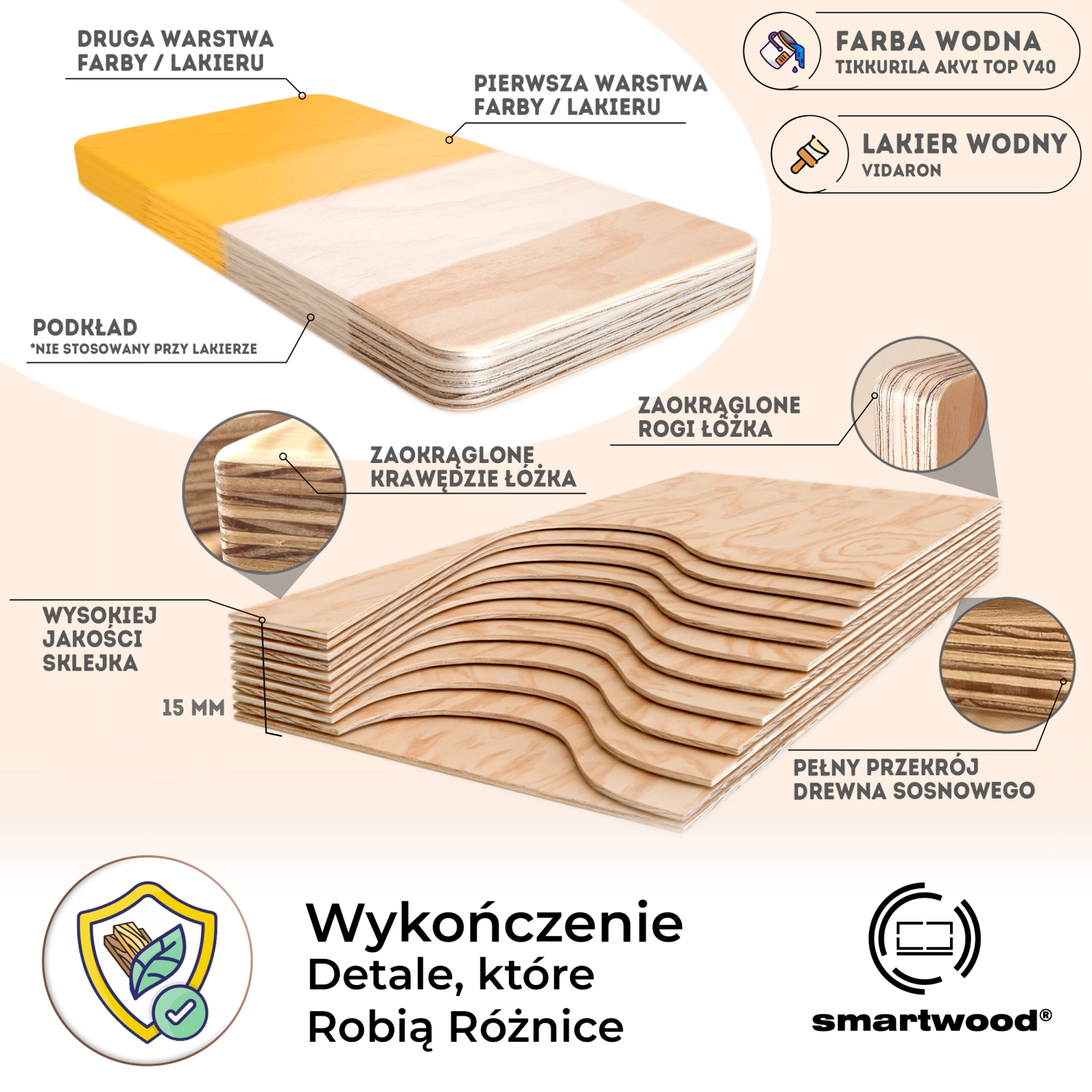 W procesie lakierowania korzystamy z bezbarwnego lakieru do drewna marki VIDARON. Lakier nie tylko podkreśla naturalny kolor drewna, ale również jest specjalnie dostosowany do produktów dziecięcych. Bezpieczny dla najmłodszych, spełnia surowe normy europejskiej normy PN EN 71.3 dotyczącej bezpieczeństwa zabawek. Dzięki temu każdy nasz produkt nie tylko zachowuje estetykę drewna, ale również zapewnia rodzicom pewność, że jest bezpieczny dla ich dzieci. Nasz lakier VIDARON to gwarancja trwałości, ochrony i pięknego wykończenia drewnianych elementów naszych produktów.