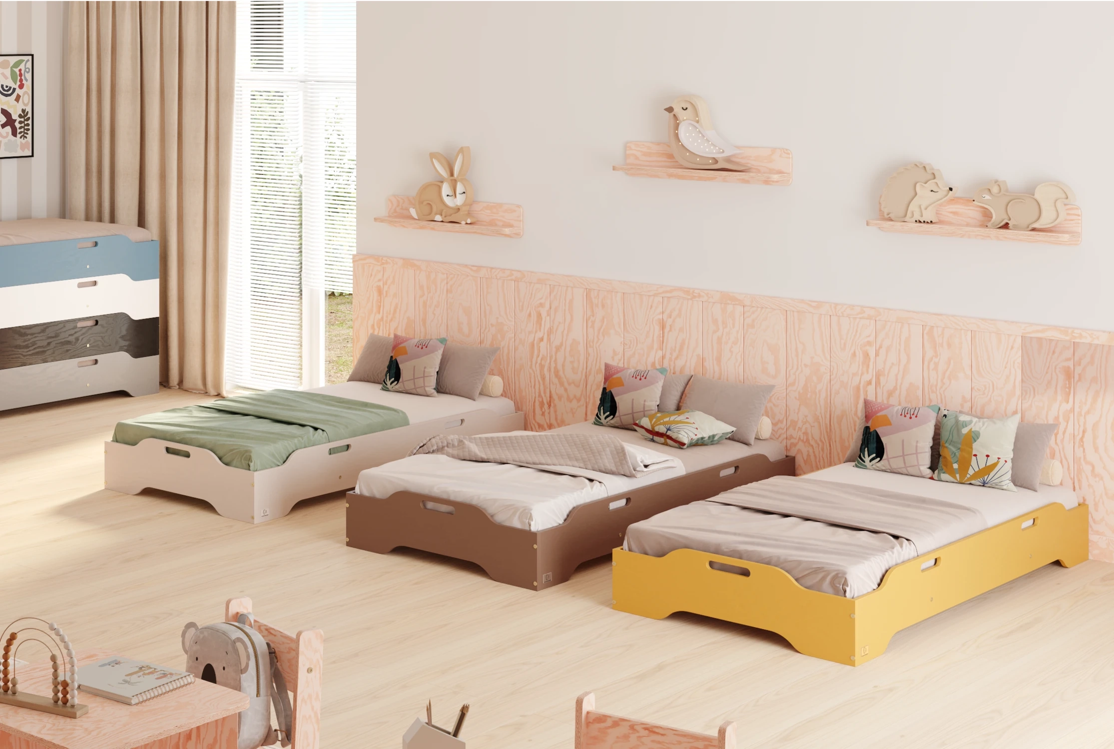 Łóżko pojedyncze dla dzieci podłogowe ze stelażem TILA 8 Montessori Drewniane