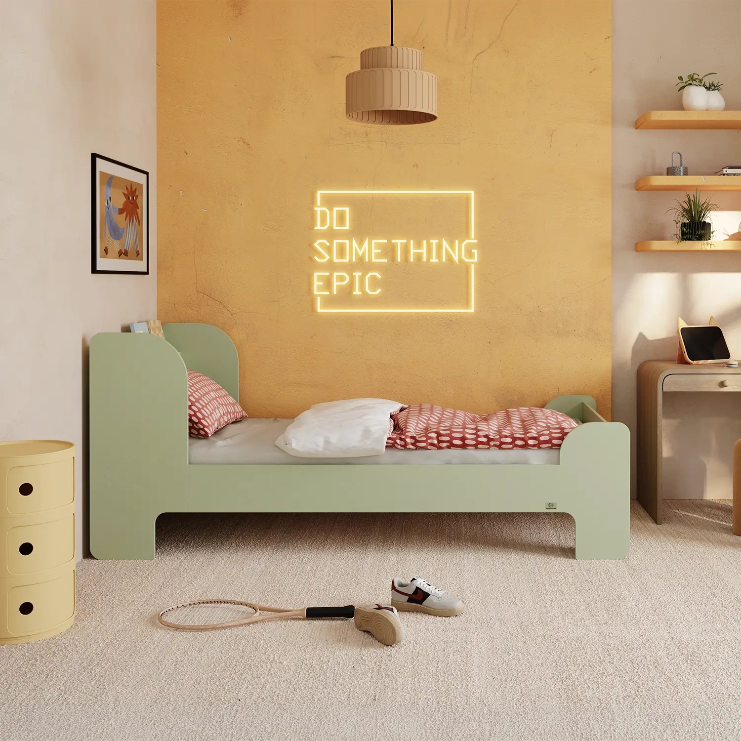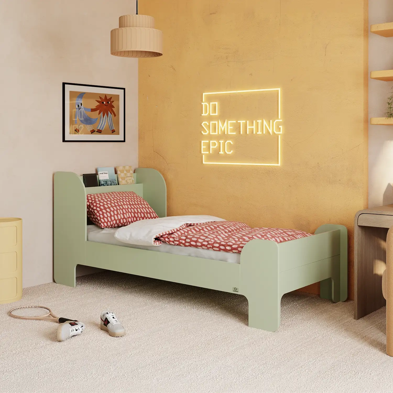 Marzysz o łóżku, które podkreśli styl Twojego nastolatka i zapewni mu maksimum bezpieczeństwa? Nasze pojedyncze łóżko łączy odważny, młodzieżowy design z wytrzymałą konstrukcją ze sklejki sosnowej. Stabilne, przyjazne w dotyku i łatwe w utrzymaniu – idealne miejsce na odpoczynek i codzienne wyzwania. Przekonaj się, jak niewiele potrzeba, by pokój zyskał nowy wymiar!