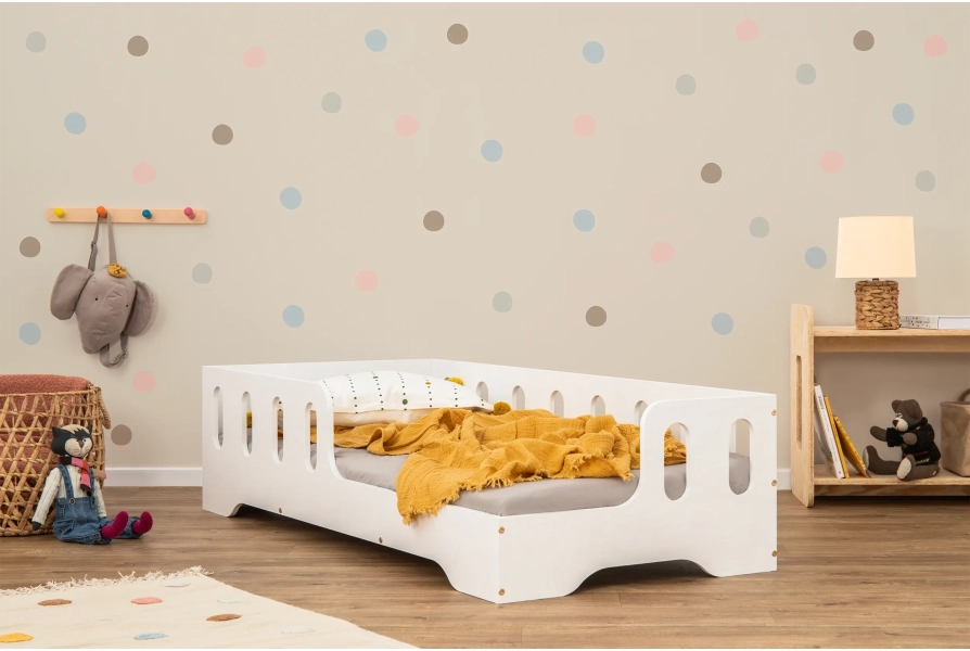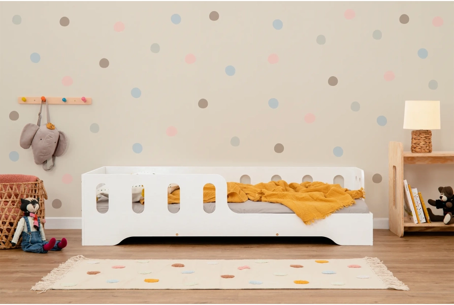 Łóżko pojedyncze dla dzieci z barierką i stelażem TILA 1 Montessori Drewniane