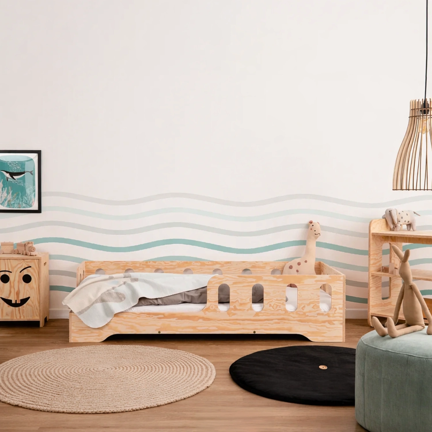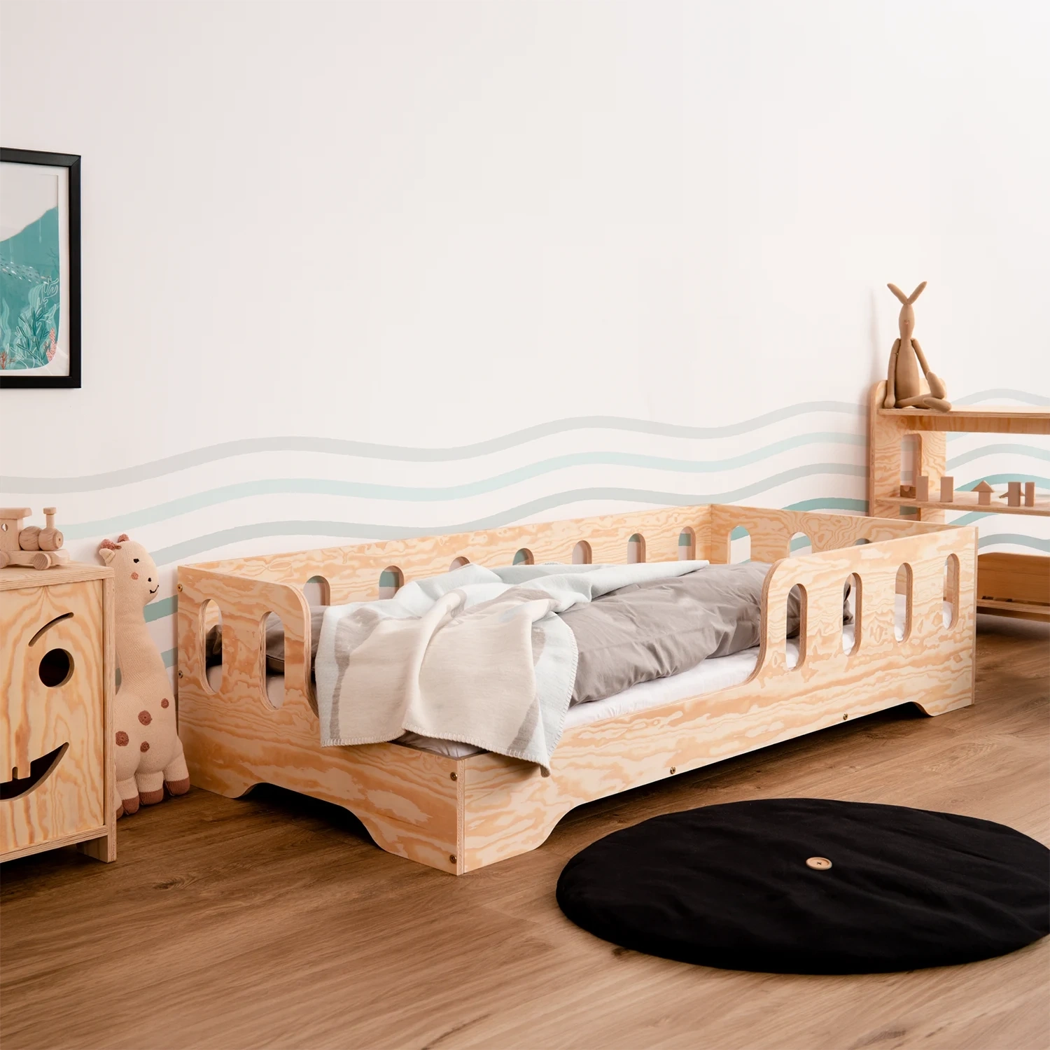 Łóżko pojedyncze dla dzieci z barierką i stelażem TILA 1 Montessori Drewniane