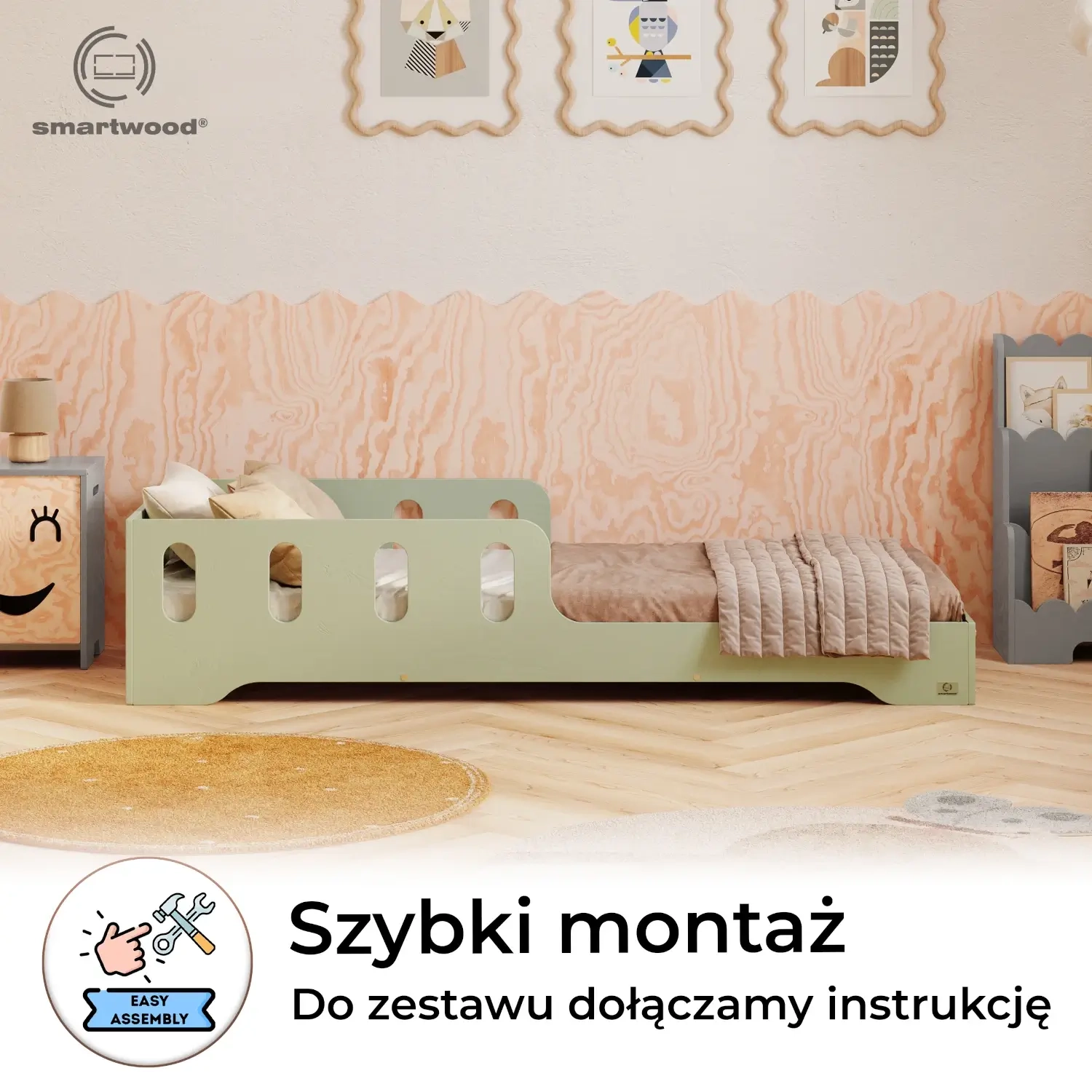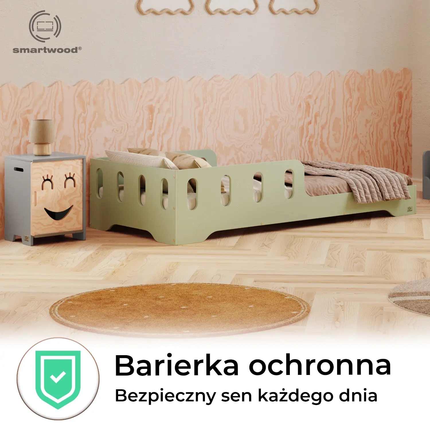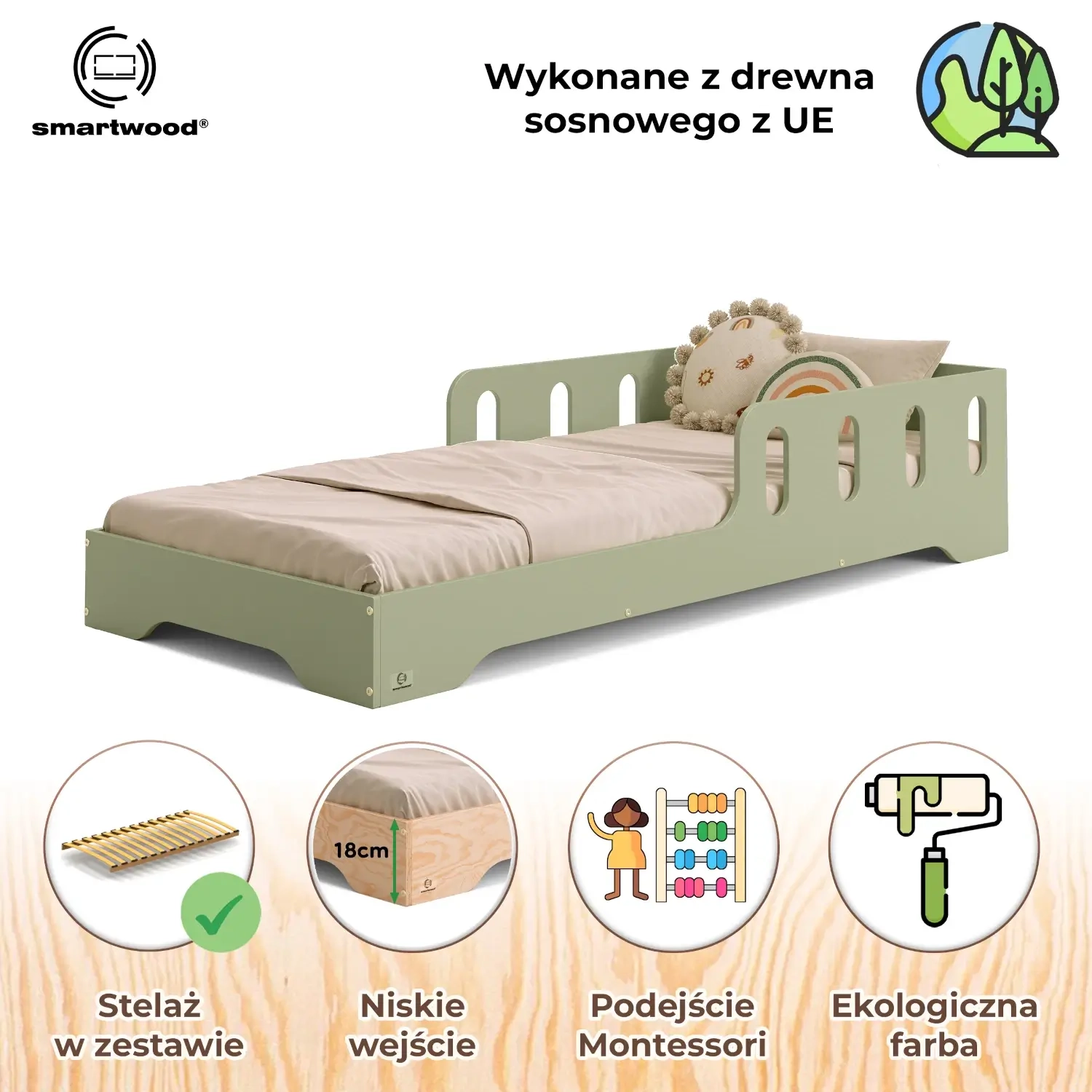 Łóżko pojedyncze dla dzieci z barierką i stelażem TILA 6 Montessori Drewniane