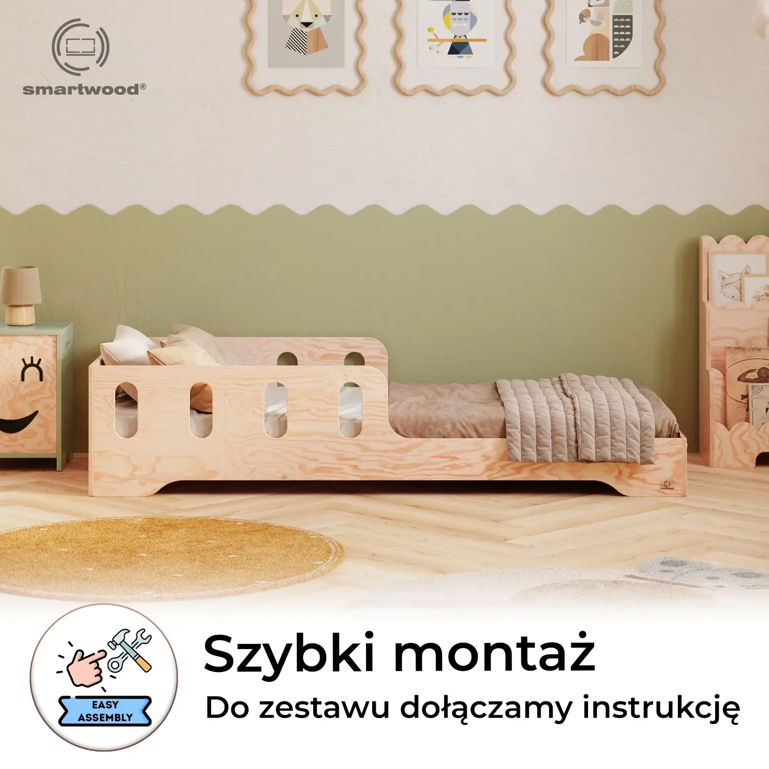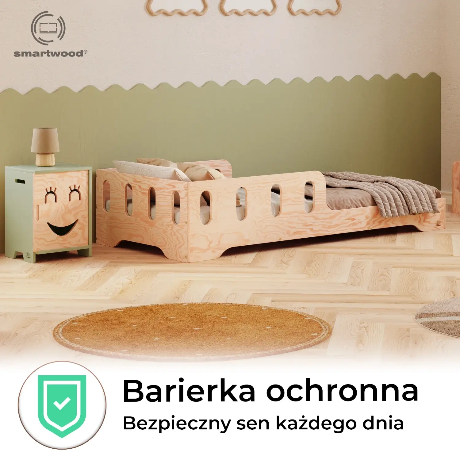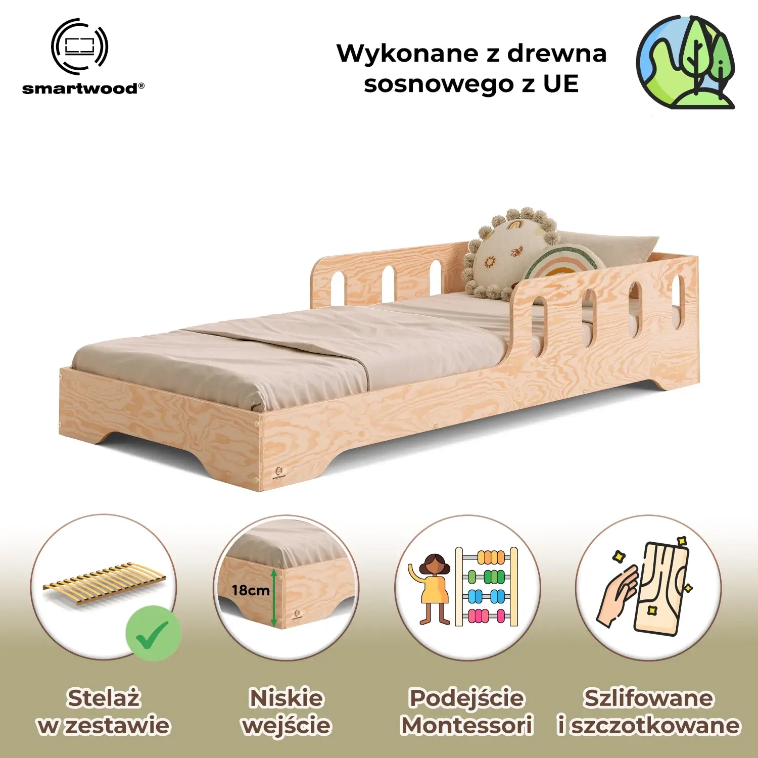 Łóżko pojedyncze dla dzieci z barierką i stelażem TILA 6 Montessori Drewniane