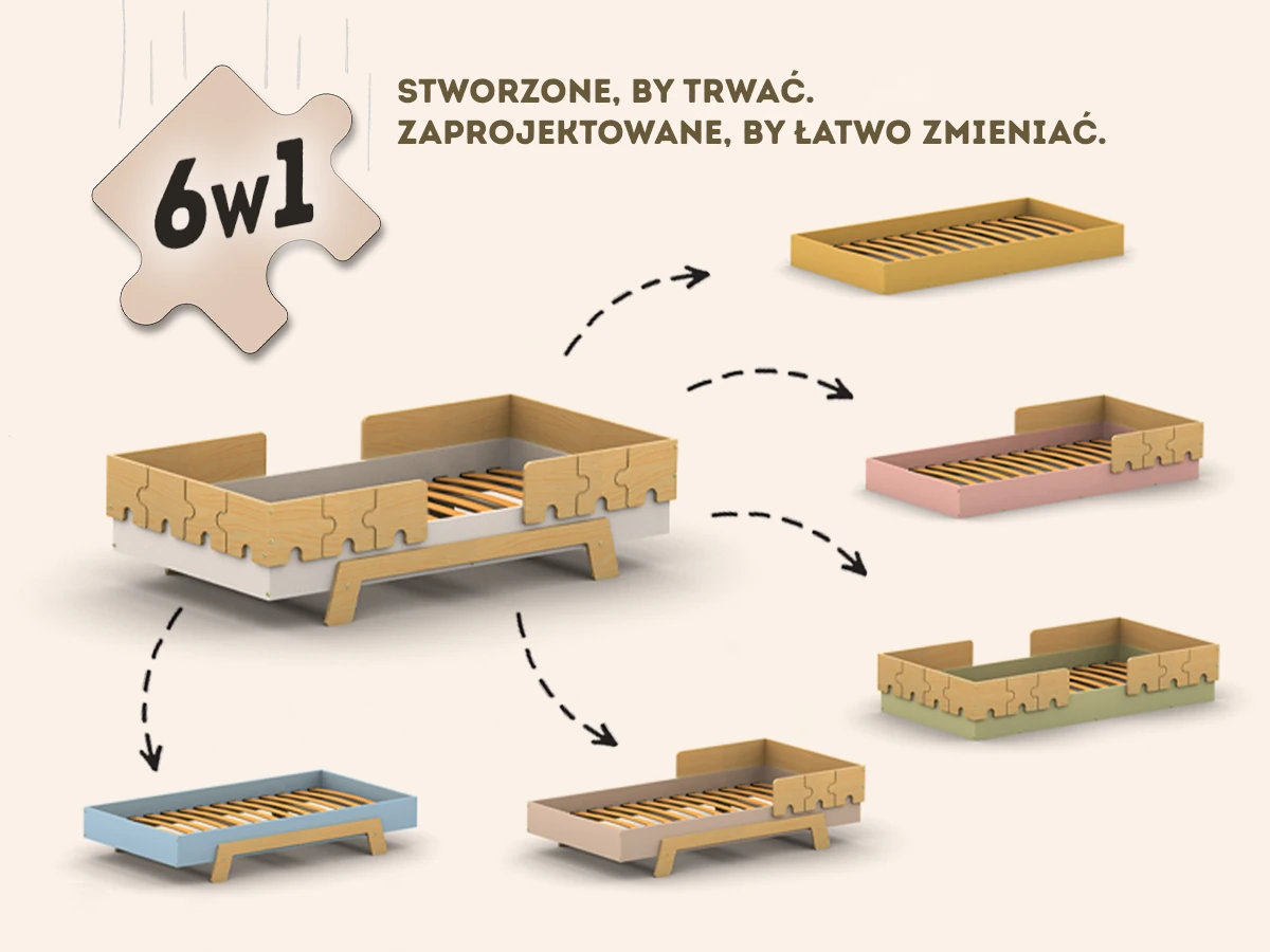 Dzięki przemyślanej konstrukcji możesz wybrać spośród 6 wariantów, różniących się liczbą barierek oraz wysokością łóżka. W praktyce oznacza to, że jedno łóżko może być zarówno bezpiecznym, podłogowym miejscem snu dla malucha, jak i „dorosłym” łóżkiem dla starszego dziecka.