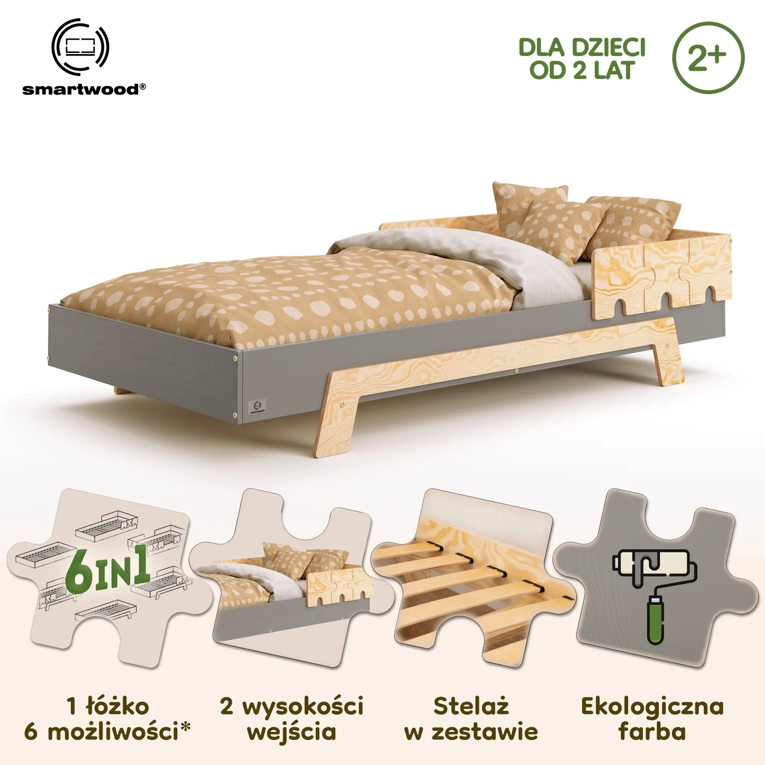Dzięki przemyślanej konstrukcji możesz wybrać spośród 6 wariantów, różniących się liczbą barierek oraz wysokością łóżka. W praktyce oznacza to, że jedno łóżko może być zarówno bezpiecznym, podłogowym miejscem snu dla malucha, jak i „dorosłym” łóżkiem dla starszego dziecka.