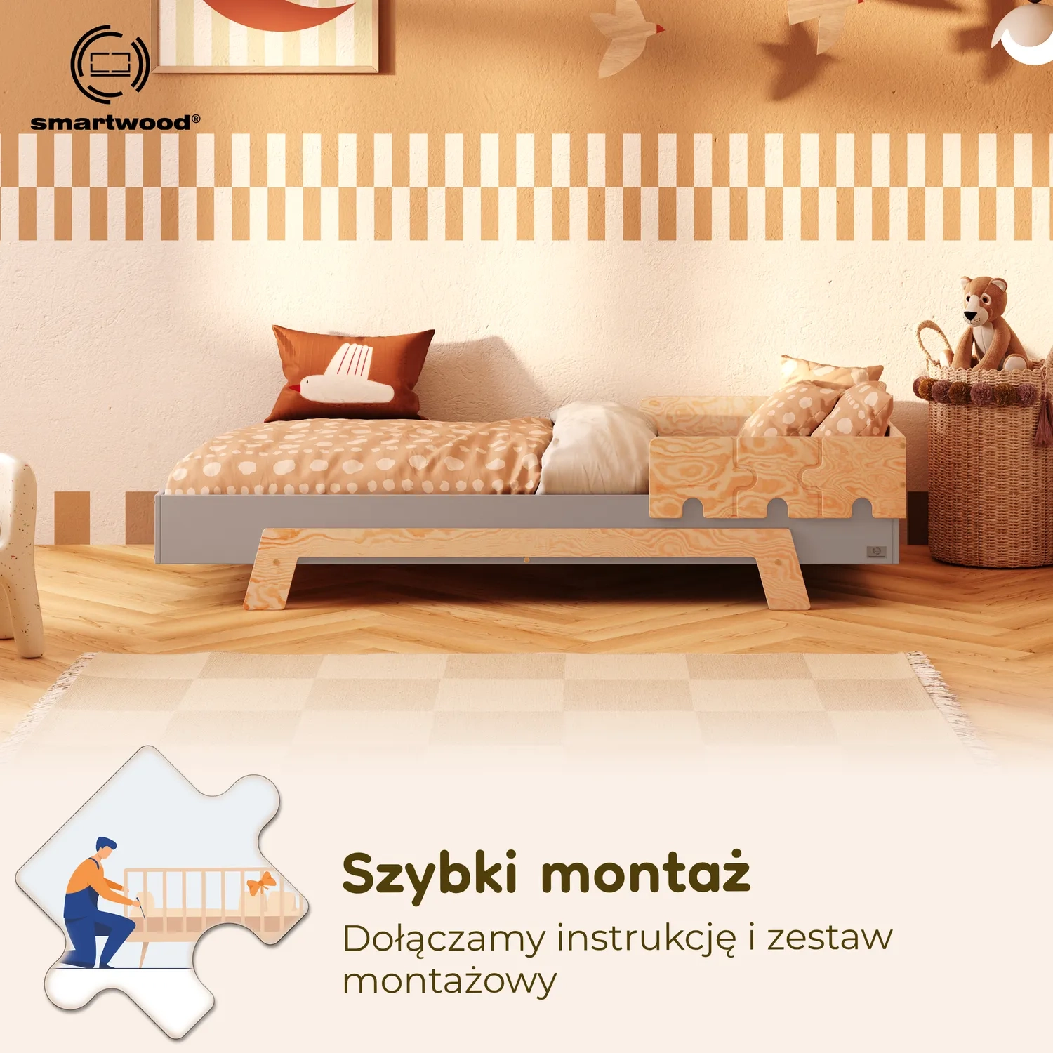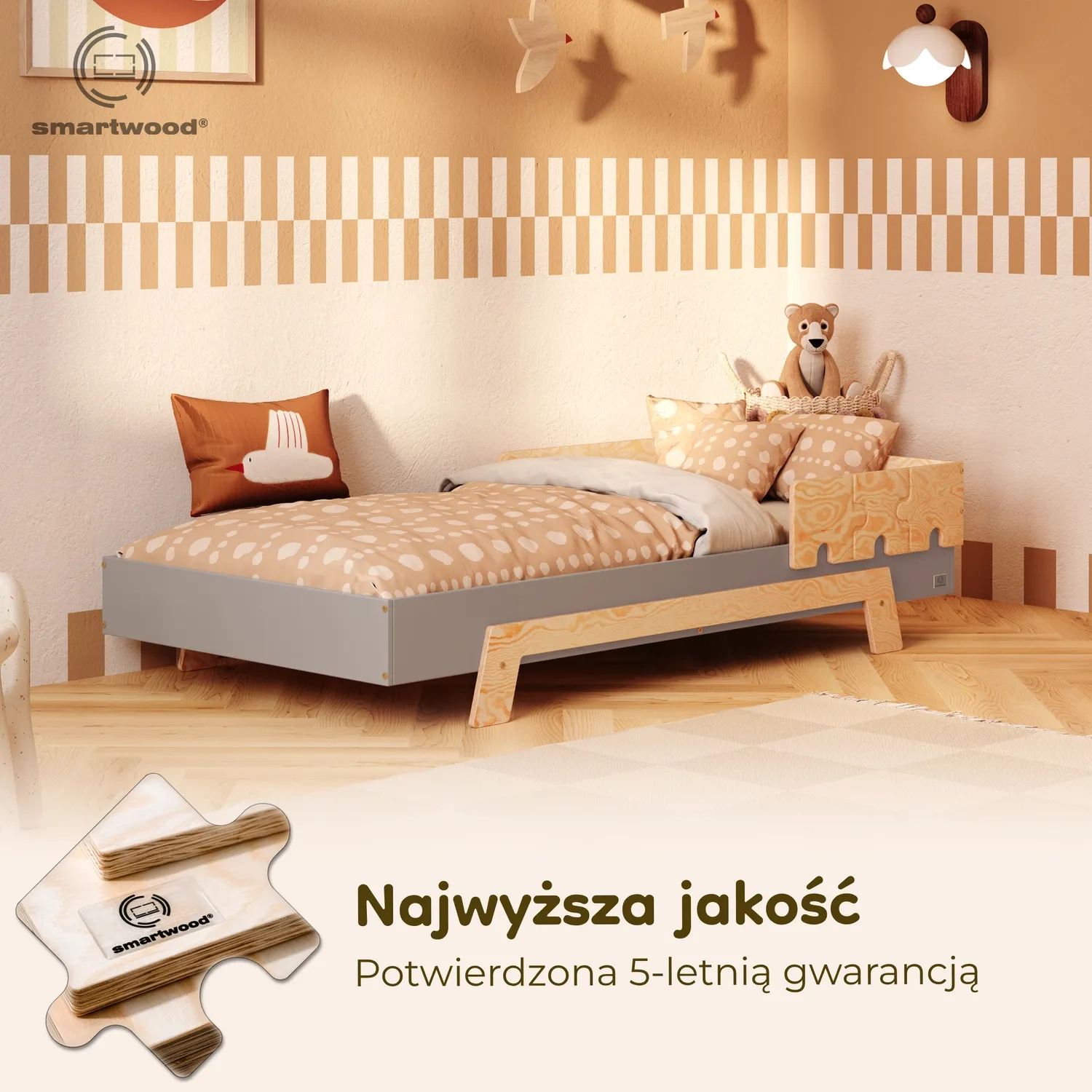 Łóżko pojedyncze dla dzieci z barierką i stelażem PUZZLE BR1 Montessori Drewniane