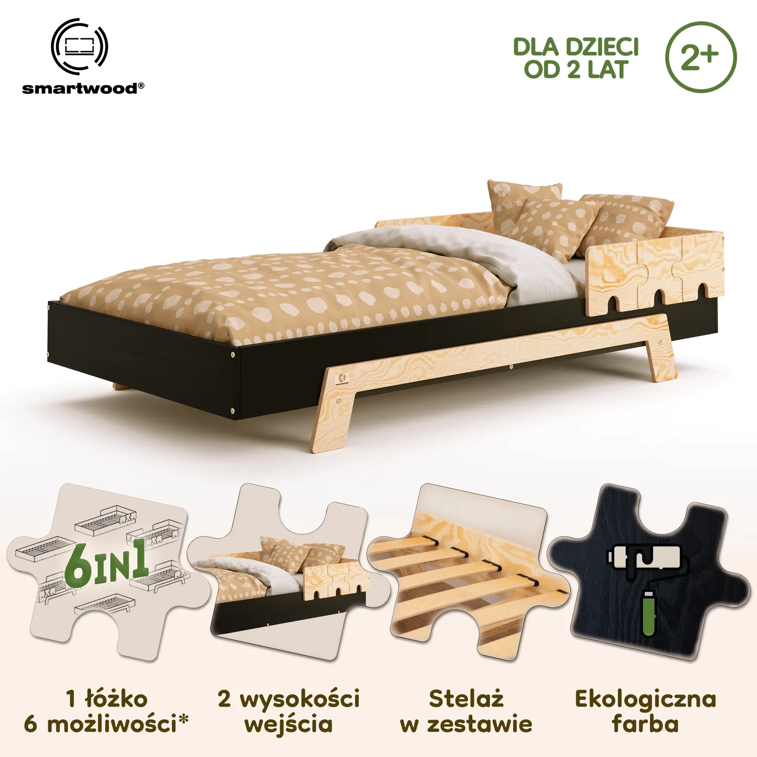 Dzięki przemyślanej konstrukcji możesz wybrać spośród 6 wariantów, różniących się liczbą barierek oraz wysokością łóżka. W praktyce oznacza to, że jedno łóżko może być zarówno bezpiecznym, podłogowym miejscem snu dla malucha, jak i „dorosłym” łóżkiem dla starszego dziecka.