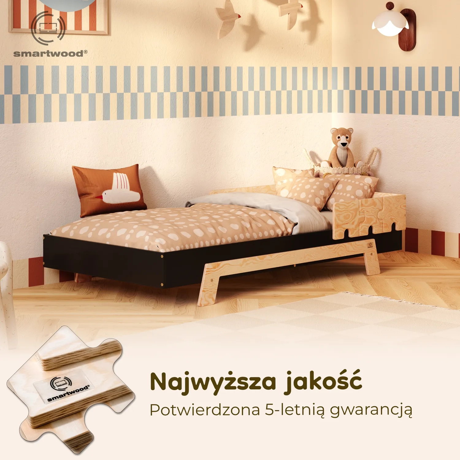 Łóżko pojedyncze dla dzieci z barierką i stelażem PUZZLE BR1 Montessori Drewniane