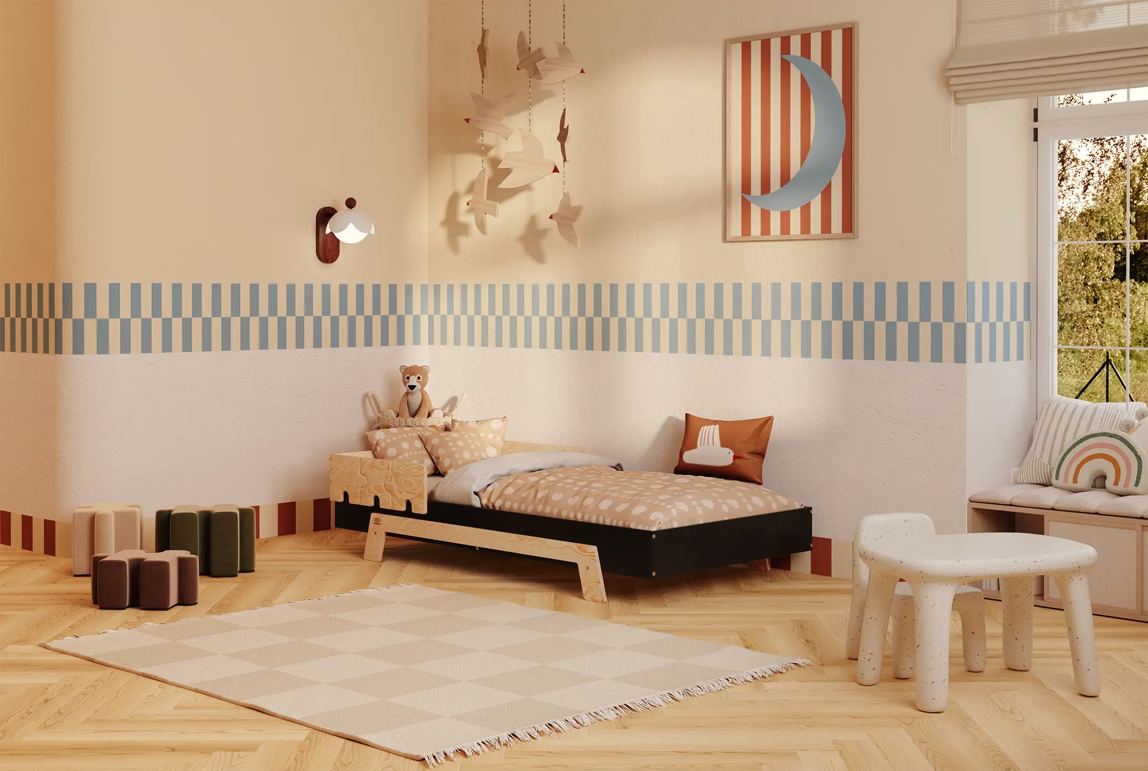 Świetna baza do stworzenia minimalistycznego kącika do spania lub strefy relaksu. Niska konstrukcja nadal sprzyja bezpieczeństwu, ale daje pełną swobodę ruchu.