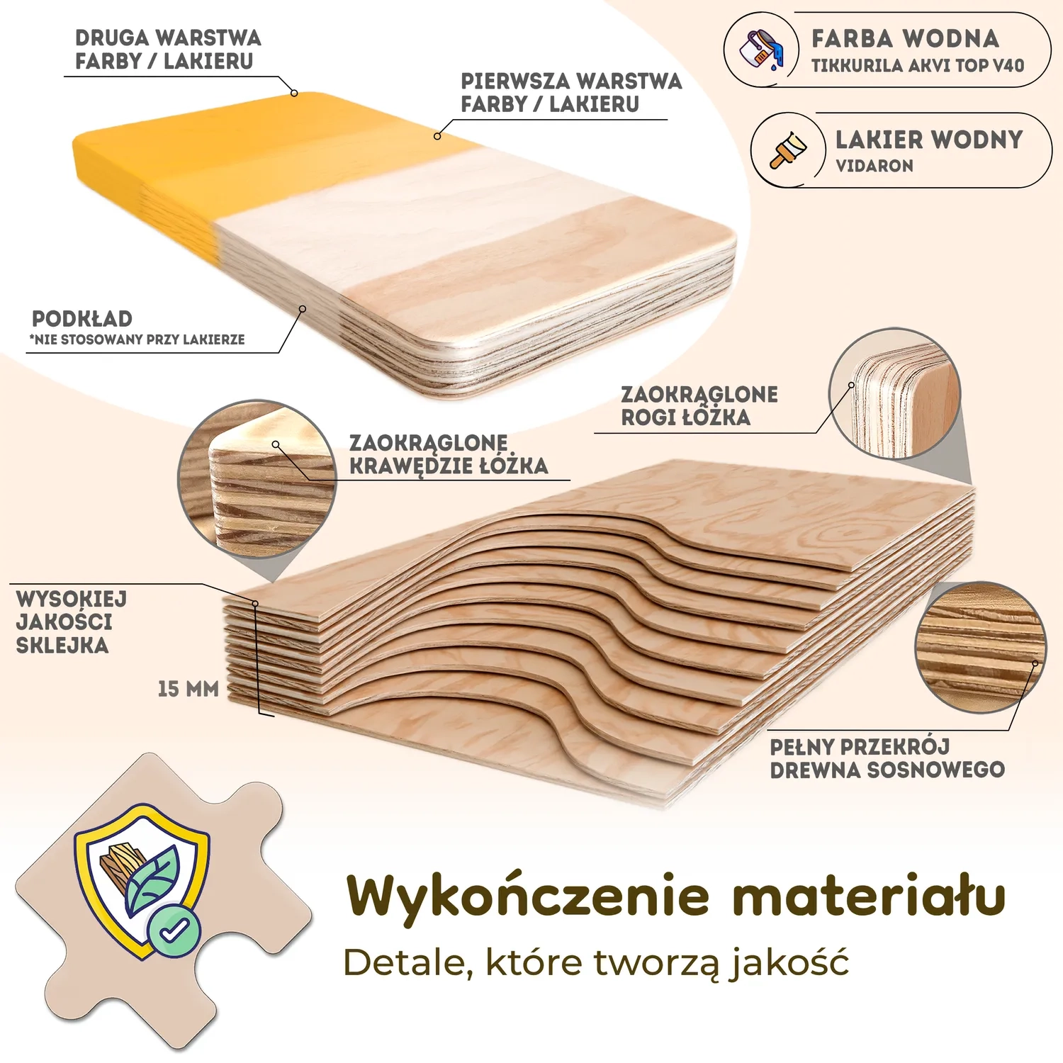 Warstwy sklejki sosnowej o grubości 15mm cechy to jakość trwałość bezpieczeństwo oraz zaokrąglone rogi i krawędzie łóżko
