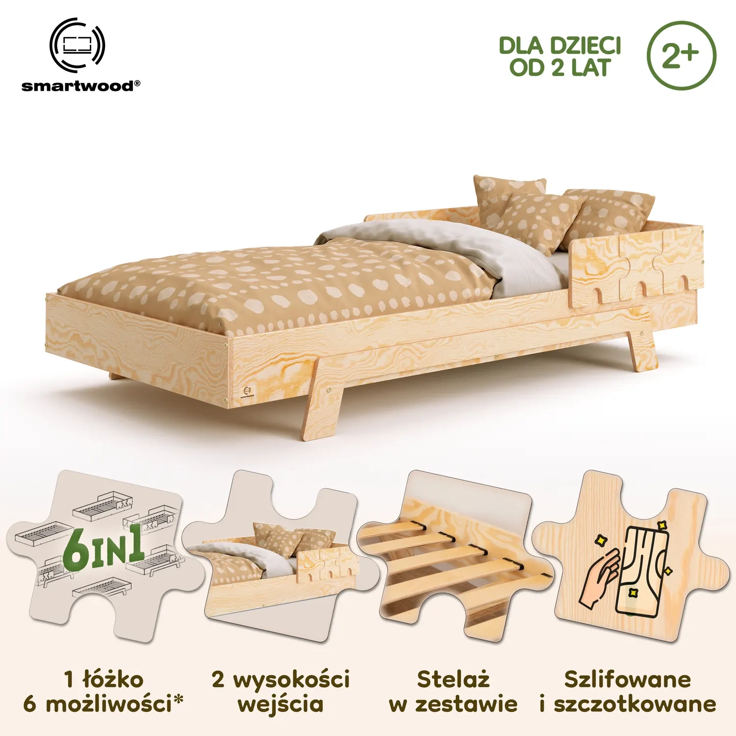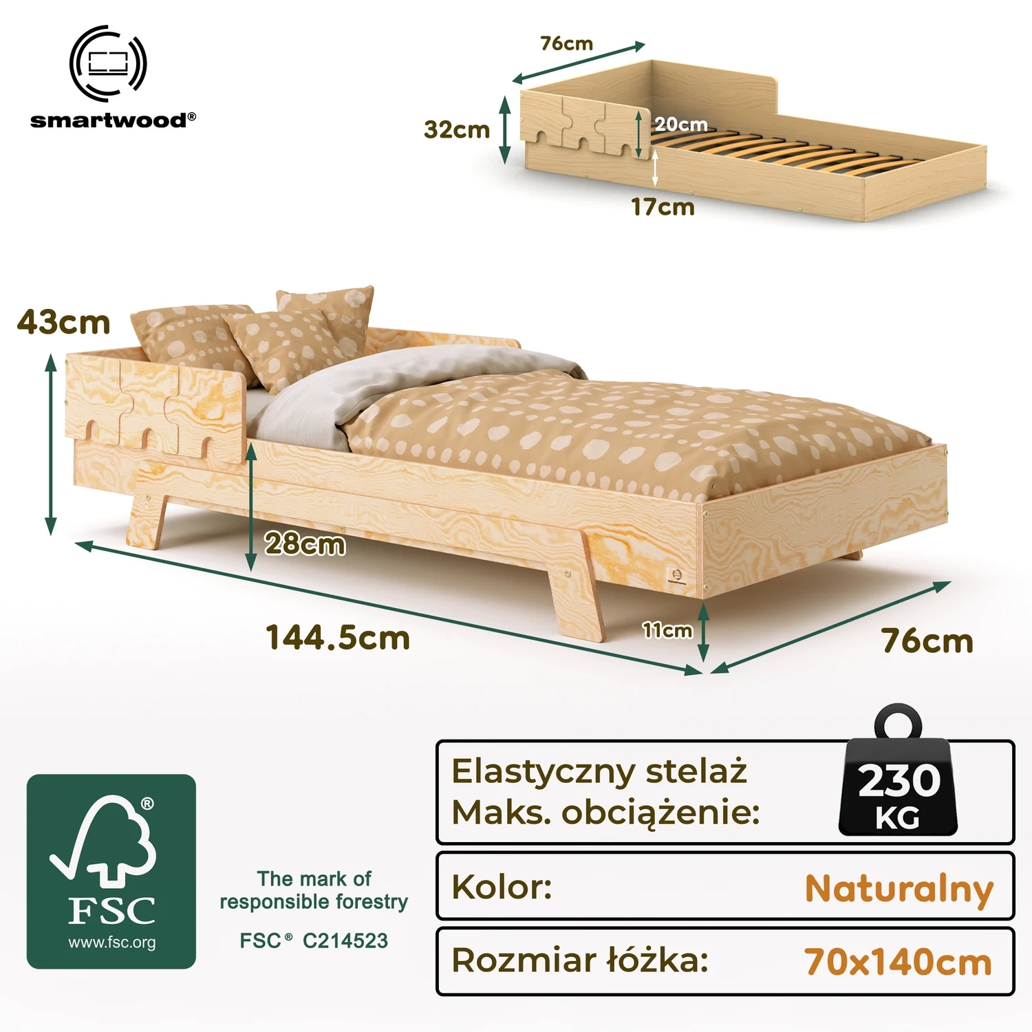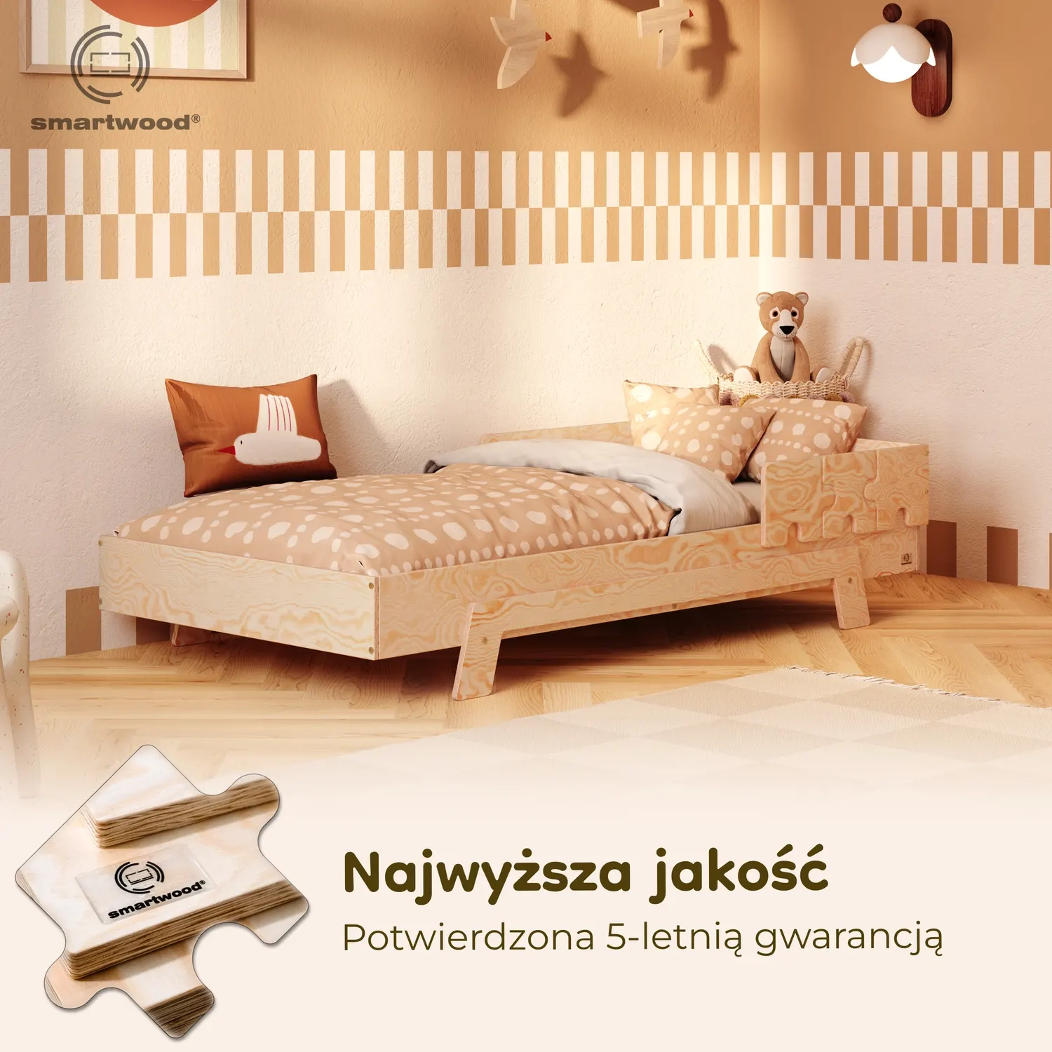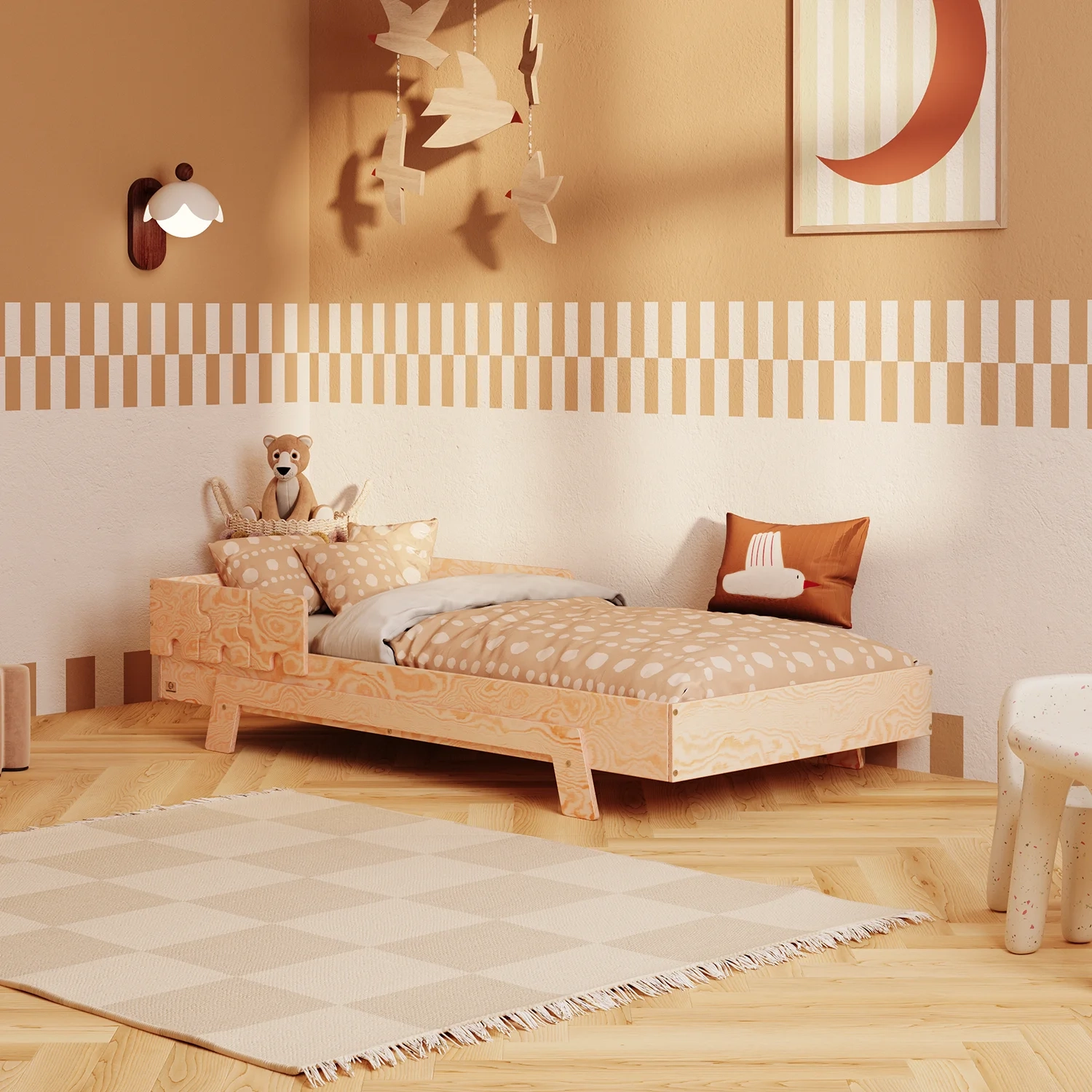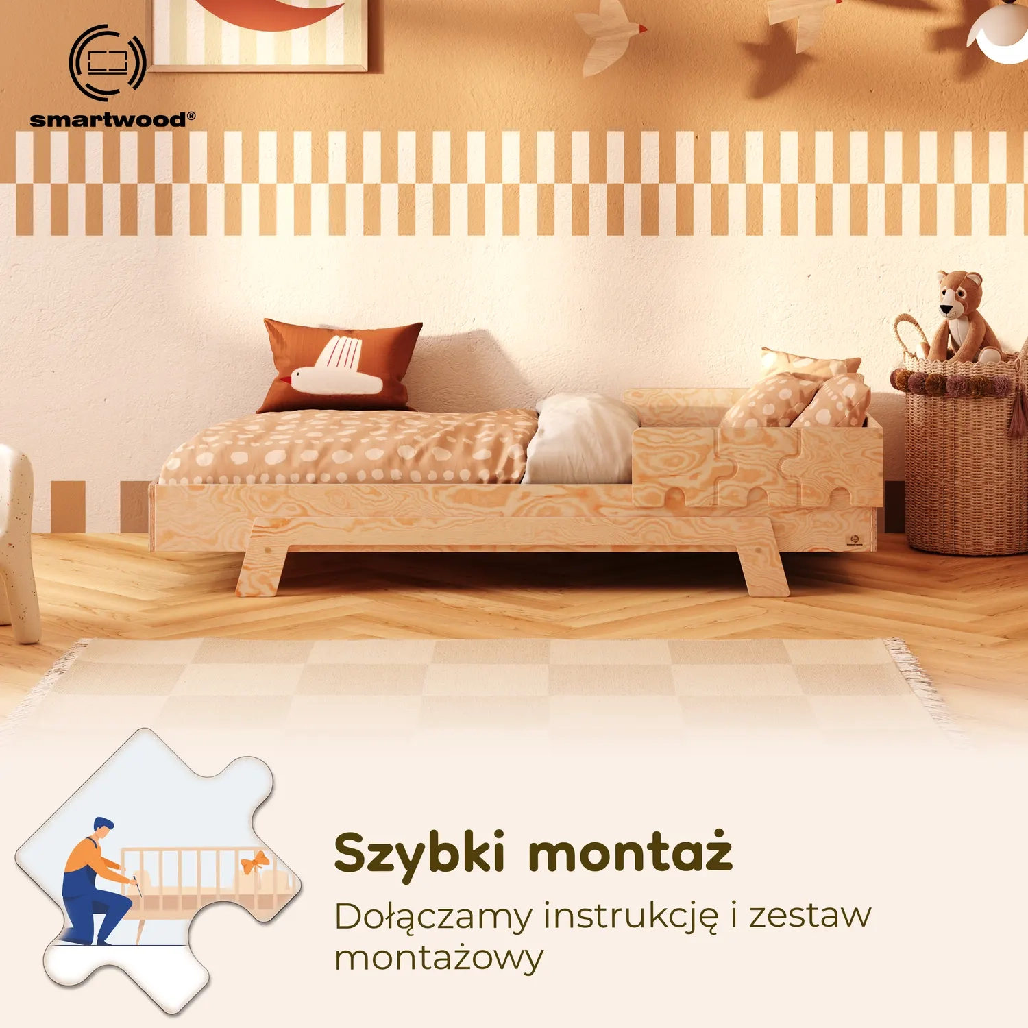 Łóżko pojedyncze dla dzieci z barierką i stelażem PUZZLE BR1 Montessori Drewniane