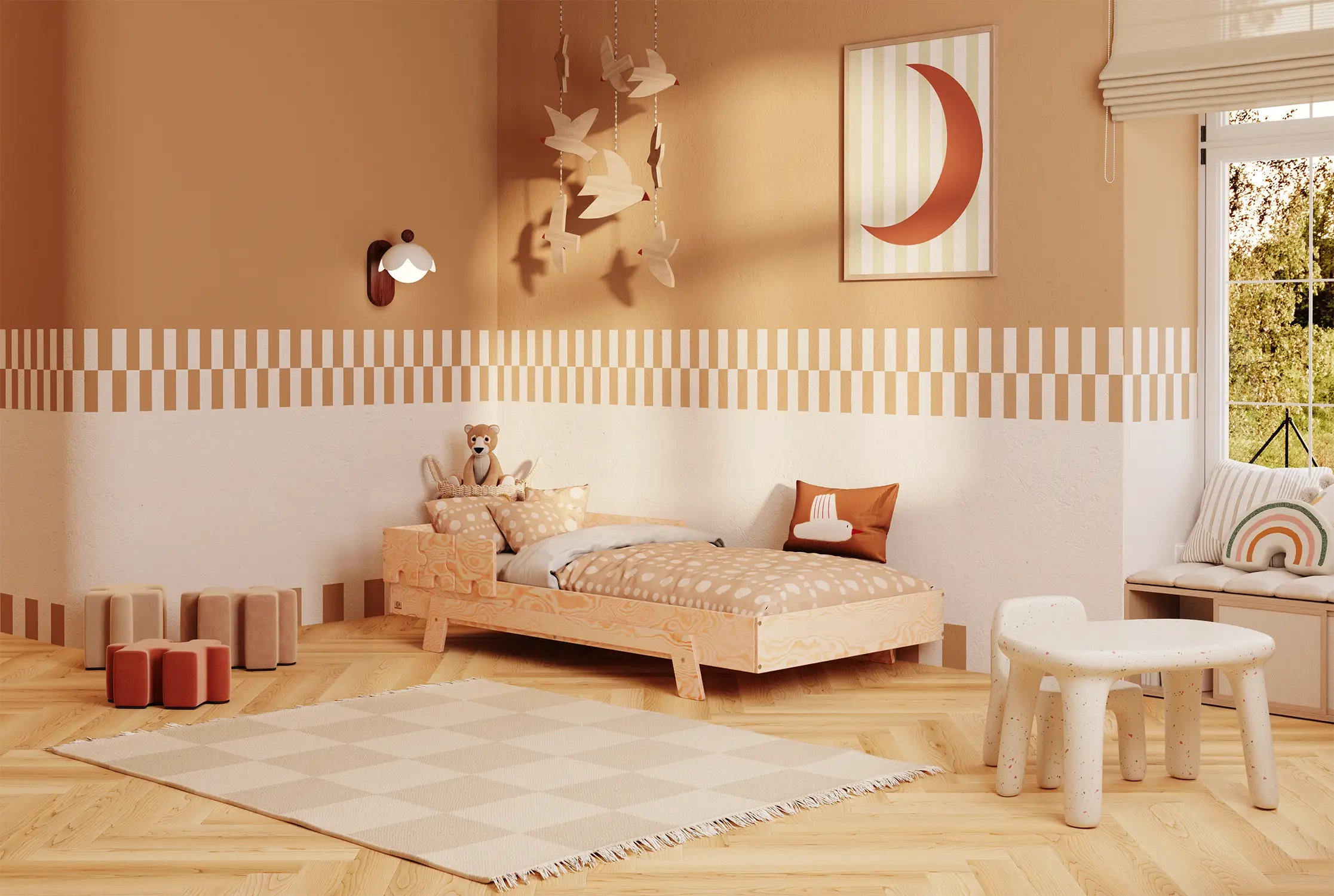Świetna baza do stworzenia minimalistycznego kącika do spania lub strefy relaksu. Niska konstrukcja nadal sprzyja bezpieczeństwu, ale daje pełną swobodę ruchu.