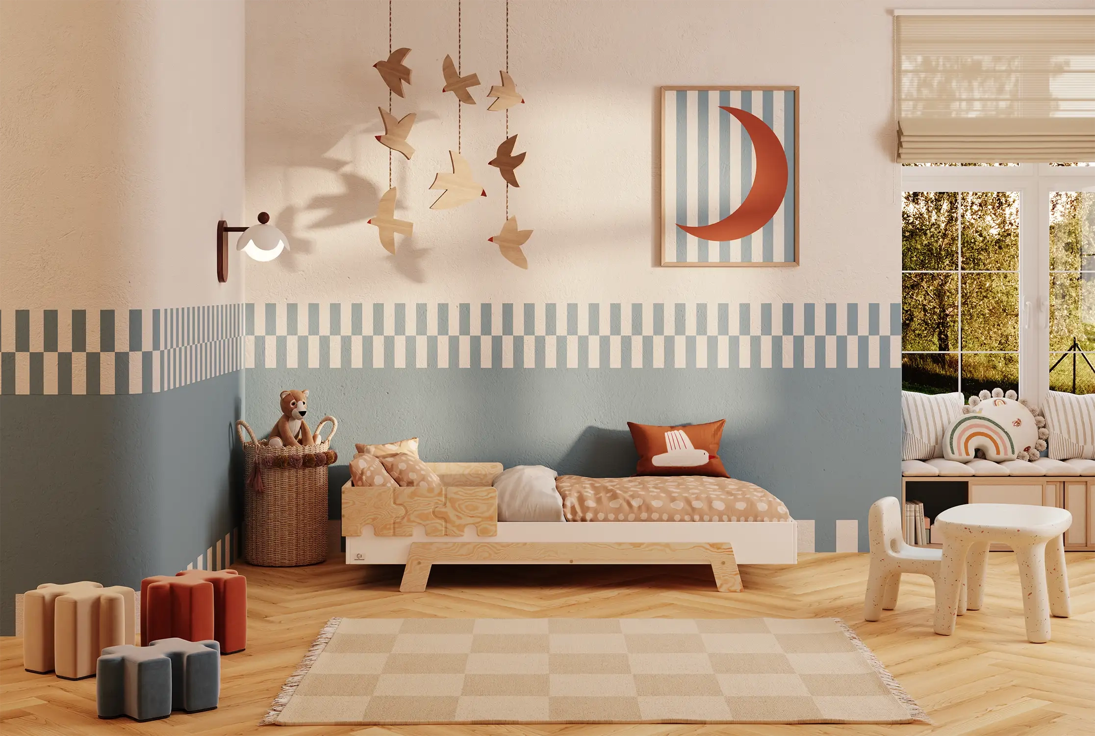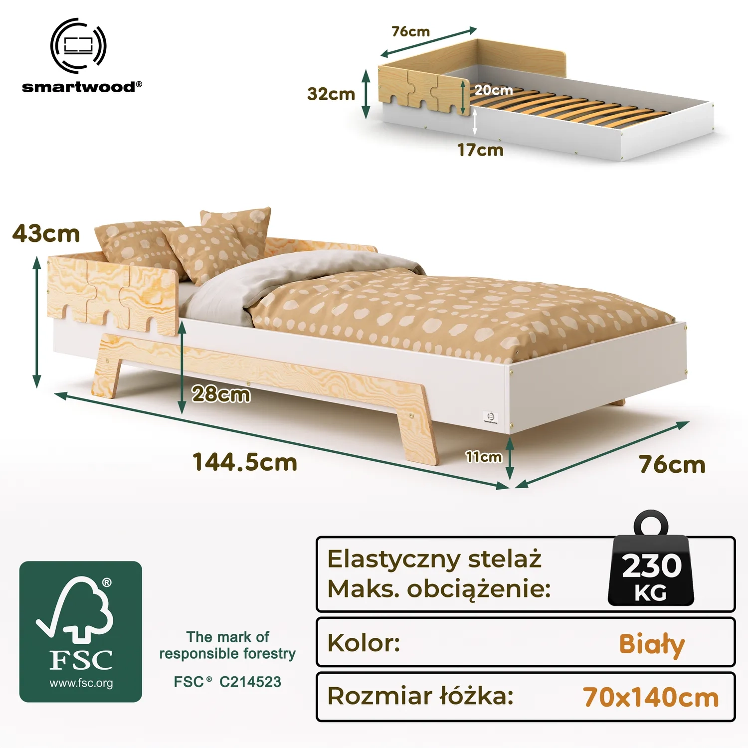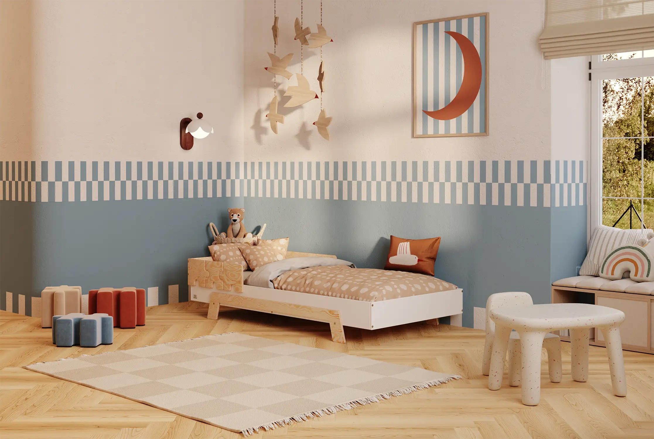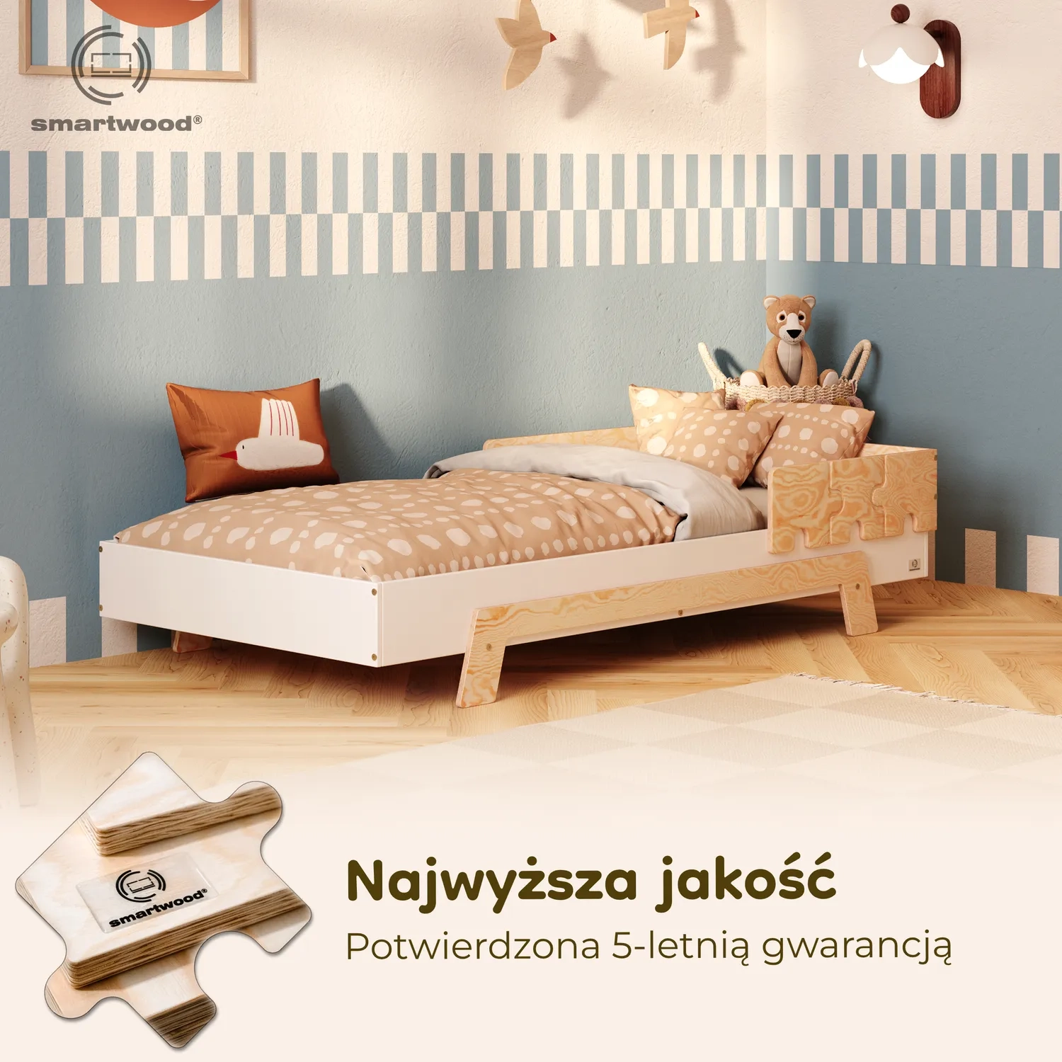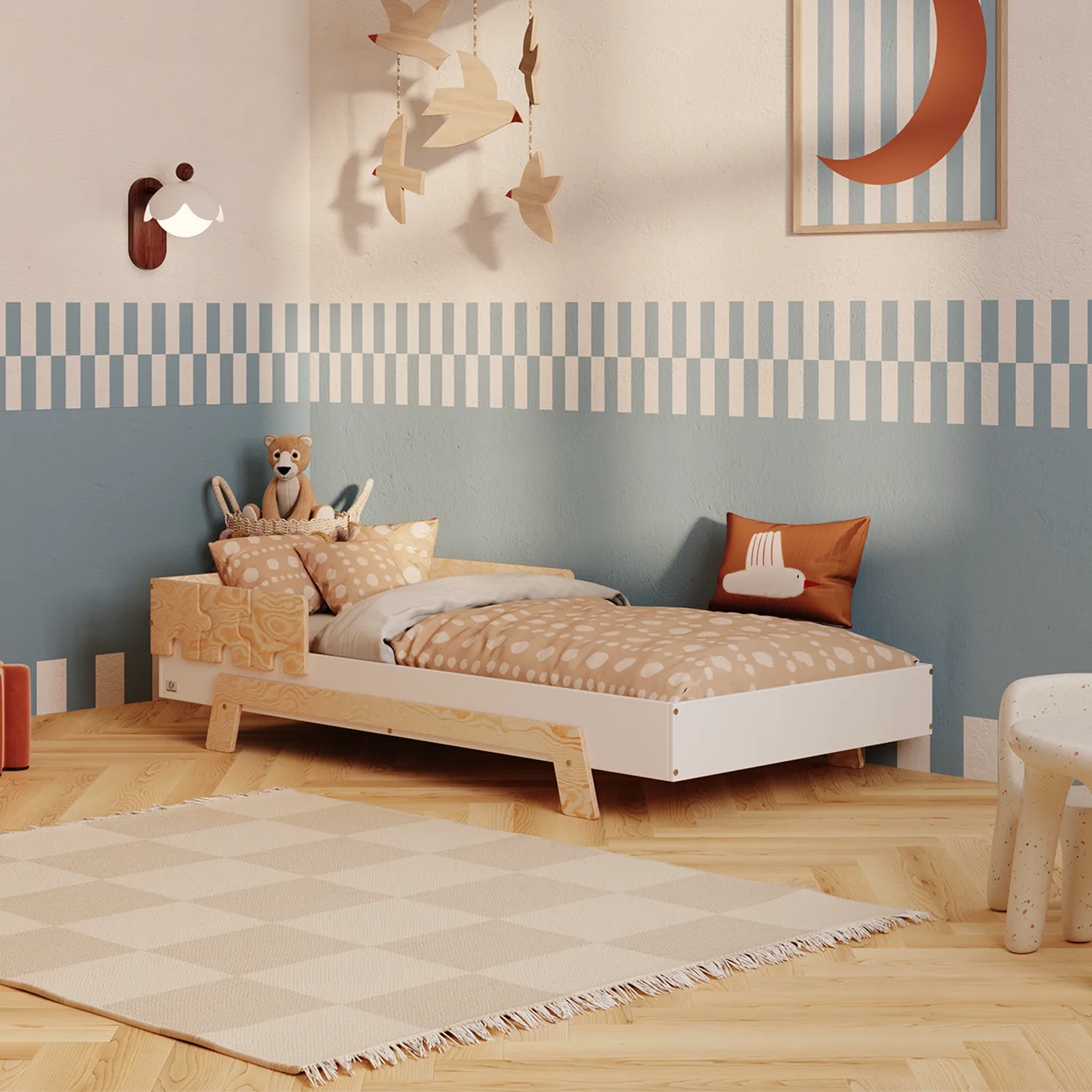 To propozycja dla rodziców, którzy stawiają na maksymalne bezpieczeństwo i wygodę. Podwyższony poziom spania oraz barierki w kształcie puzzli chronią dziecko przed wypadnięciem z łóżka, a jednocześnie tworzą wyjątkową, bajkową oprawę pokoju.