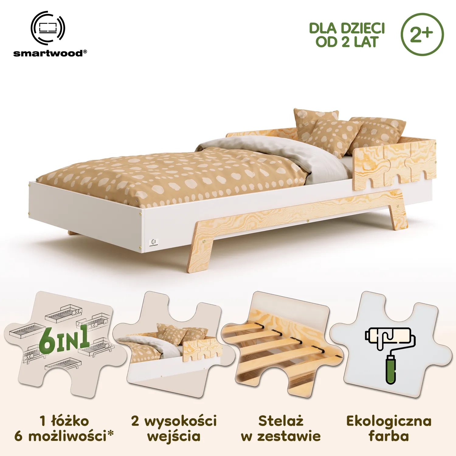 Dzięki przemyślanej konstrukcji możesz wybrać spośród 6 wariantów, różniących się liczbą barierek oraz wysokością łóżka. W praktyce oznacza to, że jedno łóżko może być zarówno bezpiecznym, podłogowym miejscem snu dla malucha, jak i „dorosłym” łóżkiem dla starszego dziecka.