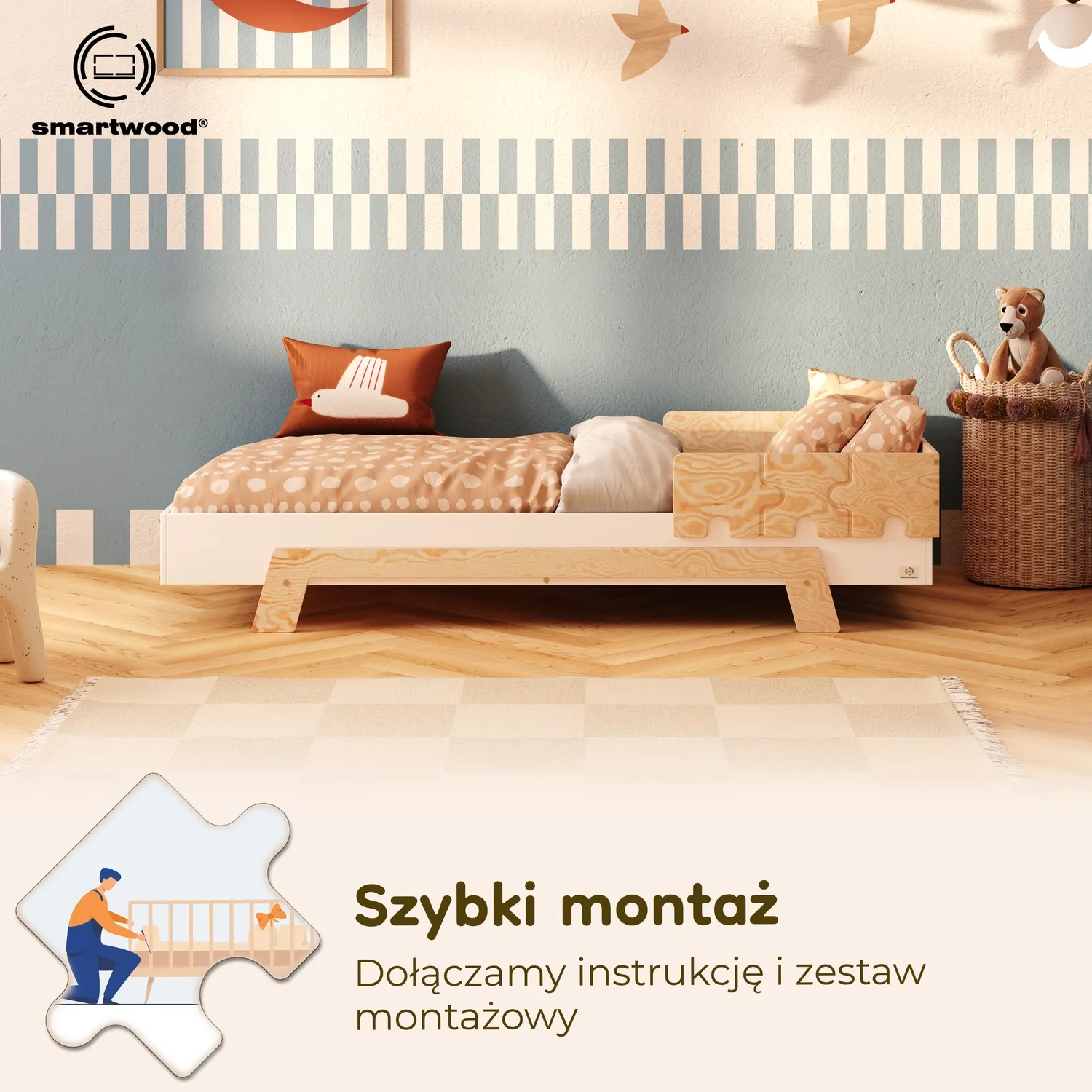 Łóżko pojedyncze dla dzieci z barierką i stelażem PUZZLE BR1 Montessori Drewniane