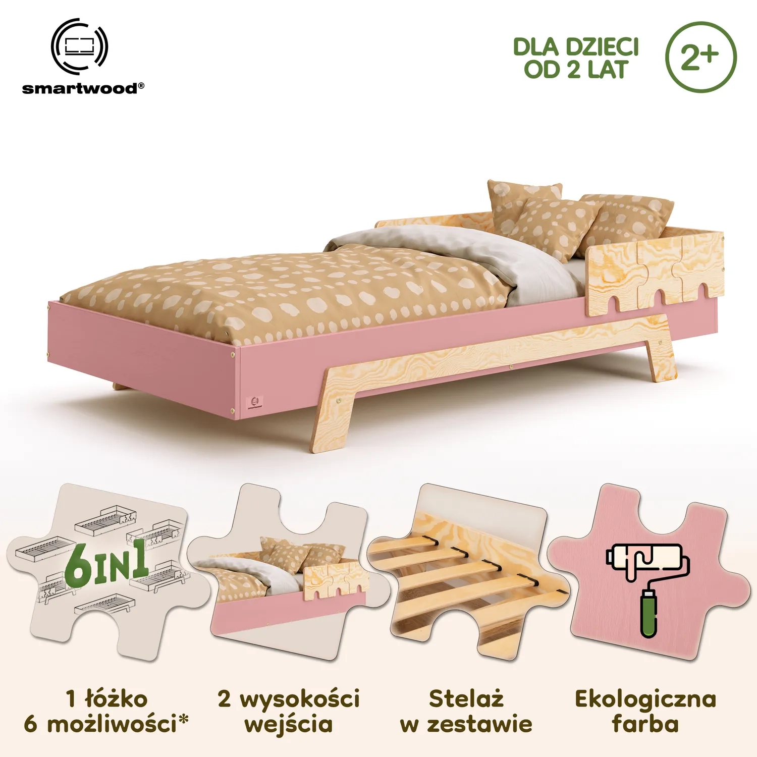 Dzięki przemyślanej konstrukcji możesz wybrać spośród 6 wariantów, różniących się liczbą barierek oraz wysokością łóżka. W praktyce oznacza to, że jedno łóżko może być zarówno bezpiecznym, podłogowym miejscem snu dla malucha, jak i „dorosłym” łóżkiem dla starszego dziecka.