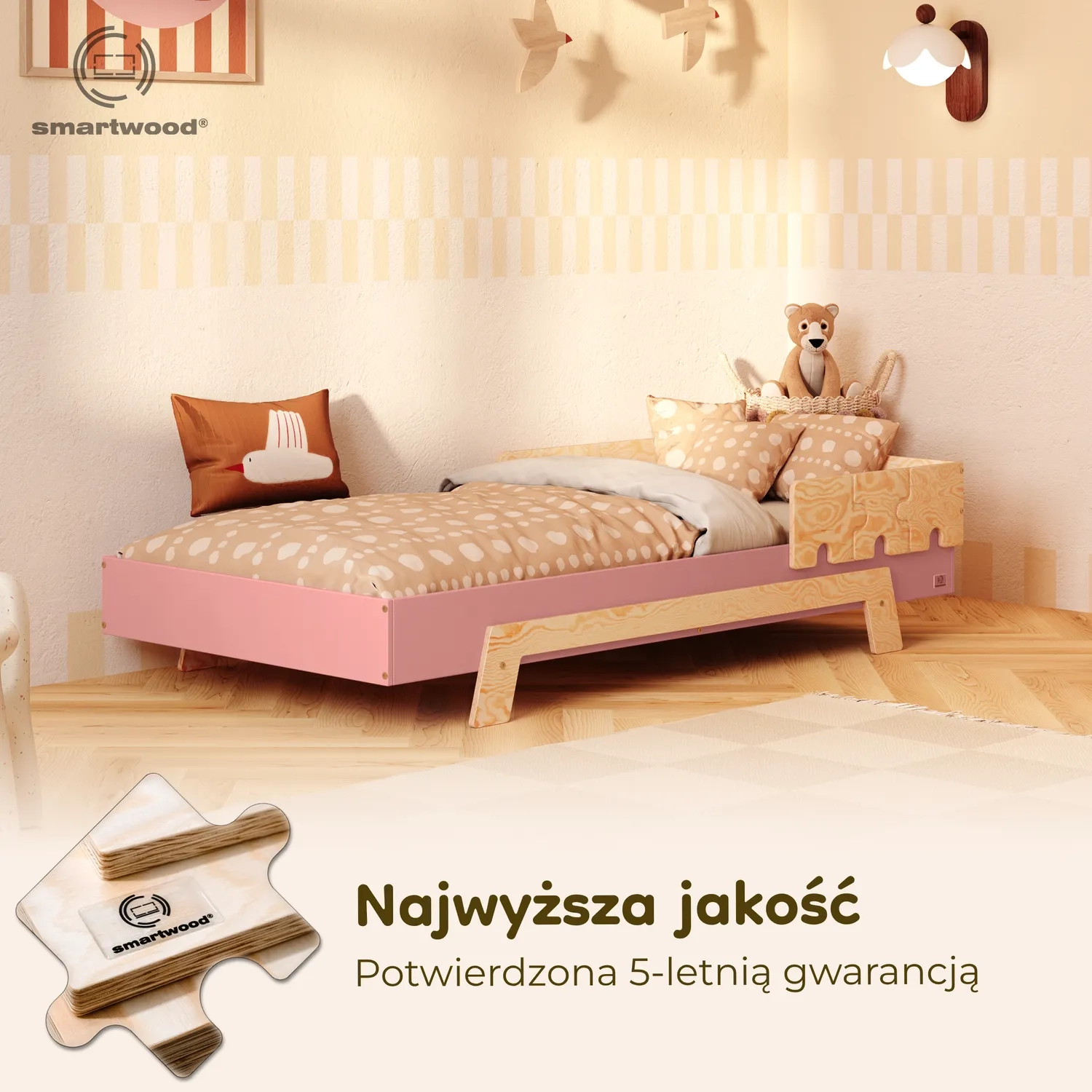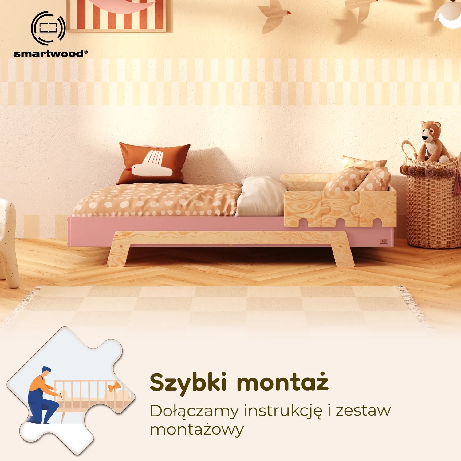 Łóżko pojedyncze dla dzieci z barierką i stelażem PUZZLE BR1 Montessori Drewniane