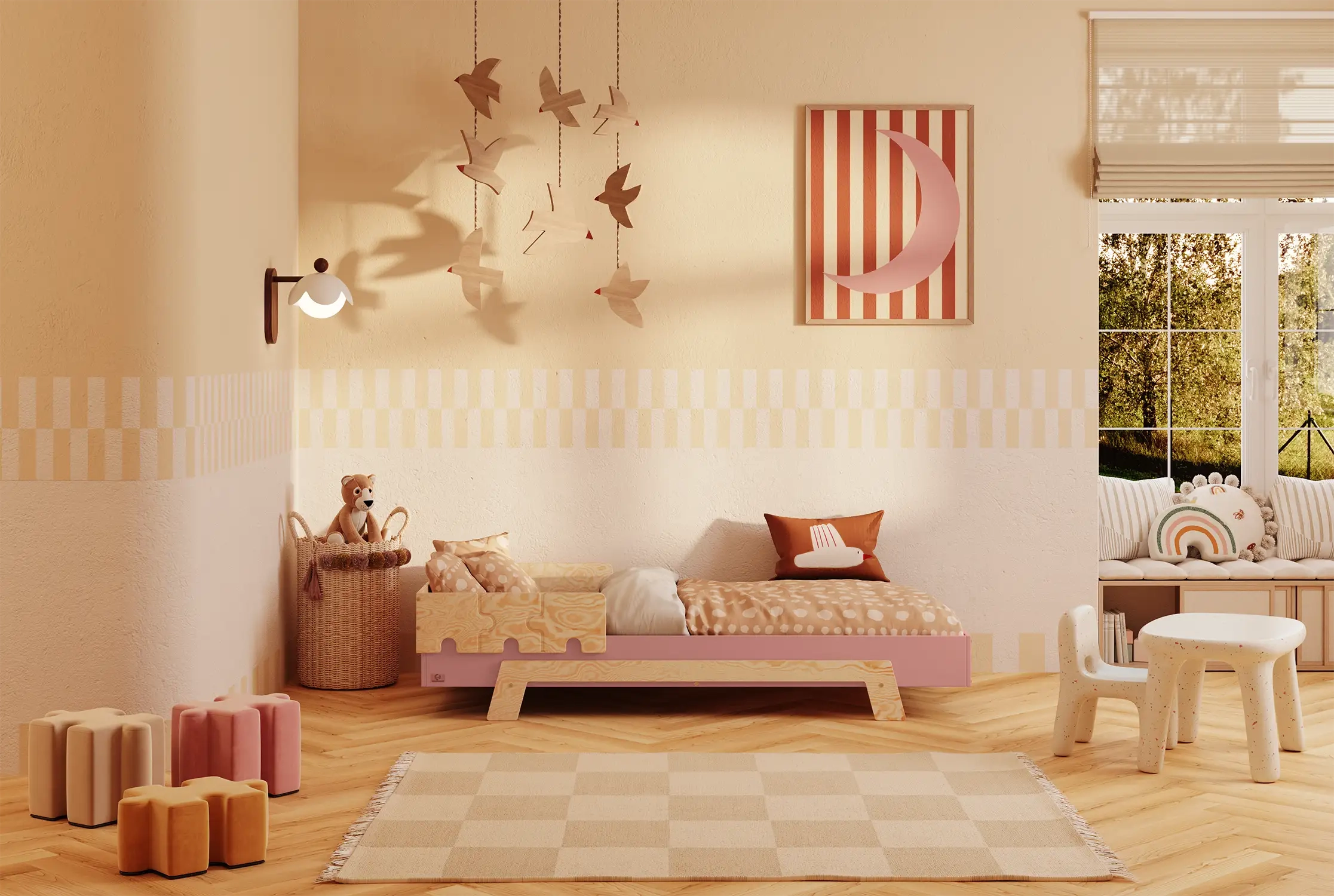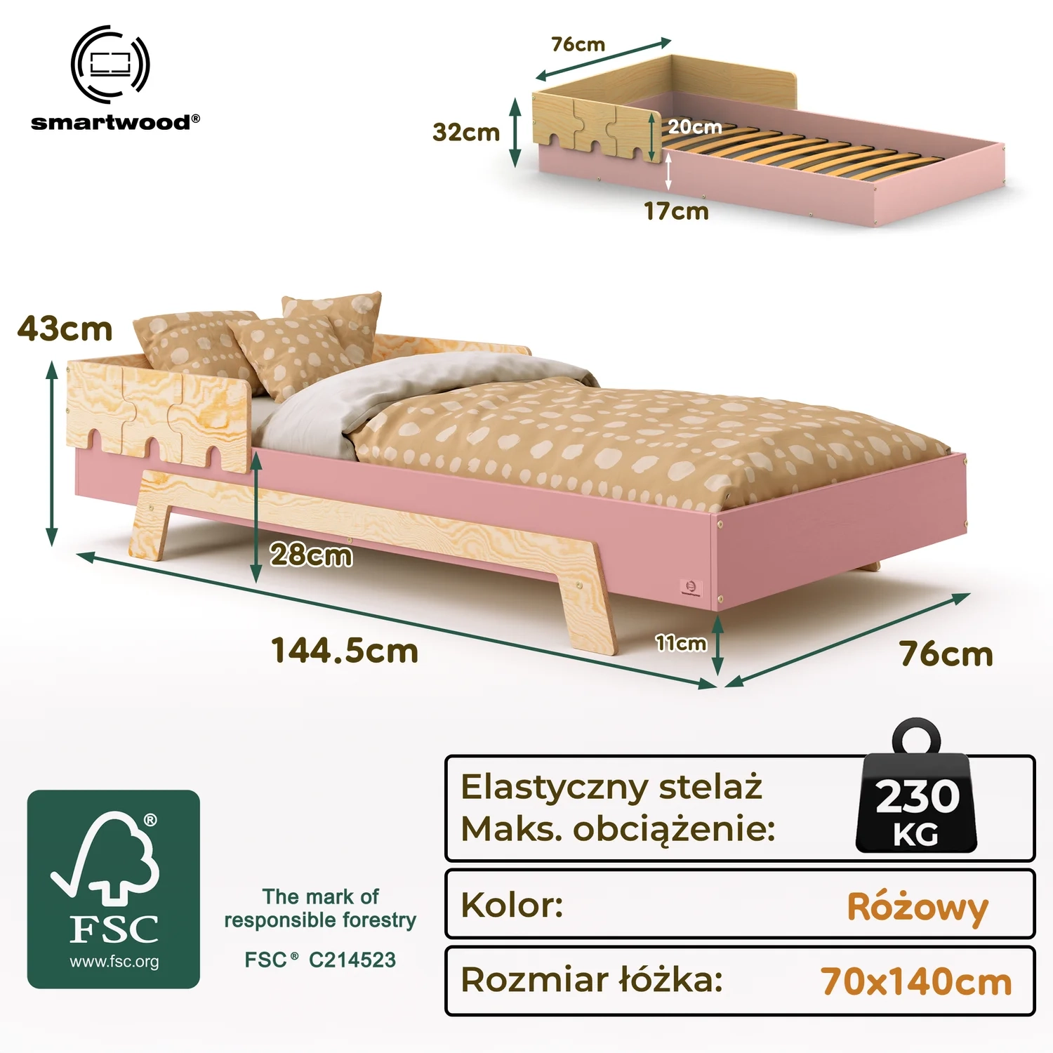 To propozycja dla rodziców, którzy stawiają na maksymalne bezpieczeństwo i wygodę. Podwyższony poziom spania oraz barierki w kształcie puzzli chronią dziecko przed wypadnięciem z łóżka, a jednocześnie tworzą wyjątkową, bajkową oprawę pokoju.