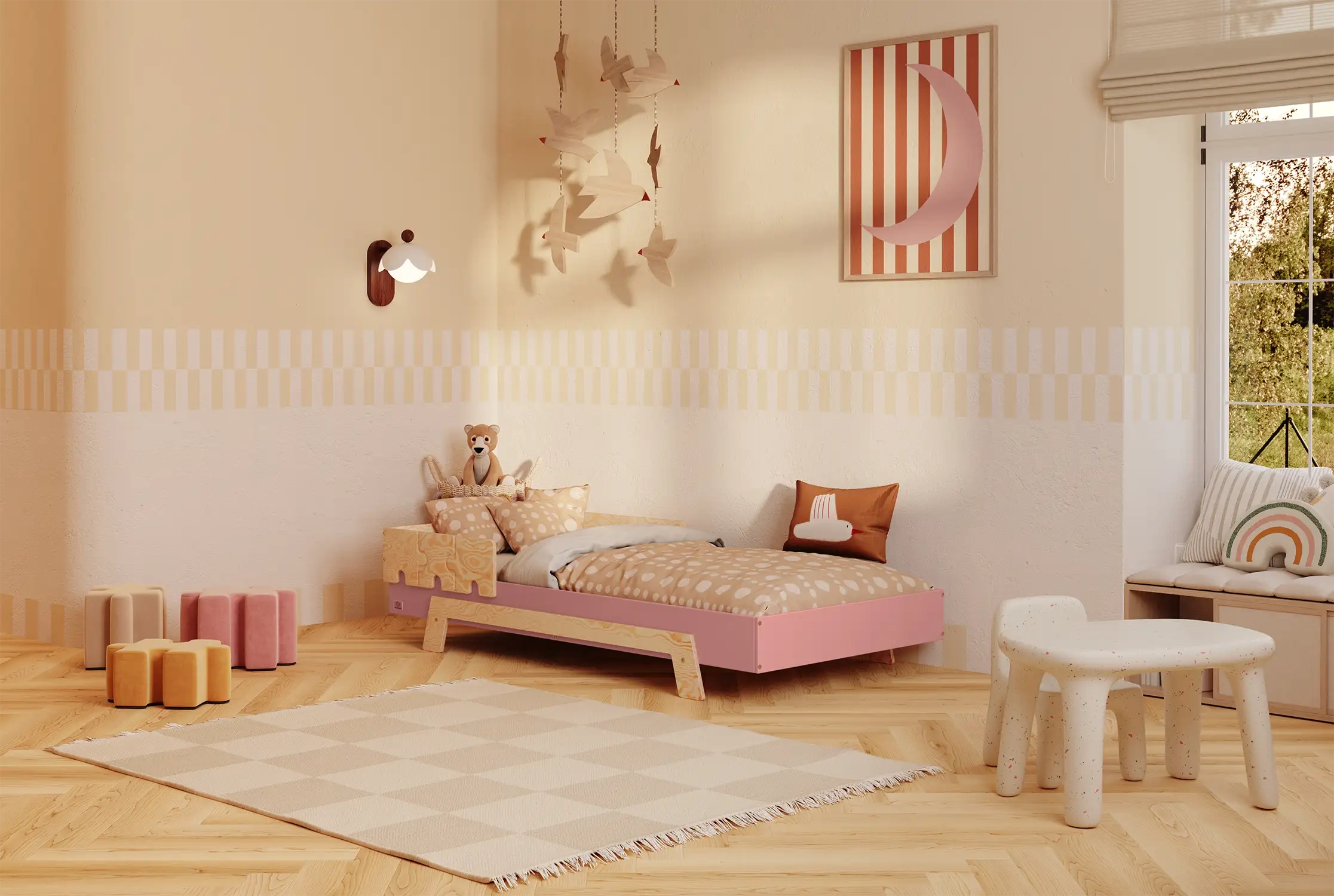 Świetna baza do stworzenia minimalistycznego kącika do spania lub strefy relaksu. Niska konstrukcja nadal sprzyja bezpieczeństwu, ale daje pełną swobodę ruchu.