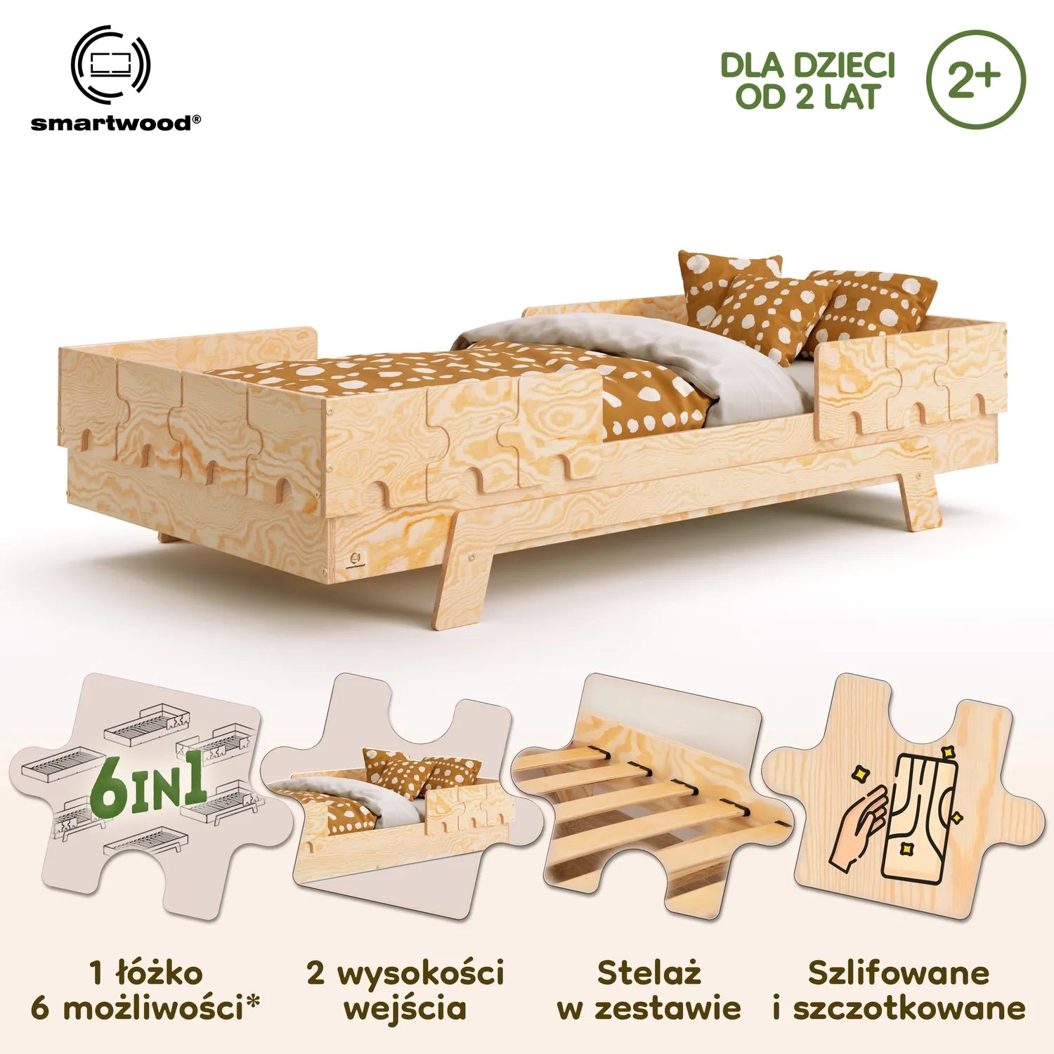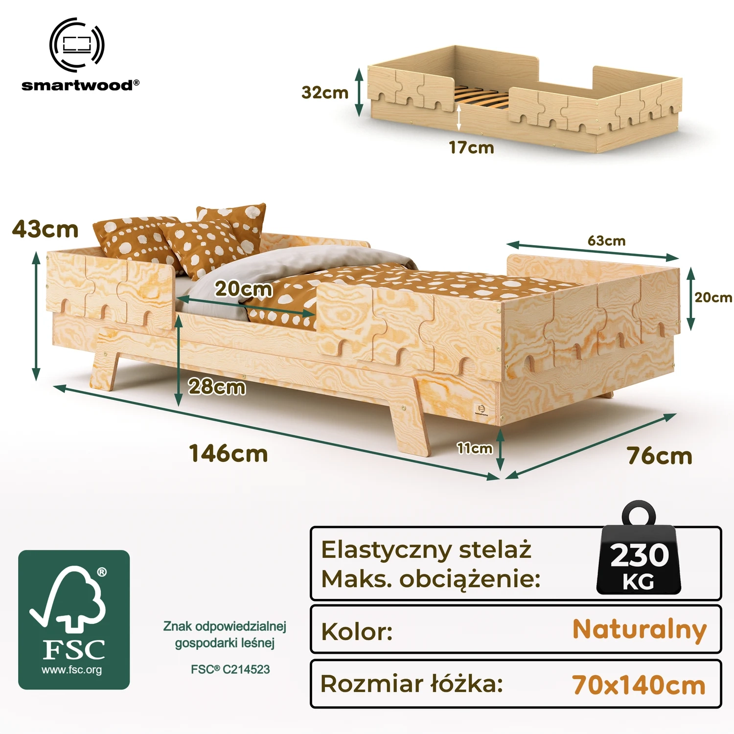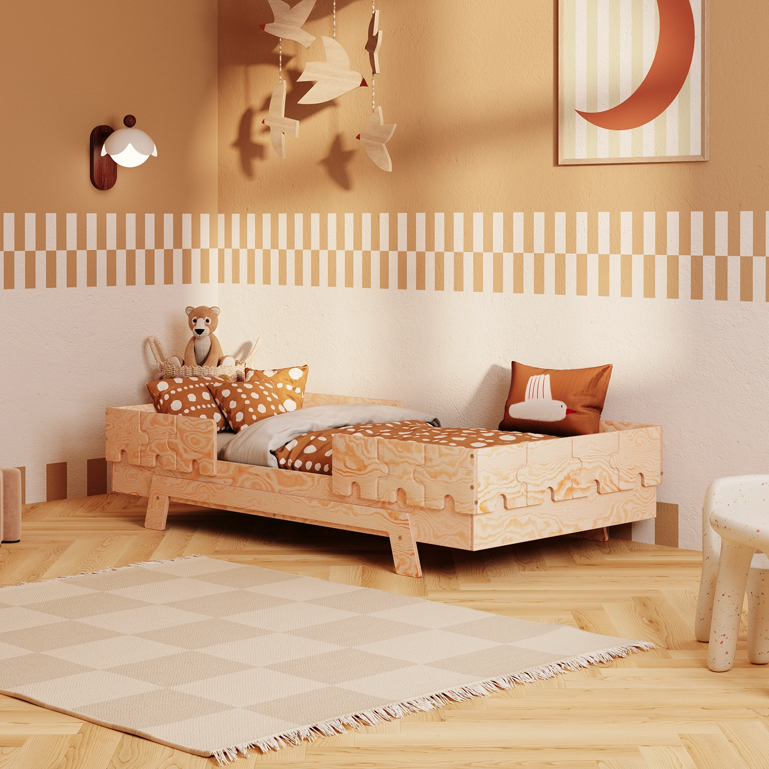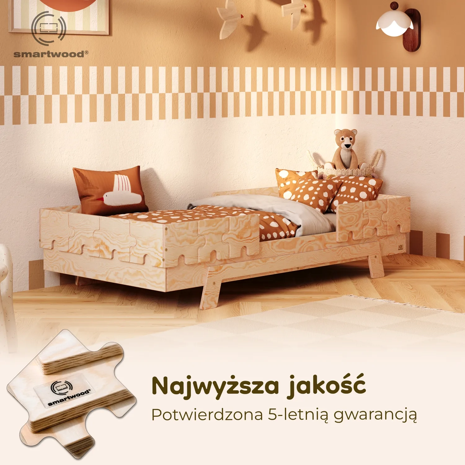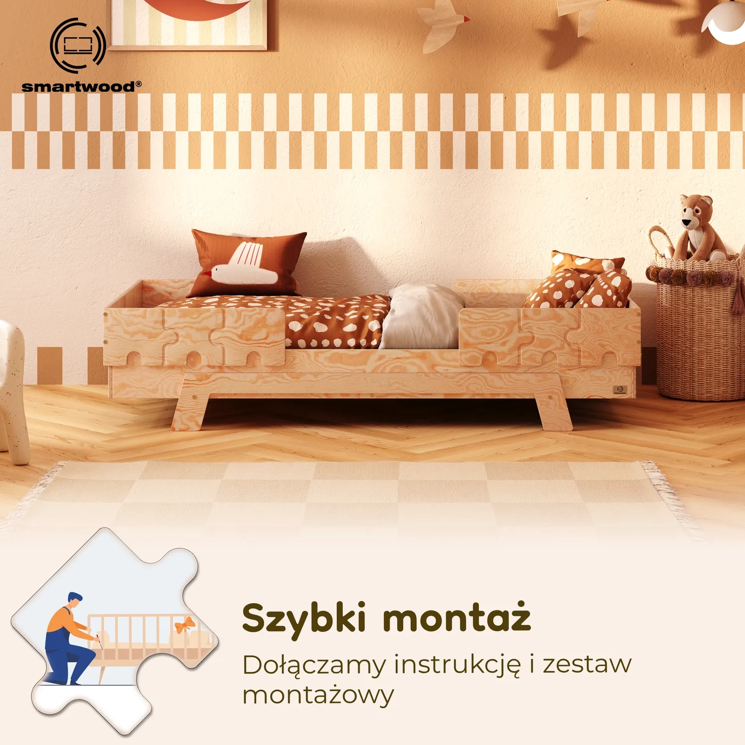 Łóżko pojedyncze dla dzieci z barierkami i stelażem PUZZLE BR2 Montessori Drewniane