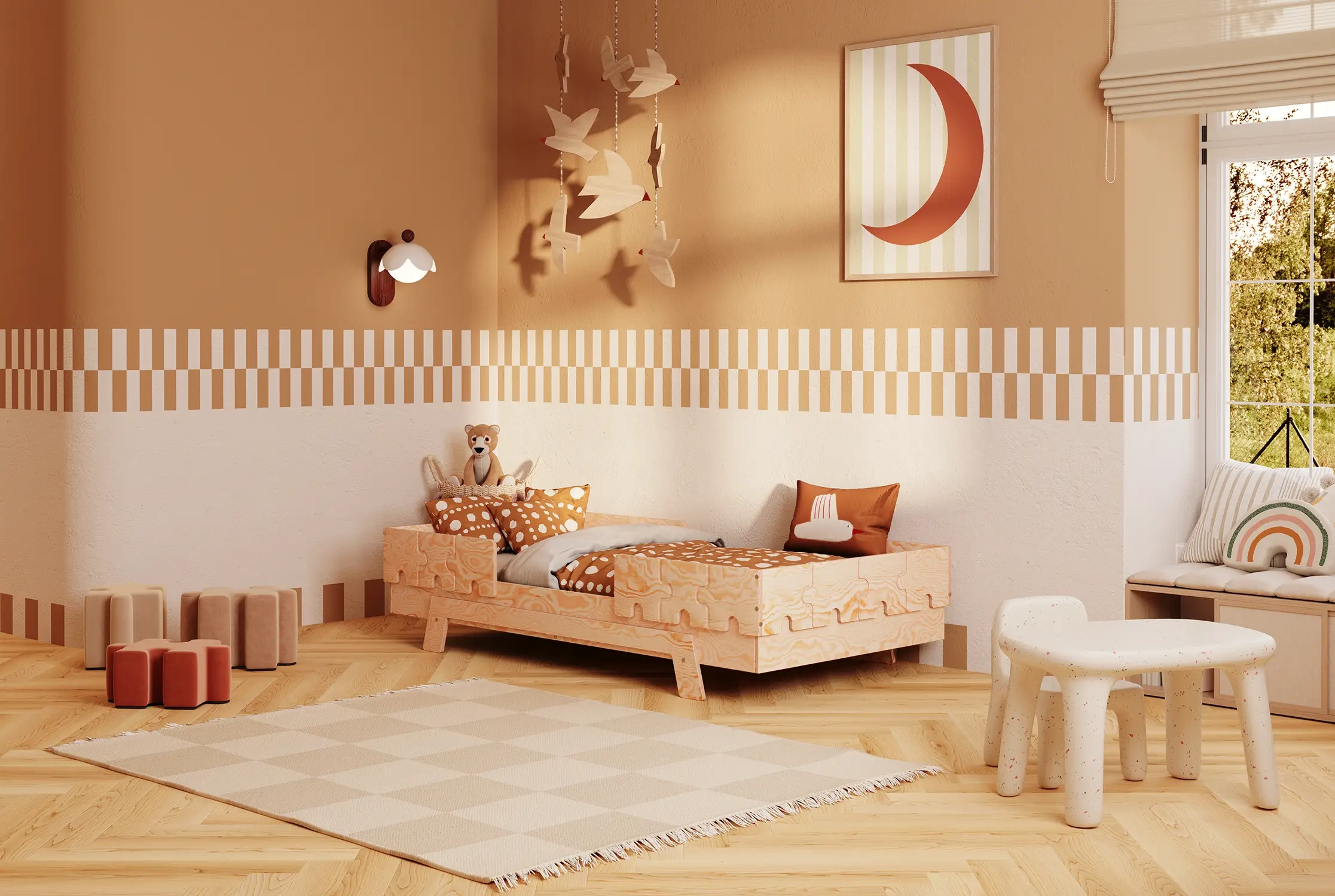 Świetna baza do stworzenia minimalistycznego kącika do spania lub strefy relaksu. Niska konstrukcja nadal sprzyja bezpieczeństwu, ale daje pełną swobodę ruchu.