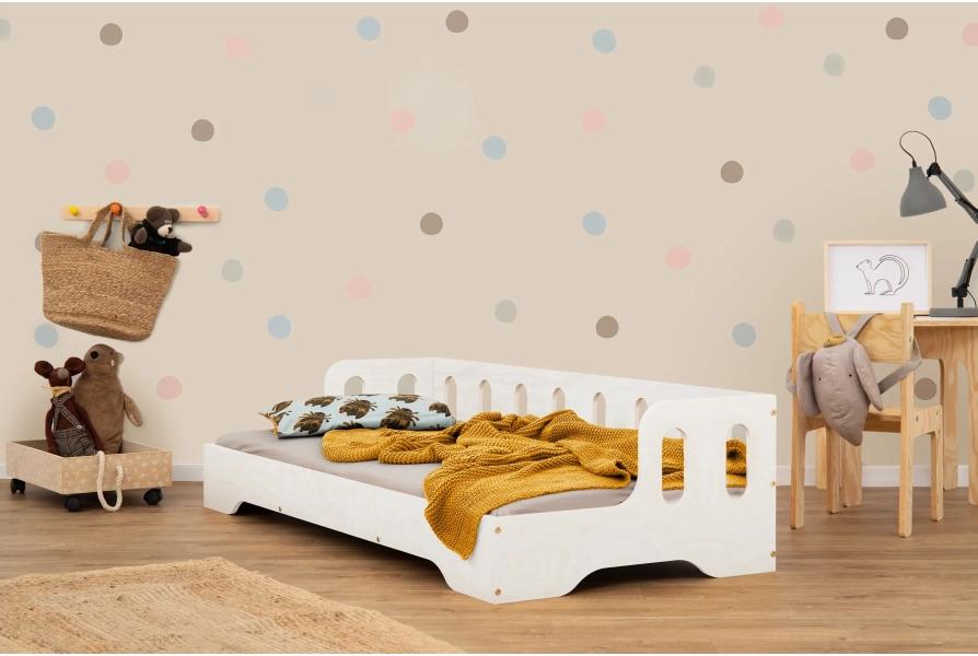 Łóżko pojedyncze dla dzieci z barierką i stelażem sofa TILA 1S Montessori Drewniane