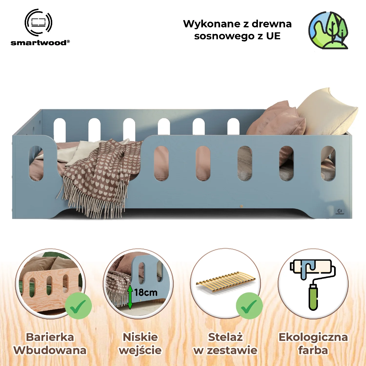 Łóżko pojedyncze dla dzieci z barierką i stelażem TILA 2 Montessori Drewniane