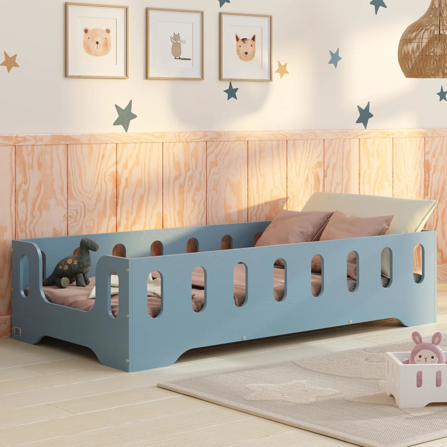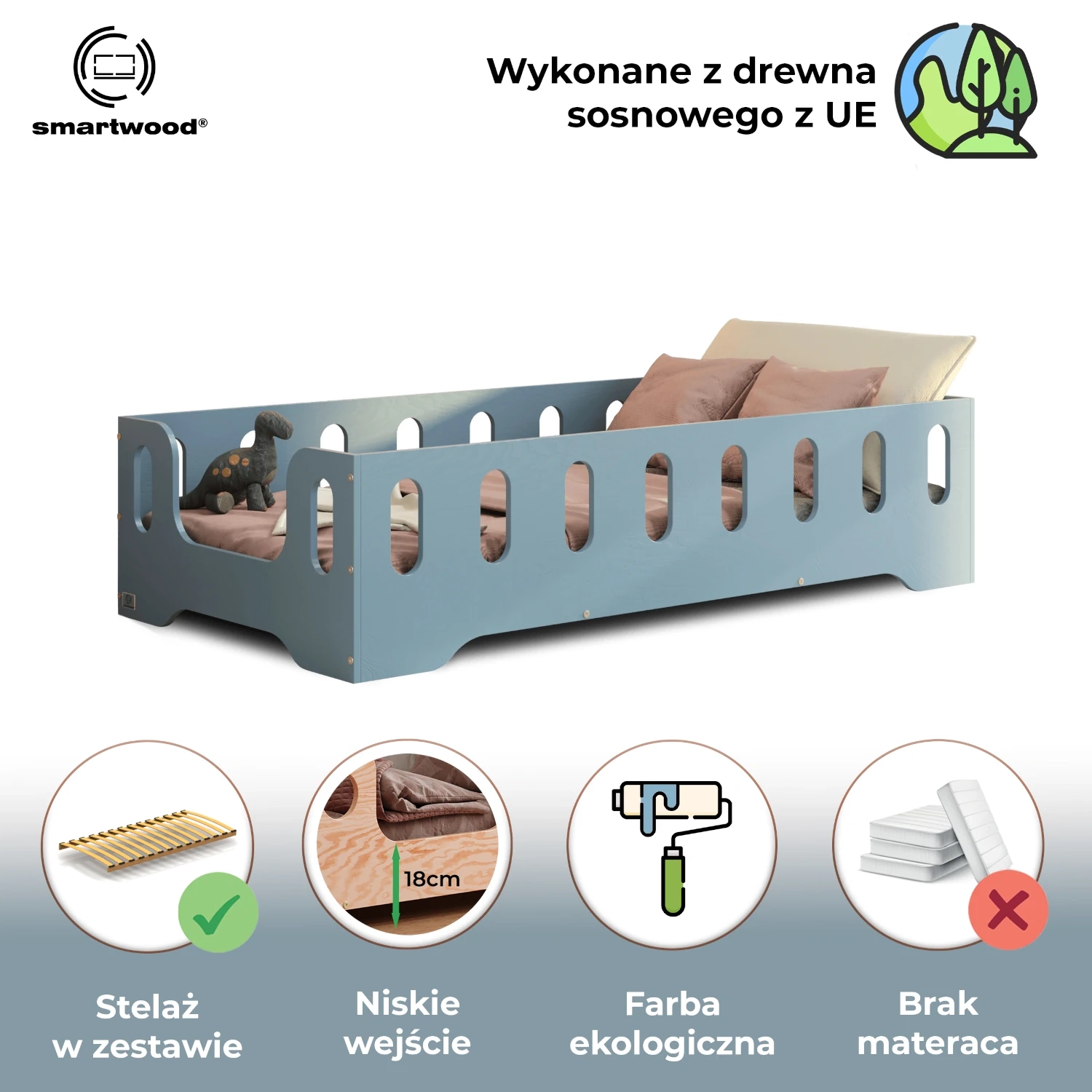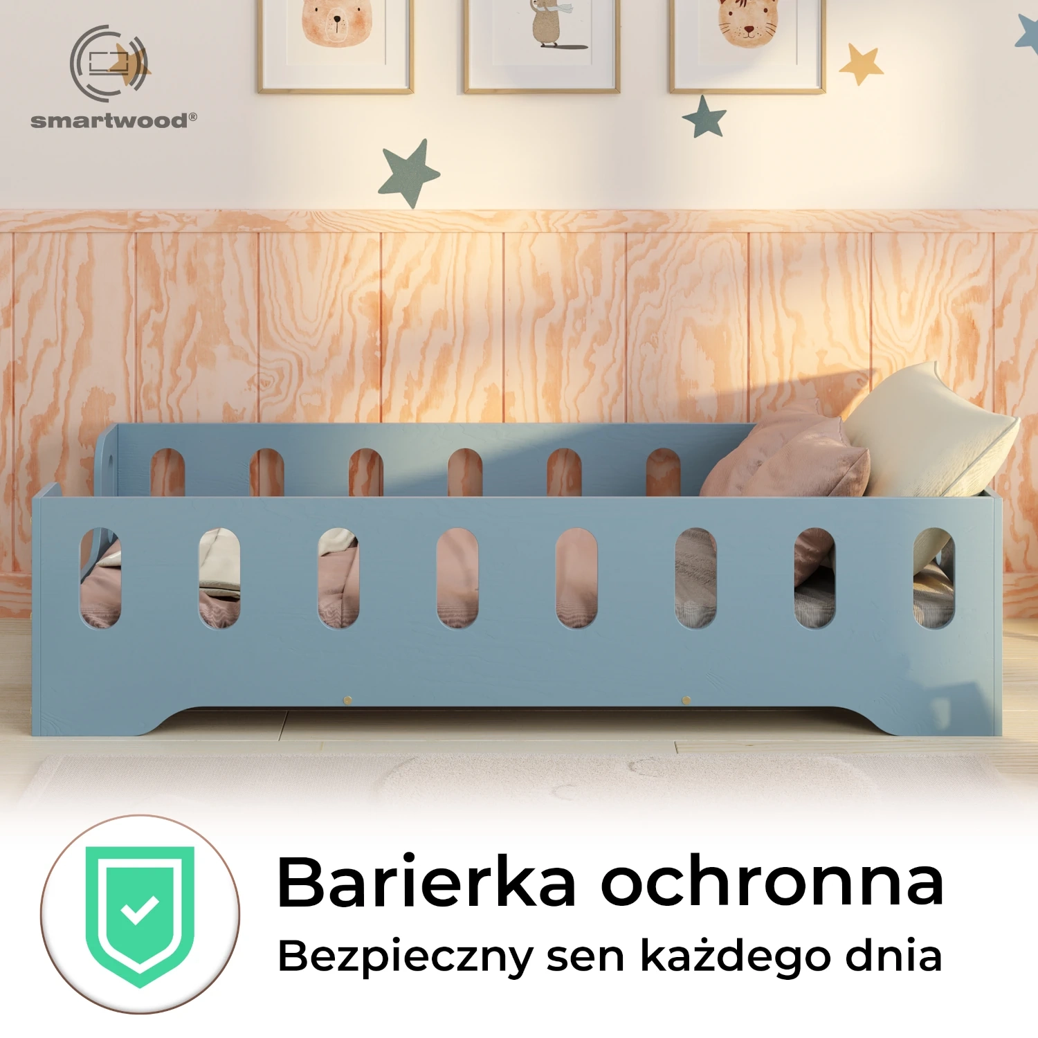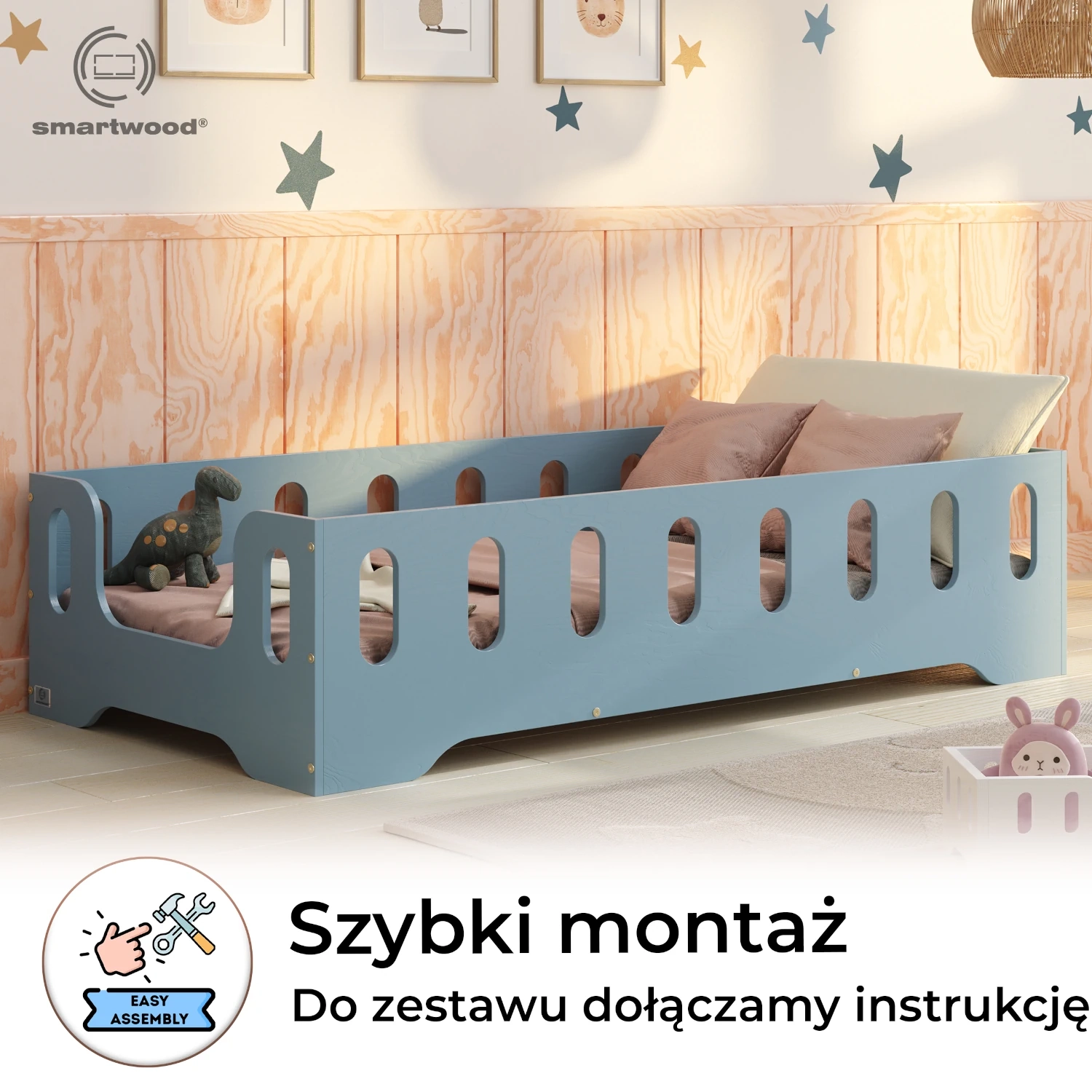 Łóżko pojedyncze dla dzieci z barierką i stelażem TILA 2 Montessori Drewniane
