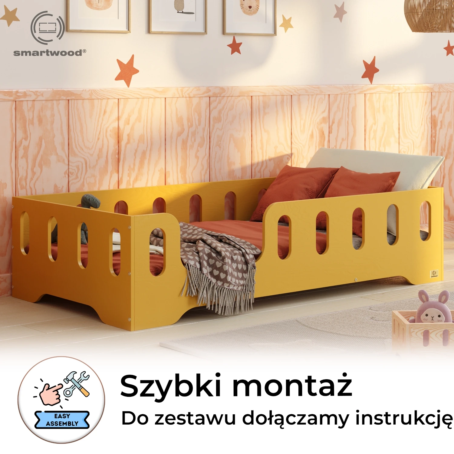 Łóżko pojedyncze dla dzieci z barierką i stelażem TILA 2 Montessori Drewniane