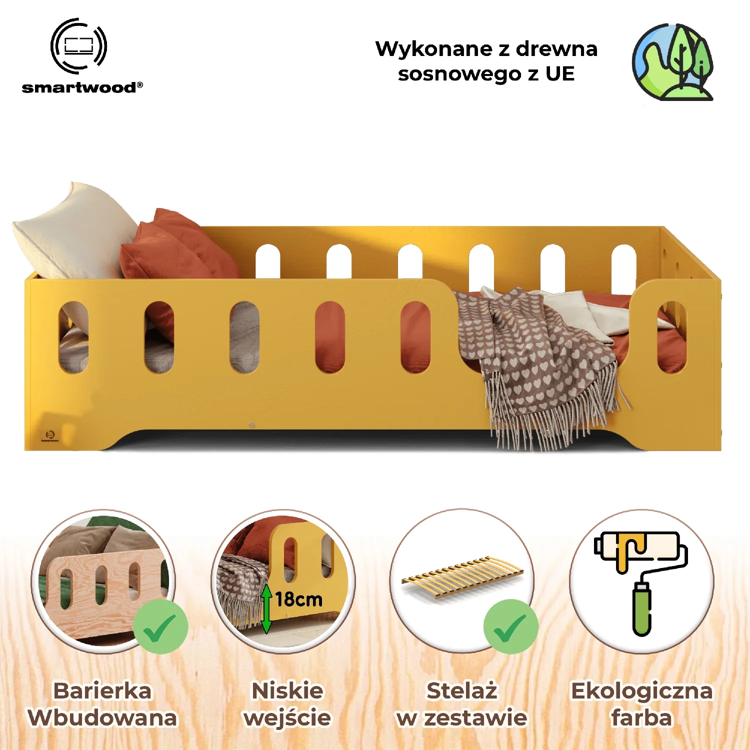Łóżko pojedyncze dla dzieci z barierką i stelażem TILA 2 Montessori Drewniane