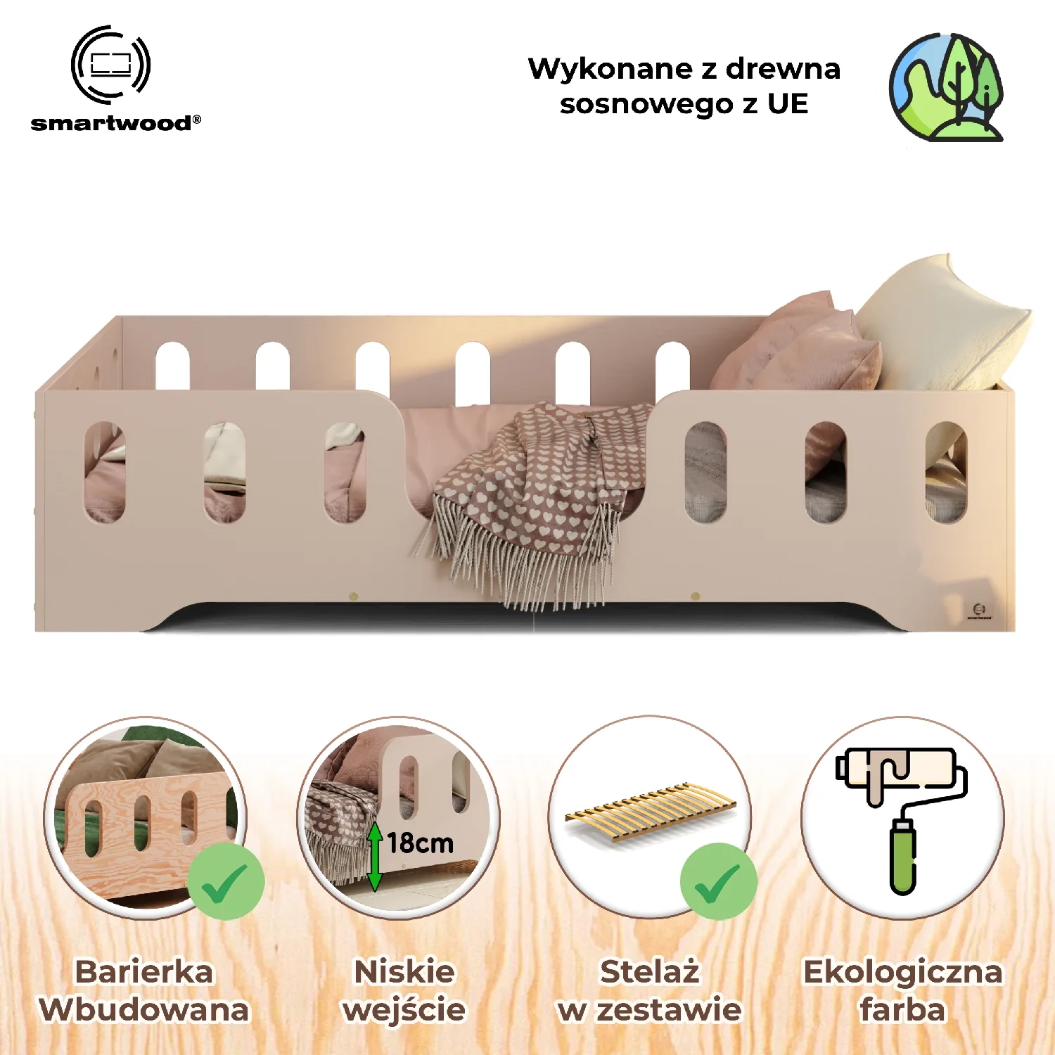 Łóżko pojedyncze dla dzieci z barierką i stelażem TILA 2 Montessori Drewniane