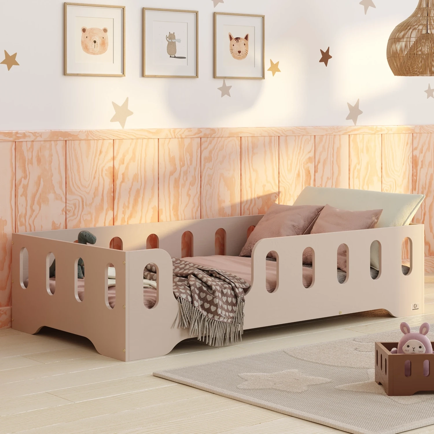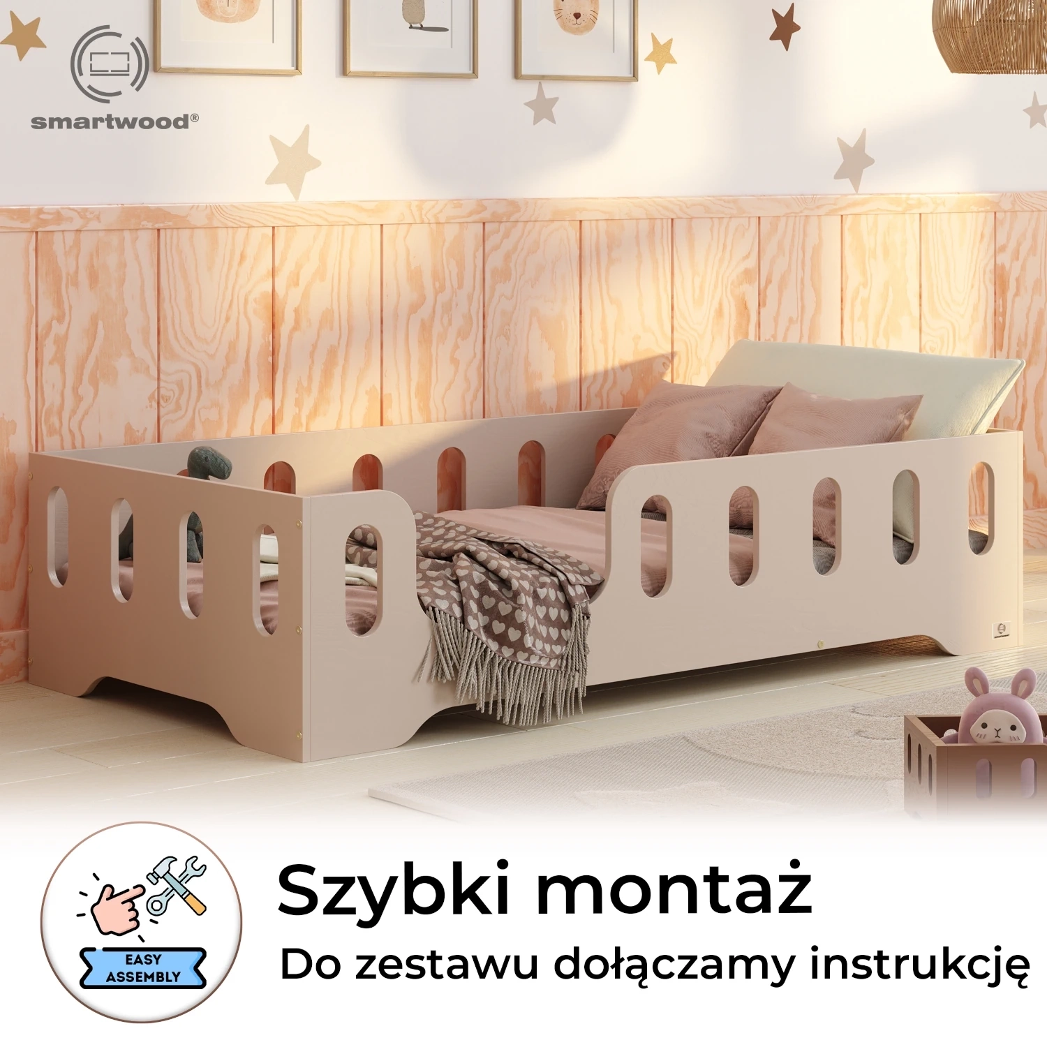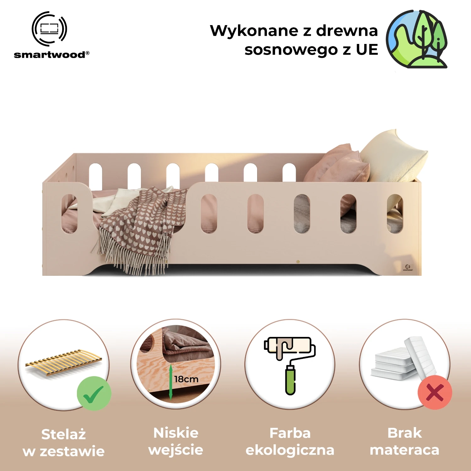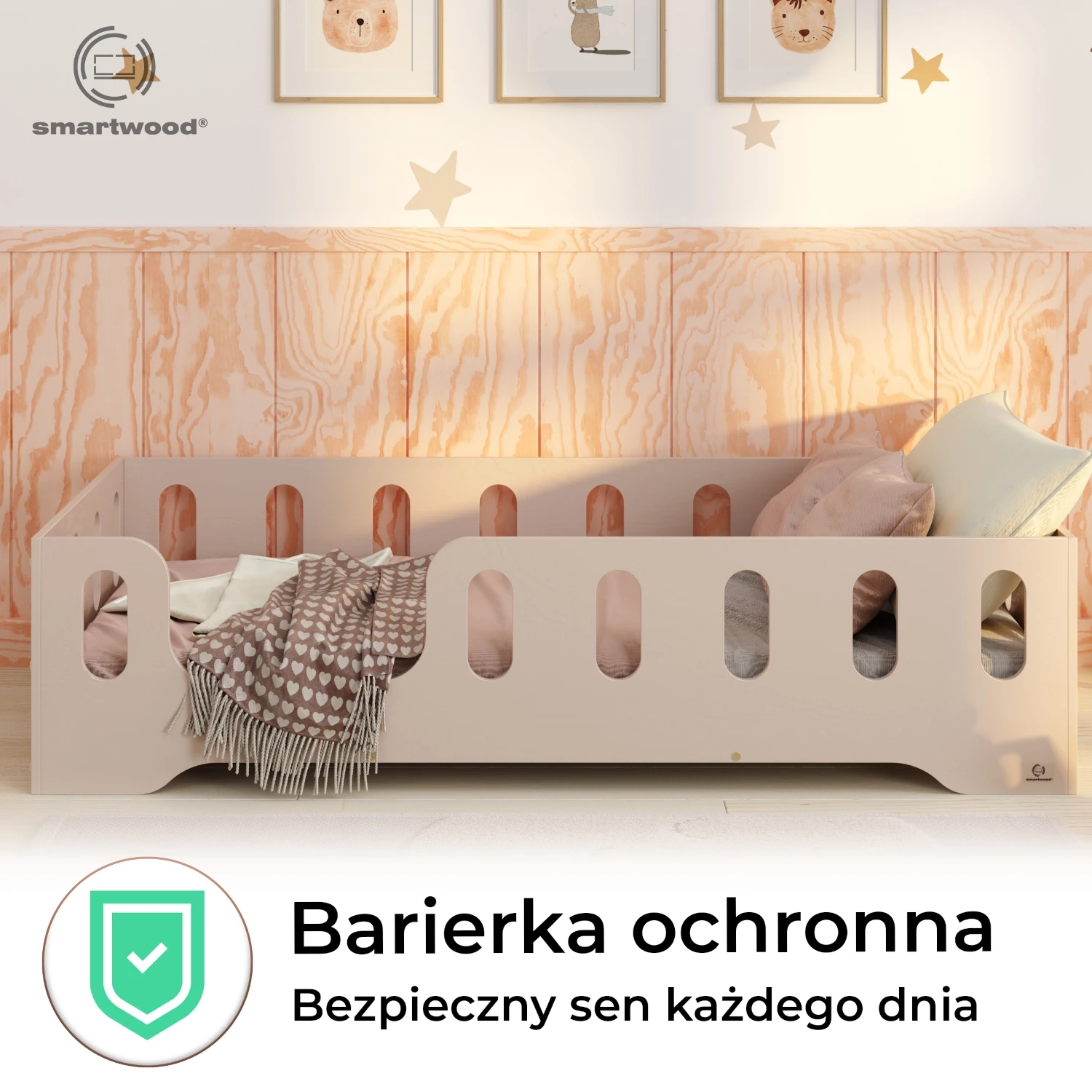 Łóżko pojedyncze dla dzieci z barierką i stelażem TILA 2 Montessori Drewniane