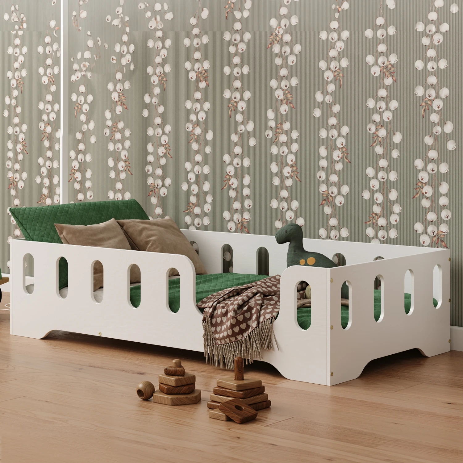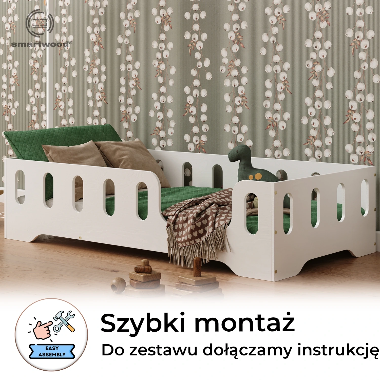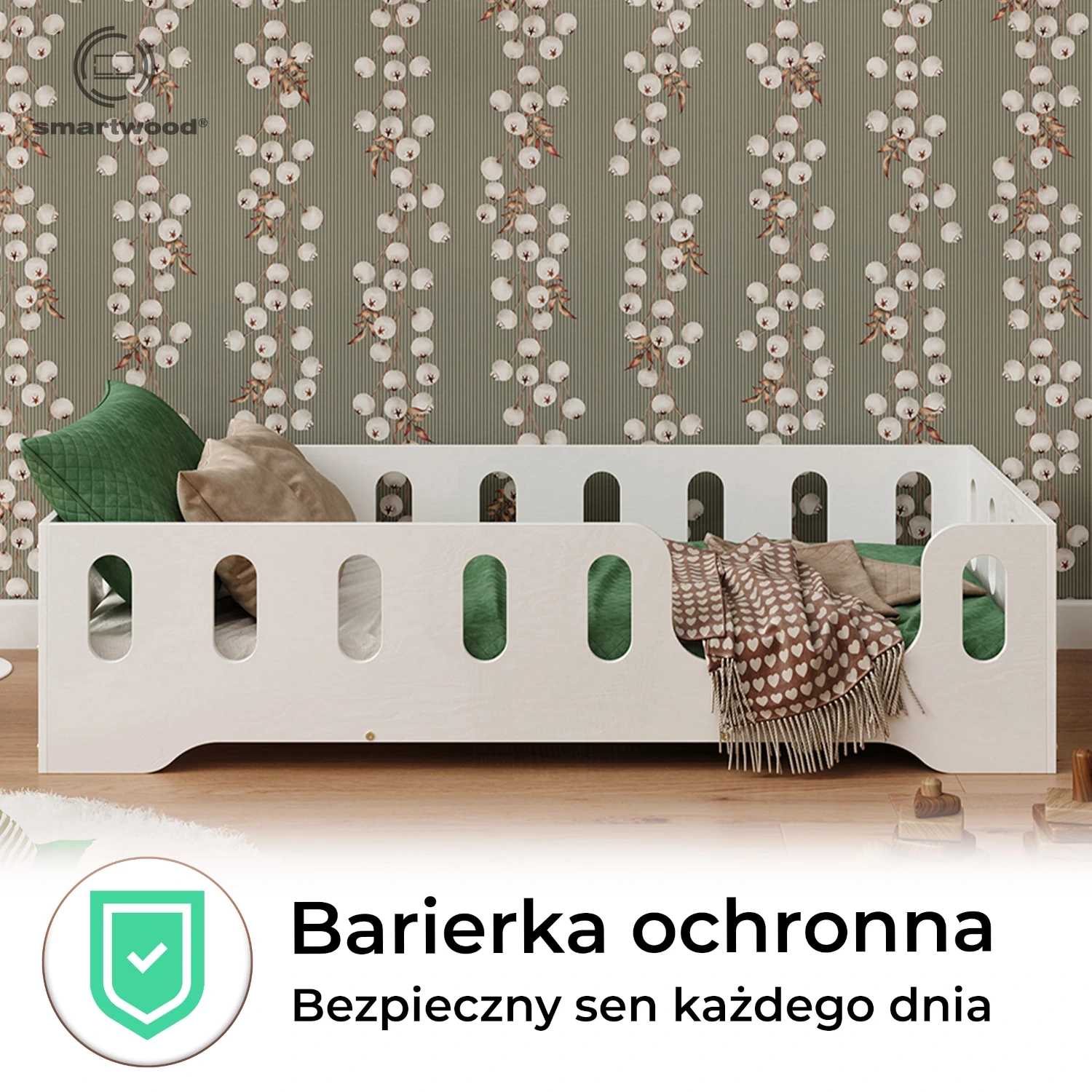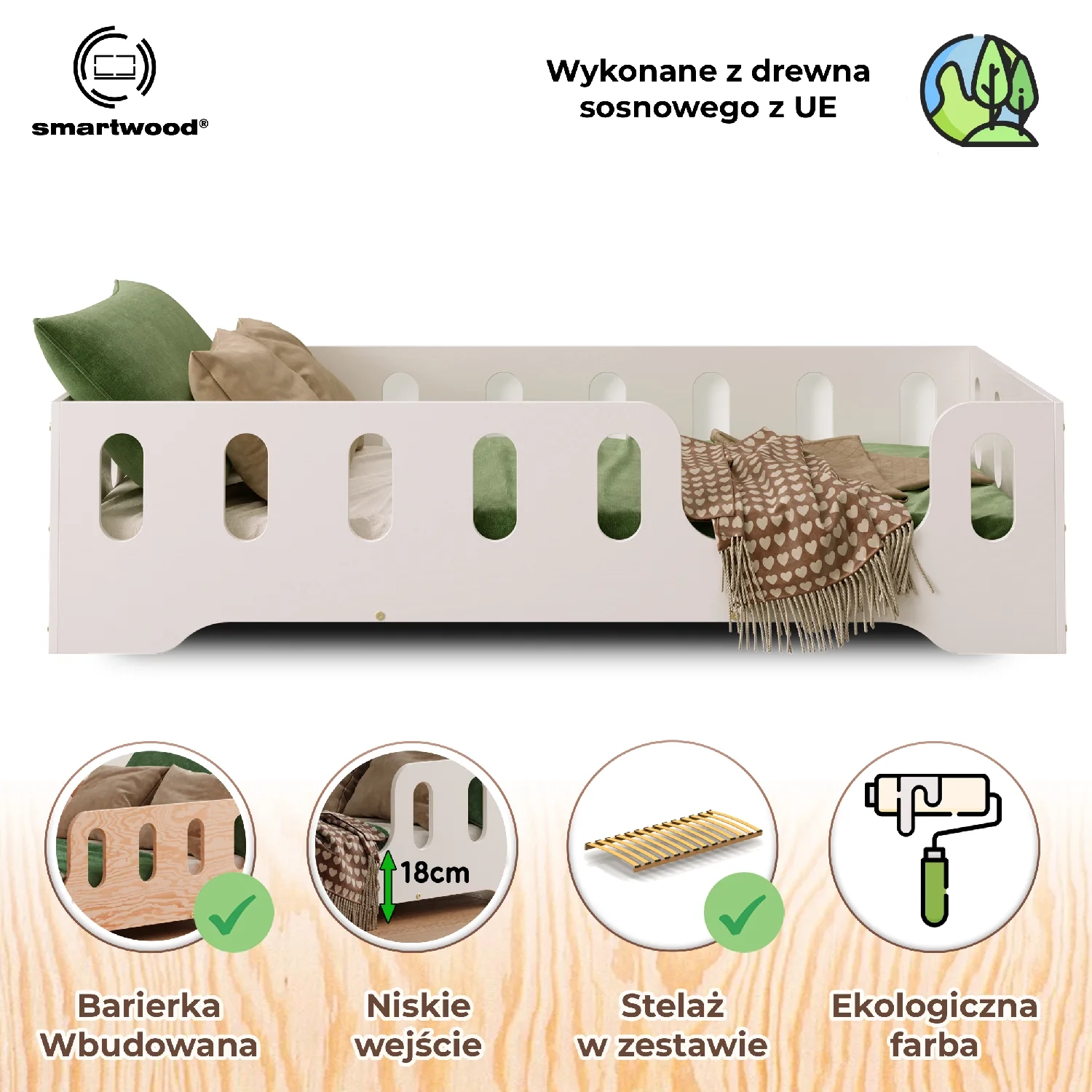 Łóżko pojedyncze dla dzieci z barierką i stelażem TILA 2 Montessori Drewniane