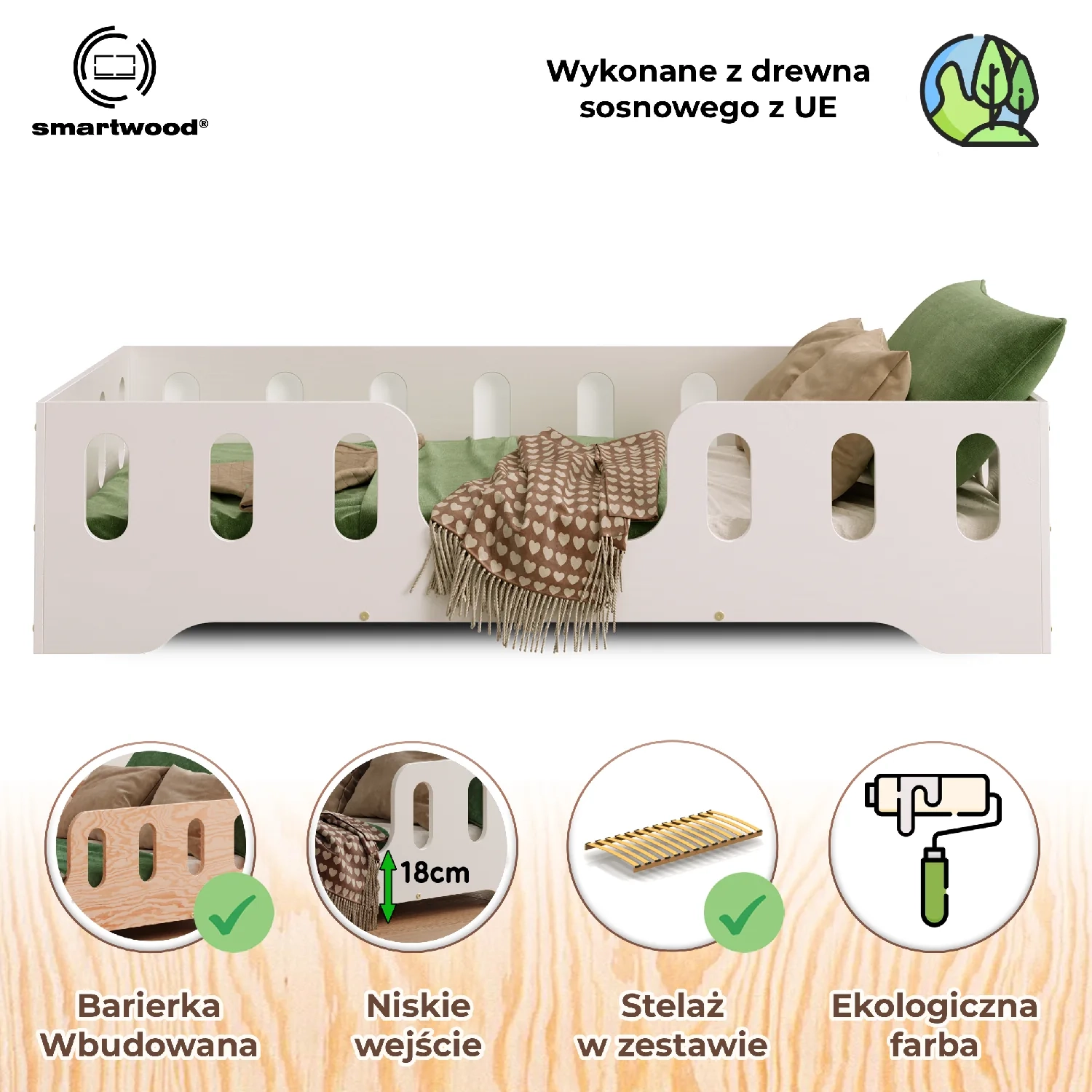 Łóżko pojedyncze dla dzieci z barierką i stelażem TILA 2 Montessori Drewniane