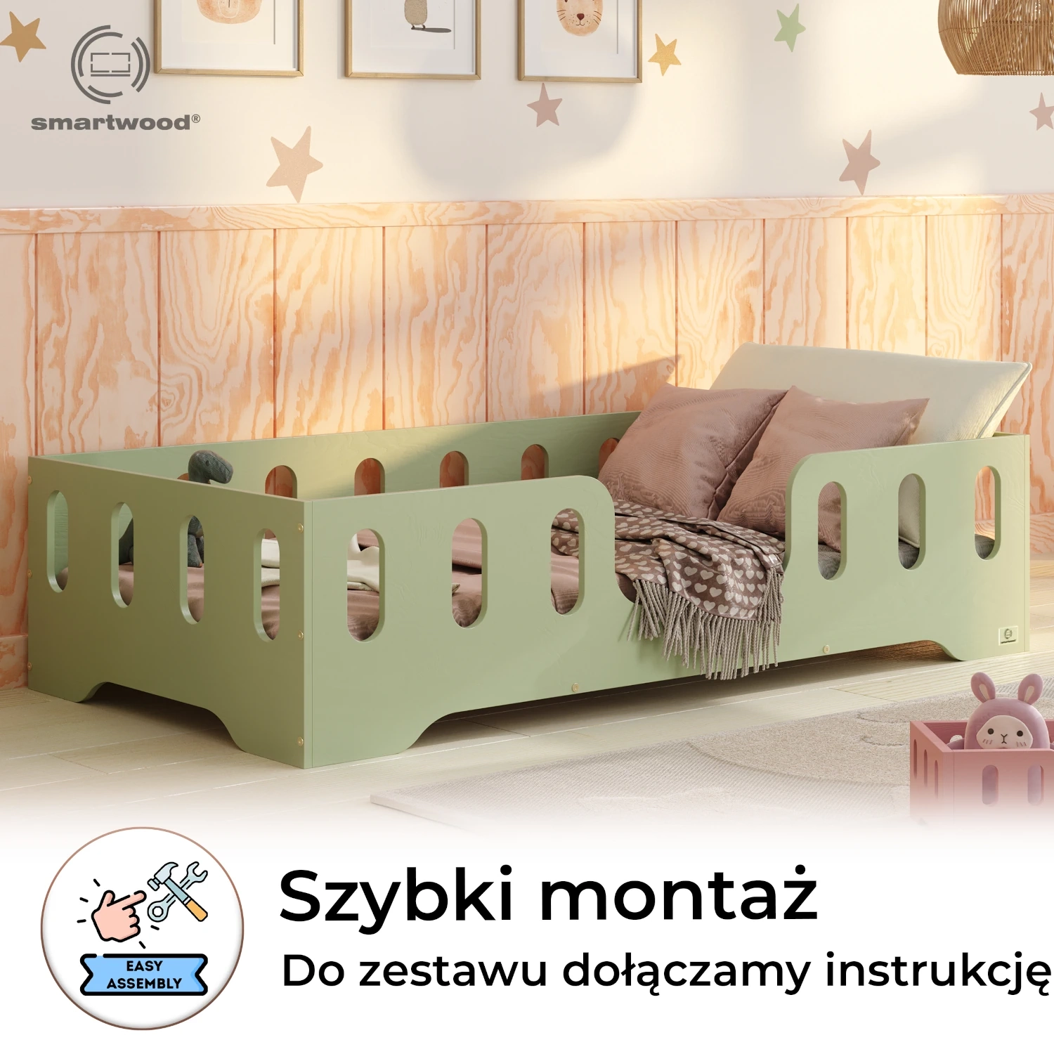 Łóżko pojedyncze dla dzieci z barierką i stelażem TILA 2 Montessori Drewniane