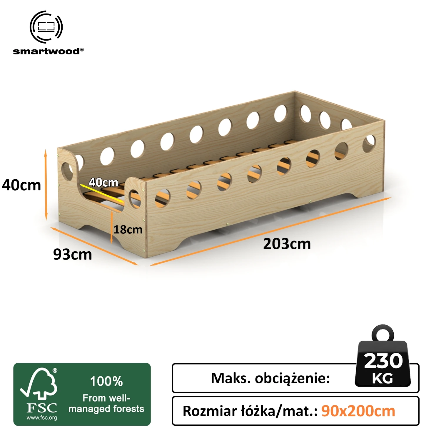 Łóżko pojedyncze dla dzieci z barierką i stelażem TILA 4 Montessori Drewniane