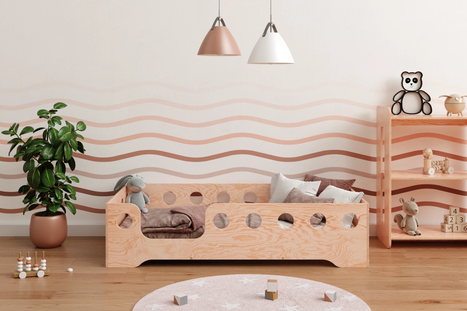 Łóżko pojedyncze dla dzieci z barierką i stelażem TILA 4 Montessori Drewniane