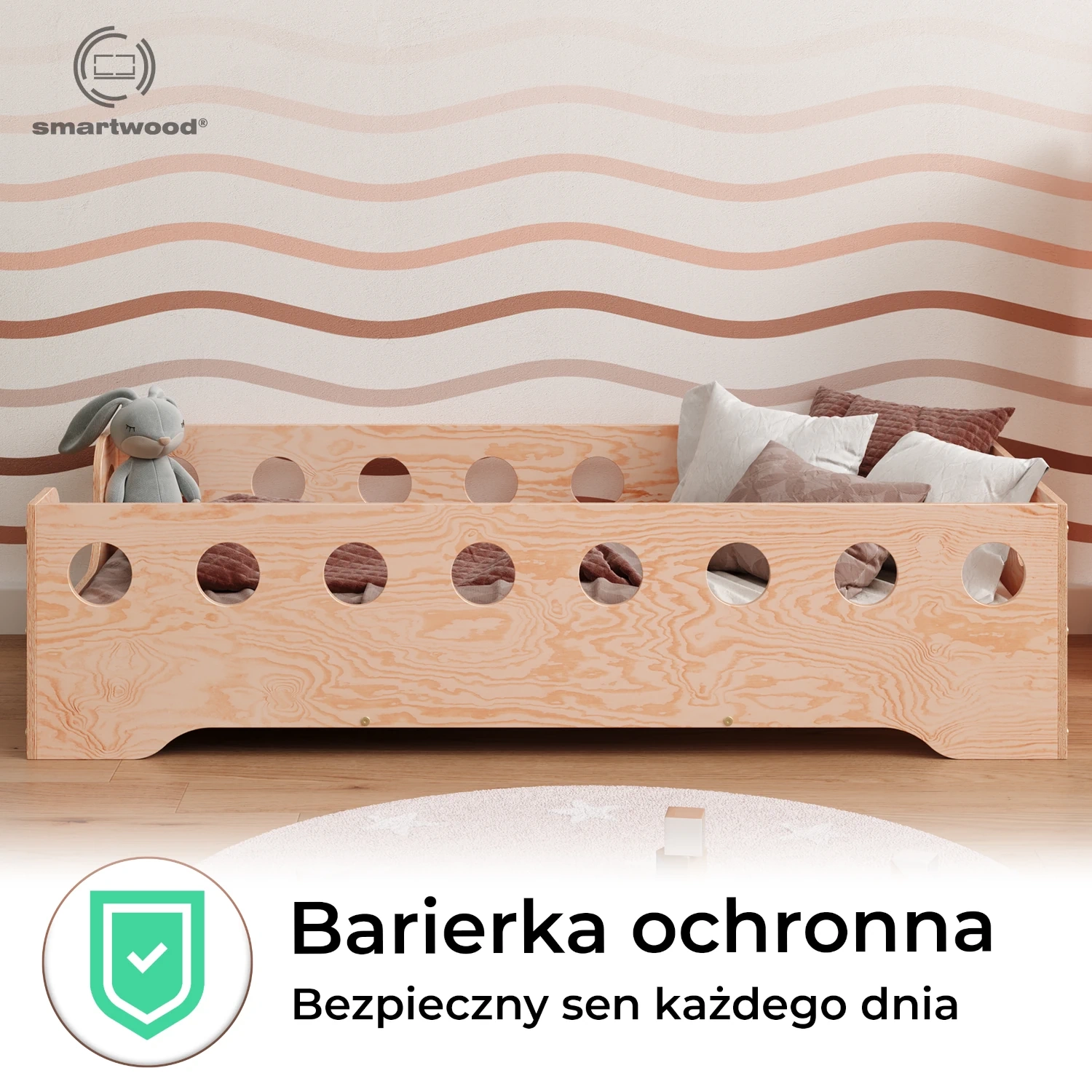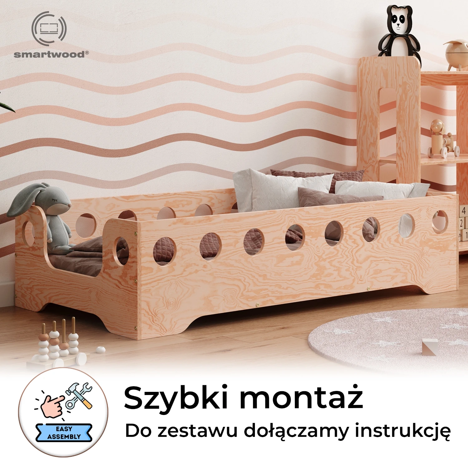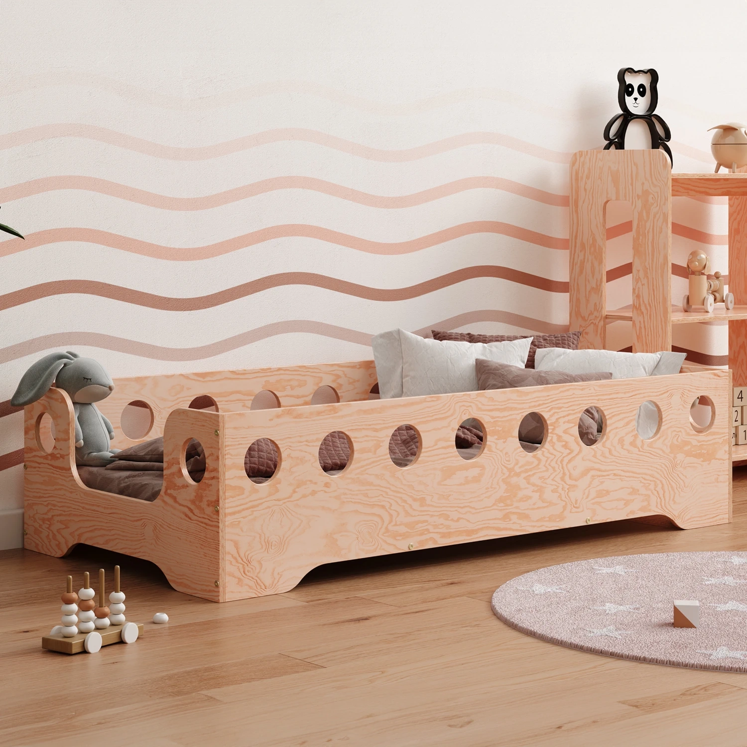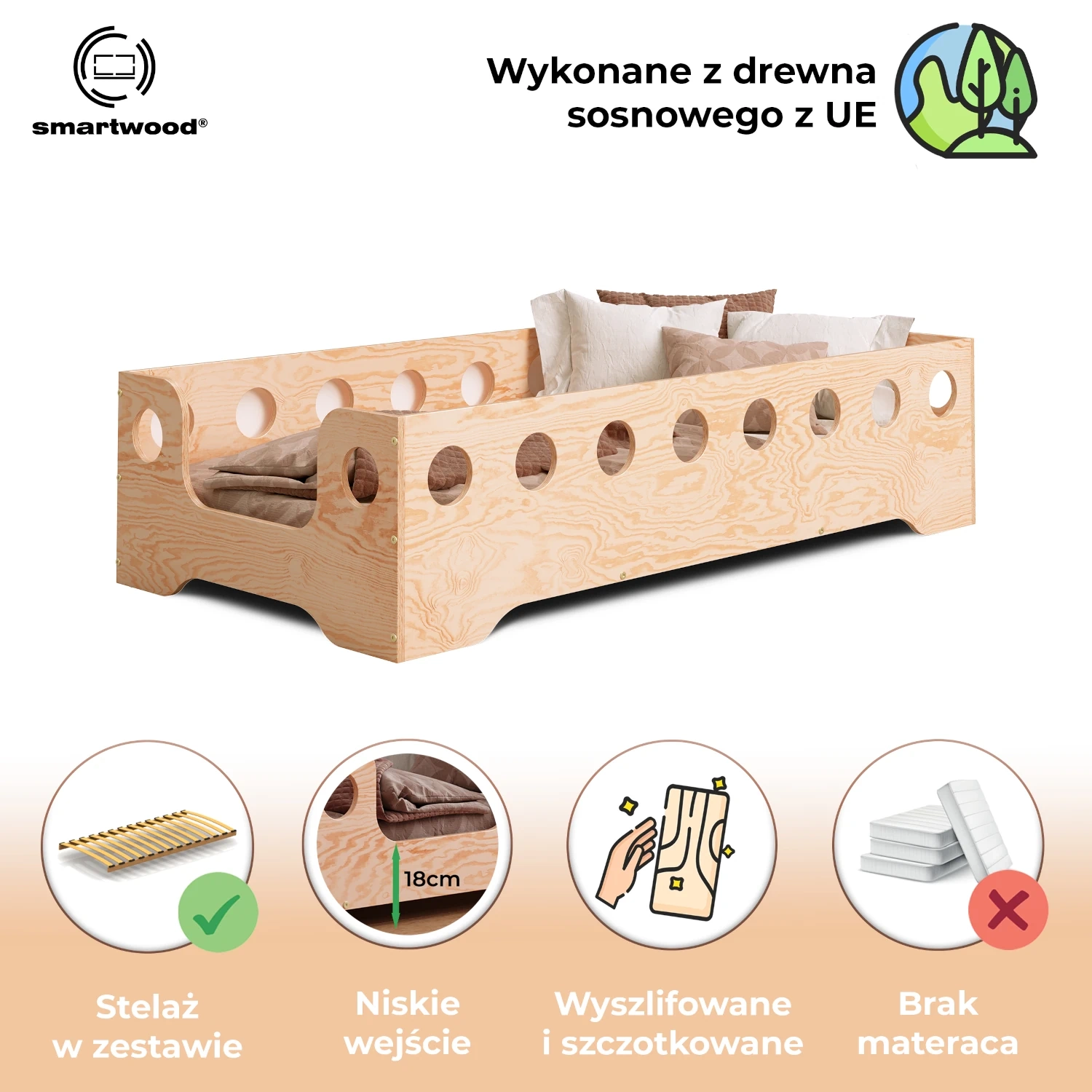 Łóżko pojedyncze dla dzieci z barierką i stelażem TILA 4 Montessori Drewniane